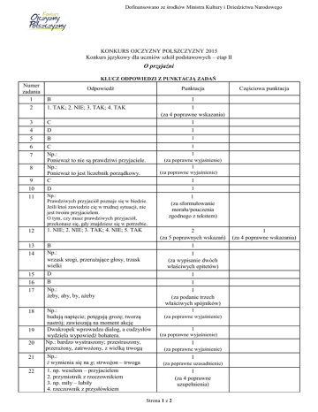 Dofinansowano ze środków Ministra Kultury i Dziedzictwa Narodowego KONKURS OJCZYZNY POLSZCZYZNY 2015 Konkurs językowy dla uczniów szkół podstawowych – etap II O przyjaźni KLUCZ ODPOWIEDZI Z PUNKTACJĄ ZADAŃ Numer zadania 1 Odpowiedź Punktacja B 1 2 1. TAK; 2. NIE; 3. TAK; 4. TAK 3 4 C D 1 (za 4 poprawne wskazania) 1 1 5 B 1 6 C Np.: Ponieważ to nie są prawdziwi przyjaciele. Np.: Ponieważ to jest liczebnik porządkowy. C 1 7 8 9 10 11 D 12 1. NIE; 2. NIE; 3. TAK; 4. NIE; 5. TAK 13 14 B Np.: wrzask srogi, przerażające głosy, trzask wielki D B Np.: żeby, aby, by, ażeby 15 16 17 18 19 20 21 22 1 (za poprawne wyjaśnienie) 1 (za poprawne wyjaśnienie) 1 1 Np.: Prawdziwych przyjaciół poznaje się w biedzie. Jeśli ktoś zawiedzie cię w trudnej sytuacji, nie jest twoim przyjacielem. O tym, czy masz prawdziwych przyjaciół, przekonasz się, gdy znajdziesz się w potrzebie. 1 (za sformułowanie morału/pouczenia zgodnego z tekstem) 2 (za 5 poprawnych wskazań) 1 1 (za wypisanie dwóch właściwych epitetów) 1 1 1 (za podanie trzech właściwych spójników) Np.: budują napięcie; potęgują grozę; tworzą nastrój; zawieszają na moment akcję Dwukropek wprowadza dialog, a cudzysłów wydziela wypowiedź bohatera. Np.: bardzo wystraszony; przestraszony, przerażony, zatrwożony, z wielką trwogą Np.: ż wymienia się na g; strwożon – trwoga Częściowa punktacja 1 (za poprawne wyjaśnienie) 1 (za poprawne wyjaśnienie) 1 (za poprawne wyjaśnienie) 1 (za poprawne uzasadnienie) 1. np. weselem – przyjacielem 2. przymiotnik z rzeczownikiem 3. np. miły – lubiły 4. rzeczownik z przysłówkiem 1 (za 4 poprawne uzupełnienia) Strona 1 z 2 1 (za 4 poprawne wskazania) Dofinansowano ze środków Ministra Kultury i Dziedzictwa Narodowego owca – owiec koń – koniowi cielę – cielęcia kozioł – kozłem (z kozłem) wół – wole (o, w, na wole) 23 24. 2 (za 5 poprawnych form) Błędy podkreślone Poprawki błędów 1. przyjacieli 1. przyjaciół 2. przeczytając 2. przeczytawszy; po przeczytaniu (czytając) 3. (przyjaciele) poszły 3. poszli 4. istne (egoiści) 4. istni 5. jego 5. go 1 (za 4 poprawne formy) Punktacja Częściowa punktacja 5 4, 3, 2, 1 (za wskazanie i poprawienie wszystkich błędów) (odpowiednio za właściwe wskazanie i poprawienie 4-3-2-1 błędów) Uwaga: uczeń może podkreślić tylko część wyrazu, np. istne albo całą frazę, np. istne egoiści Uwagi dla poprawiających zadanie 24.: za właściwe podkreślenie i poprawienie błędu przyznaje się 1 punkt; za poprawnie podkreślony, lecz niewłaściwie poprawiony błąd nie przyznaje się punktu; za każde zbędne podkreślenie lub błędną poprawkę odejmuje się 1 punkt; za całe zadanie uczeń nie może otrzymać mniej niż 0 punktów (czyli punktów ujemnych). Razem: 30 punktów Zadanie 25. Kryteria oceny wypracowania – 10 punktów a) Treść (0-4 punkty): 1. zrozumienie całości tematu, pomysł, 2. przebieg wydarzeń i sprawność narracji, 3. okoliczności wydarzeń i emocje bohaterów, 4. atrakcyjność i spójność fabuły, puenta. b) Forma (0-4 punkty): 1. kompozycja i akapitowanie, 2. styl i konwencja (tzw. forma wypowiedzi), 3. słownictwo i gramatyka, 4. ortografia i interpunkcja. c) wartości szczególne (0-2 punkty): 1. pomysłowość i oryginalność tekstu, 2. przejawy uzdolnień pisarskich. Uwagi dla poprawiających wypracowanie: w ocenie wypracowania punkty wystawia się osobno w pozycjach a), b), c) i sumuje się w ocenie całości; pod wypracowaniem należy konkretnie wskazać punktowane wartości; w czym i jak przejawiają się: pomysłowość, oryginalność, uzdolnienia. Strona 2 z 2