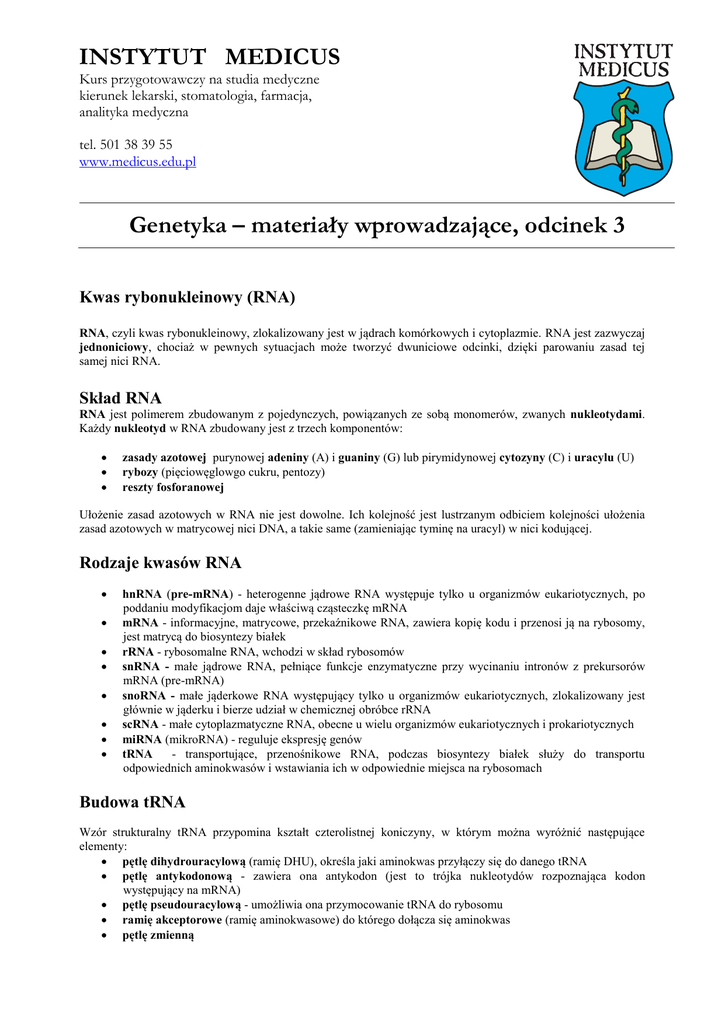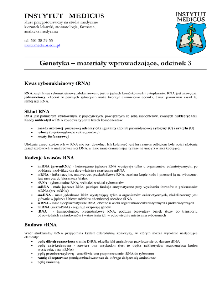 INSTYTUT MEDICUS Kurs przygotowawczy na studia medyczne kierunek lekarski, stomatologia, farmacja, analityka medyczna tel. 501 38 39 55 www.medicus.edu.pl Genetyka – materiały wprowadzające, odcinek 3 Kwas rybonukleinowy (RNA) RNA, czyli kwas rybonukleinowy, zlokalizowany jest w jądrach komórkowych i cytoplazmie. RNA jest zazwyczaj jednoniciowy, chociaż w pewnych sytuacjach może tworzyć dwuniciowe odcinki, dzięki parowaniu zasad tej samej nici RNA. Skład RNA RNA jest polimerem zbudowanym z pojedynczych, powiązanych ze sobą monomerów, zwanych nukleotydami. Każdy nukleotyd w RNA zbudowany jest z trzech komponentów: zasady azotowej purynowej adeniny (A) i guaniny (G) lub pirymidynowej cytozyny (C) i uracylu (U) rybozy (pięciowęglowgo cukru, pentozy) reszty fosforanowej Ułożenie zasad azotowych w RNA nie jest dowolne. Ich kolejność jest lustrzanym odbiciem kolejności ułożenia zasad azotowych w matrycowej nici DNA, a takie same (zamieniając tyminę na uracyl) w nici kodującej. Rodzaje kwasów RNA hnRNA (pre-mRNA) - heterogenne jądrowe RNA występuje tylko u organizmów eukariotycznych, po poddaniu modyfikacjom daje właściwą cząsteczkę mRNA mRNA - informacyjne, matrycowe, przekaźnikowe RNA, zawiera kopię kodu i przenosi ją na rybosomy, jest matrycą do biosyntezy białek rRNA - rybosomalne RNA, wchodzi w skład rybosomów snRNA - małe jądrowe RNA, pełniące funkcje enzymatyczne przy wycinaniu intronów z prekursorów mRNA (pre-mRNA) snoRNA - małe jąderkowe RNA występujący tylko u organizmów eukariotycznych, zlokalizowany jest głównie w jąderku i bierze udział w chemicznej obróbce rRNA scRNA - małe cytoplazmatyczne RNA, obecne u wielu organizmów eukariotycznych i prokariotycznych miRNA (mikroRNA) - reguluje ekspresję genów tRNA - transportujące, przenośnikowe RNA, podczas biosyntezy białek służy do transportu odpowiednich aminokwasów i wstawiania ich w odpowiednie miejsca na rybosomach Budowa tRNA Wzór strukturalny tRNA przypomina kształt czterolistnej koniczyny, w którym można wyróżnić następujące elementy: pętlę dihydrouracylową (ramię DHU), określa jaki aminokwas przyłączy się do danego tRNA pętlę antykodonową - zawiera ona antykodon (jest to trójka nukleotydów rozpoznająca kodon występujący na mRNA) pętlę pseudouracylową - umożliwia ona przymocowanie tRNA do rybosomu ramię akceptorowe (ramię aminokwasowe) do którego dołącza się aminokwas pętlę zmienną