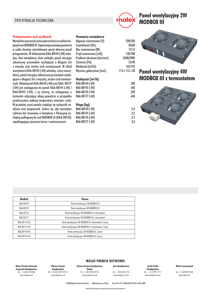 Panel wentylacyjny 2W MODBOX III SPECYFIKACJA TECHNICZNA Podsumowanie cech użytkowch Wentylatory przeznaczone są do montażu w szafach stojących serii MODBOX III. Zapewniają wymianę powietrza w szafie chroniąc zainstalowany sprzęt aktywny przed przegrzaniem. W skład panela RAA-00144 (-04) wchodzą: dwa wentylatory, dwie zaślepki, panel sterujący zakończony przewodem zasilającym o długości 2m z wtyczką oraz zestaw śrub montażowych. W skład wentylatora RAA-00145 (-04) wchodzą: cztery wentylatory, panel sterujący zakończony przewodem zasilającym o długości 2m z wtyczką, zestaw śrub montażowych. Skład paneli RAA-00176 (-04) oraz RAA- 00177 (-04) jest analogoczny do paneli RAA-00144 (-04) / RAA-00145 (-04), z tą różnicą, że wzbogacony o termostat włączający obieg powietrza w przypadku przekroczenia zadanej temperatury wewnątrz szafy. W przedniej części panela znajduje się wyłącznik zasilania oraz bezpiecznik. Zaleca się, aby wentylator sufitowy był stosowany w komplecie z filtracyjną zaślepką podłogową do szaf MODBOX III (RAA-00143), zapobiegającą zasysaniu kurzu i zanieczyszczeń. Parametry wentylatora Napięcie znamionowe [V]: Częstotliwość [Hz]: Moc znamionowa [W]: Prąd znamionowy [mA]: Prędkość obrotowa [obr/min]: Ciśnienie [Pa]: Wydajność [m3/h]: Wymiary gabarytowe [mm]: 220/230 50/60 15/14 120/100 2600/2900 75/90 162/192 112 x 112 x 38 Wydajność [m3/h]: RAA-00144 (-04) RAA-00145 (-04) RAA-00176 (-04) RAA-00177 (-04) 320 640 320 640 Waga [kg]: RAA-00144 (-04) RAA-00145 (-04) RAA-00176 (-04) RAA-00177 (-04) 2,4 3,2 2,5 3,3 Modkod Nazwa RAA-00144 Panel wentylacyjny 2W MODBOX III RAA-00145 Panel wentylacyjny 4W MODBOX III RAA-00176 Panel wentylacyjny 2W MODBOX III z termostatem RAA-00177 Panel wentylacyjny 4W MODBOX III z termostatem RAA-00176-04 Panel wentylacyjny 2W MODBOX III z termostatem, Czarny RAA-00177-04 Panel wentylacyjny 4W MODBOX III z termostatem, Czarny RAA-00144-04 Panel wentylacyjny 2W MODBOX III, Czarny RAA-00145-04 Panel wentylacyjny 4W MODBOX III, Czarny Panel wentylacyjny 4W MODBOX III z termostatem MOLEX PREMISE NETWORKS Molex Premise Networks Corporate Headquarters Tel. +1 603 324 0200 www.molexpn.com Western Europe Headquarters Tel +44 (0) 1489 572111 www.molexpn.co.uk Eastern Europe Headquarters Polska Tel. + 48 22 326 07 20 www.molexpn.com.pl ©2008 Molex Premise Networks Wydrukowano w Polsce Asia Headquarters Tel. + 852 2637 3111 www.molexpn.com.hk South Pacific Headquarters Tel. + 61 3 9971 7111 www.molexpn.com.au Form RAA-00144/RAA-00177-04# u413c v002 Molex Premise Networks zastrzega sobie prawo do zmiany parametrów Molex Incorporated Tel. +1 630 969 4550 www.molex.com