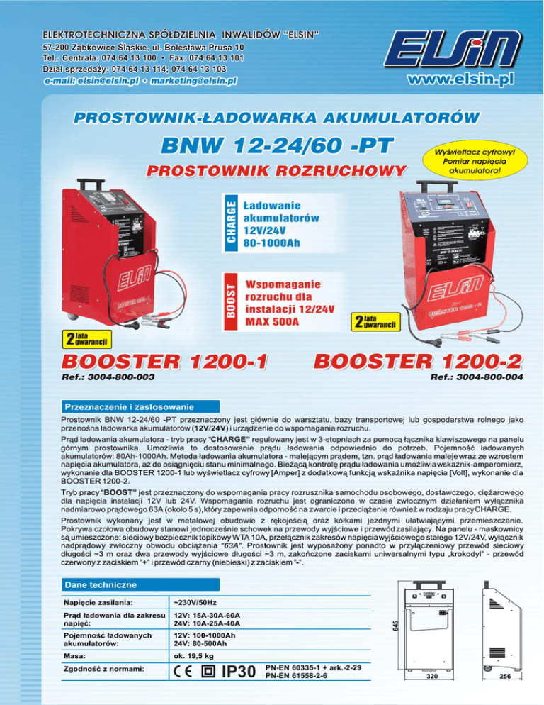 ELEKTROTECHNICZNA SPÓ£DZIELNIA INWALIDÓW “ELSIN” 57-200 Z¹bkowice Œl¹skie, ul. Boles³awa Prusa 10 Tel.: Centrala: 074 64 13 100 • Fax: 074 64 13 101 Dzia³ sprzeda¿y: 074 64 13 114; 074 64 13 103 e-mail: [email protected] • [email protected] PROSTOWNIK-£ADOWARKA AKUMULATORÓW BNW 12-24/60 -PT CHARGE £adowanie akumulatorów 12V/24V 80-1000Ah BOOST PROSTOWNIK ROZRUCHOWY Wspomaganie rozruchu dla instalacji 12/24V MAX 500A Wyœwietlacz cyfrowy! Pomiar napiêcia akumulatora! lata 2 gwarancji lata 2 gwarancji BOOSTER 1200-1 BOOSTER 1200-2 Ref.: 3004-800-003 Ref.: 3004-800-004 Przeznaczenie i zastosowanie Prostownik BNW 12-24/60 -PT przeznaczony jest g³ównie do warsztatu, bazy transportowej lub gospodarstwa rolnego jako 12V/24V) i urz¹dzenie do wspomagania rozruchu. przenoœna ³adowarka akumulatorów ((12V/24V) CHARGE” regulowany jest w 3-stopniach za pomoc¹ ³¹cznika klawiszowego na panelu Pr¹d ³adowania akumulatora - tryb pracy ““CHARGE” górnym prostownika. Umo¿liwia to dostosowanie pr¹du ³adowania odpowiednio do potrzeb. Pojemnoœæ ³adowanych akumulatorów: 80Ah-1000Ah. Metoda ³adowania akumulatora - malej¹cym pr¹dem, tzn. pr¹d ³adowania maleje wraz ze wzrostem napiêcia akumulatora, a¿ do osi¹gniêciu stanu minimalnego. Bie¿¹c¹ kontrolê pr¹du ³adowania umo¿liwia wskaŸnik-amperomierz, wykonanie dla BOOSTER 1200-1 lub wyœwietlacz cyfrowy [Amper] z dodatkow¹ funkcj¹ wskaŸnika napiêcia [Volt], [Volt], wykonanie dla BOOSTER 1200-2. Tryb pracy “BOOST” “BOOST” jest przeznaczony do wspomagania pracy rozrusznika samochodu osobowego, dostawczego, ciê¿arowego dla napiêcia instalacji 12V lub 24V. Wspomaganie rozruchu jest ograniczone w czasie zw³ocznym dzia³aniem wy³¹cznika nadmiarowo pr¹dowego 63A (oko³o 5 s), który zapewnia odpornoœæ na zwarcie i przeci¹¿enie równie¿ w rodzaju pracy CHARGE. Prostownik wykonany jest w metalowej obudowie z rêkojeœci¹ oraz kó³kami jezdnymi u³atwiaj¹cymi przemieszczanie. Pokrywa czo³owa obudowy stanowi jednoczeœnie schowek na przewody wyjœciowe i przewód zasilaj¹cy. Na panelu - maskownicy s¹ umieszczone: sieciowy bezpiecznik topikowy WTA 10A, prze³¹cznik zakresów napiêcia wyjœciowego sta³ego 12V/24V, wy³¹cznik 63A”. Prostownik jest wyposa¿ony ponadto w przy³¹czeniowy przewód sieciowy nadpr¹dowy zw³oczny obwodu obci¹¿enia ““63A”. d³ugoœci ~3 m oraz dwa przewody wyjœciowe d³ugoœci ~3 m, zakoñczone zaciskami uniwersalnymi typu „krokodyl” - przewód +” i przewód czarny (niebieski) z zaciskiem ”-”. czerwony z zaciskiem ””+” ”-”. Napiêcie zasilania: ~230V/50Hz Pr¹d ³adowania dla zakresu napiêæ: 12V: 15A-30A-60A 24V: 10A-25A-40A Pojemnoœæ ³adowanych akumulatorów: 12V: 100-1000Ah 24V: 80-500Ah Masa: ok. 19,5 kg Zgodnoœæ z normami: IP30 645 Dane techniczne PN-EN 60335-1 + ark.-2-29 PN-EN 61558-2-6 320 256
