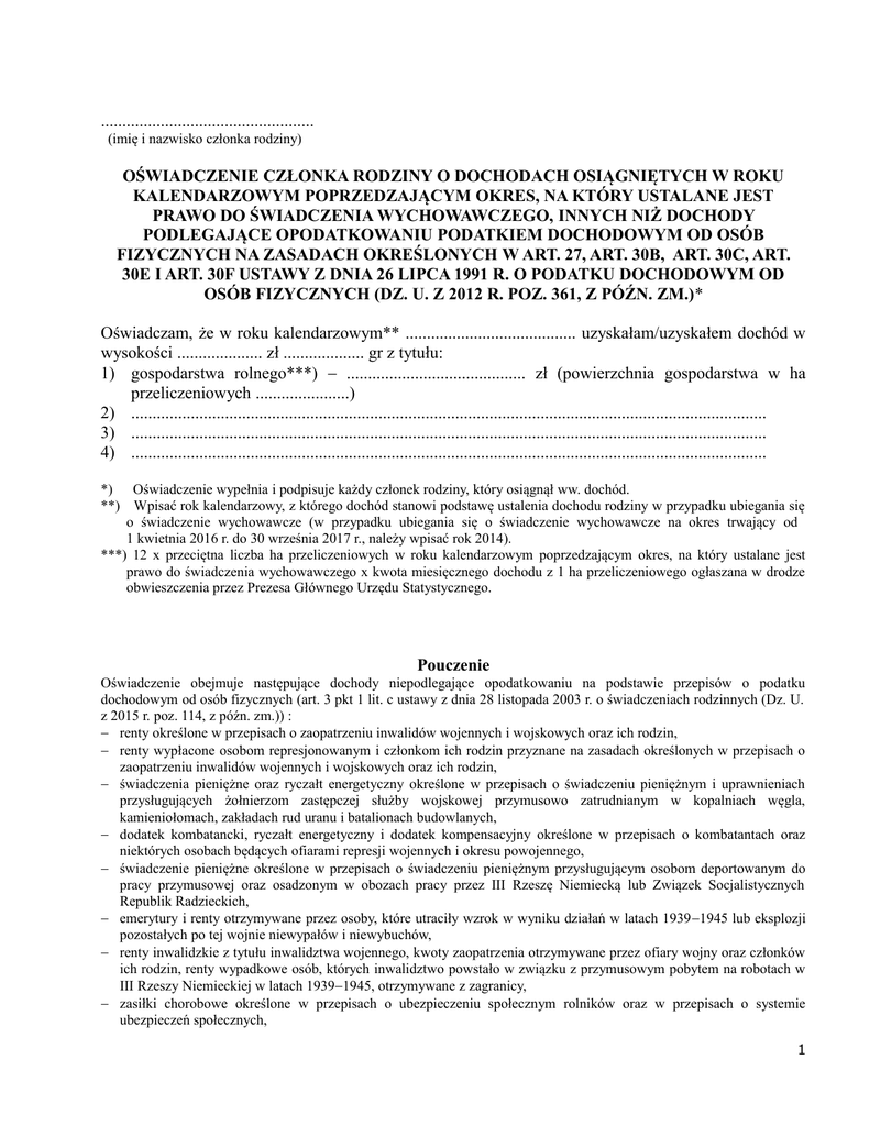 .................................................. (imię i nazwisko członka rodziny) OŚWIADCZENIE CZŁONKA RODZINY O DOCHODACH OSIĄGNIĘTYCH W ROKU KALENDARZOWYM POPRZEDZAJĄCYM OKRES, NA KTÓRY USTALANE JEST PRAWO DO ŚWIADCZENIA WYCHOWAWCZEGO, INNYCH NIŻ DOCHODY PODLEGAJĄCE OPODATKOWANIU PODATKIEM DOCHODOWYM OD OSÓB FIZYCZNYCH NA ZASADACH OKREŚLONYCH W ART. 27, ART. 30B, ART. 30C, ART. 30E I ART. 30F USTAWY Z DNIA 26 LIPCA 1991 R. O PODATKU DOCHODOWYM OD OSÓB FIZYCZNYCH (DZ. U. Z 2012 R. POZ. 361, Z PÓŹN. ZM.)* Oświadczam, że w roku kalendarzowym** ........................................ uzyskałam/uzyskałem dochód w wysokości .................... zł ................... gr z tytułu: 1) gospodarstwa rolnego***) .......................................... zł (powierzchnia gospodarstwa w ha przeliczeniowych ......................) 2) ..................................................................................................................................................... 3) ..................................................................................................................................................... 4) ..................................................................................................................................................... *) Oświadczenie wypełnia i podpisuje każdy członek rodziny, który osiągnął ww. dochód. **) Wpisać rok kalendarzowy, z którego dochód stanowi podstawę ustalenia dochodu rodziny w przypadku ubiegania się o świadczenie wychowawcze (w przypadku ubiegania się o świadczenie wychowawcze na okres trwający od 1 kwietnia 2016 r. do 30 września 2017 r., należy wpisać rok 2014). ***) 12 x przeciętna liczba ha przeliczeniowych w roku kalendarzowym poprzedzającym okres, na który ustalane jest prawo do świadczenia wychowawczego x kwota miesięcznego dochodu z 1 ha przeliczeniowego ogłaszana w drodze obwieszczenia przez Prezesa Głównego Urzędu Statystycznego. Pouczenie Oświadczenie obejmuje następujące dochody niepodlegające opodatkowaniu na podstawie przepisów o podatku dochodowym od osób fizycznych (art. 3 pkt 1 lit. c ustawy z dnia 28 listopada 2003 r. o świadczeniach rodzinnych (Dz. U. z 2015 r. poz. 114, z późn. zm.)) : renty określone w przepisach o zaopatrzeniu inwalidów wojennych i wojskowych oraz ich rodzin, renty wypłacone osobom represjonowanym i członkom ich rodzin przyznane na zasadach określonych w przepisach o zaopatrzeniu inwalidów wojennych i wojskowych oraz ich rodzin, świadczenia pieniężne oraz ryczałt energetyczny określone w przepisach o świadczeniu pieniężnym i uprawnieniach przysługujących żołnierzom zastępczej służby wojskowej przymusowo zatrudnianym w kopalniach węgla, kamieniołomach, zakładach rud uranu i batalionach budowlanych, dodatek kombatancki, ryczałt energetyczny i dodatek kompensacyjny określone w przepisach o kombatantach oraz niektórych osobach będących ofiarami represji wojennych i okresu powojennego, świadczenie pieniężne określone w przepisach o świadczeniu pieniężnym przysługującym osobom deportowanym do pracy przymusowej oraz osadzonym w obozach pracy przez III Rzeszę Niemiecką lub Związek Socjalistycznych Republik Radzieckich, emerytury i renty otrzymywane przez osoby, które utraciły wzrok w wyniku działań w latach 19391945 lub eksplozji pozostałych po tej wojnie niewypałów i niewybuchów, renty inwalidzkie z tytułu inwalidztwa wojennego, kwoty zaopatrzenia otrzymywane przez ofiary wojny oraz członków ich rodzin, renty wypadkowe osób, których inwalidztwo powstało w związku z przymusowym pobytem na robotach w III Rzeszy Niemieckiej w latach 19391945, otrzymywane z zagranicy, zasiłki chorobowe określone w przepisach o ubezpieczeniu społecznym rolników oraz w przepisach o systemie ubezpieczeń społecznych, 1 środki bezzwrotnej pomocy zagranicznej otrzymywane od rządów państw obcych, organizacji międzynarodowych lub międzynarodowych instytucji finansowych pochodzące ze środków bezzwrotnej pomocy przyznanych na podstawie jednostronnej deklaracji lub umów zawartych z tymi państwami, organizacjami lub instytucjami przez Radę Ministrów, właściwego ministra lub agencje rządowe, w tym również w przypadkach, gdy przekazanie tych środków jest dokonywane za pośrednictwem podmiotu upoważnionego do rozdzielania środków bezzwrotnej pomocy zagranicznej na rzecz podmiotów, którym ma służyć ta pomoc, należności ze stosunku pracy lub z tytułu stypendium osób fizycznych mających miejsce zamieszkania na terytorium Rzeczypospolitej Polskiej, przebywających czasowo za granicą w wysokości odpowiadającej równowartości diet z tytułu podróży służbowej poza granicami kraju ustalonych dla pracowników zatrudnionych w państwowych lub samorządowych jednostkach sfery budżetowej na podstawie ustawy z dnia 26 czerwca 1974 r. – Kodeks pracy (Dz. U. z 2014 r. poz. 1502, z późn. zm.), należności pieniężne wypłacone policjantom, żołnierzom, celnikom i pracownikom jednostek wojskowych i jednostek policyjnych użytych poza granicami państwa w celu udziału w konflikcie zbrojnym lub wzmocnienia sił państwa albo państw sojuszniczych, misji pokojowej, akcji zapobieżenia aktom terroryzmu lub ich skutkom, a także należności pieniężne wypłacone żołnierzom, policjantom, celnikom i pracownikom pełniącym funkcje obserwatorów w misjach pokojowych organizacji międzynarodowych i sił wielonarodowych, należności pieniężne ze stosunku służbowego otrzymywane w czasie służby kandydackiej przez funkcjonariuszy Policji, Państwowej Straży Pożarnej, Straży Granicznej, Biura Ochrony Rządu, obliczone za okres, w którym osoby te uzyskały dochód, dochody członków rolniczych spółdzielni produkcyjnych z tytułu członkostwa w rolniczej spółdzielni produkcyjnej, pomniejszone o składki na ubezpieczenia społeczne, alimenty na rzecz dzieci, s