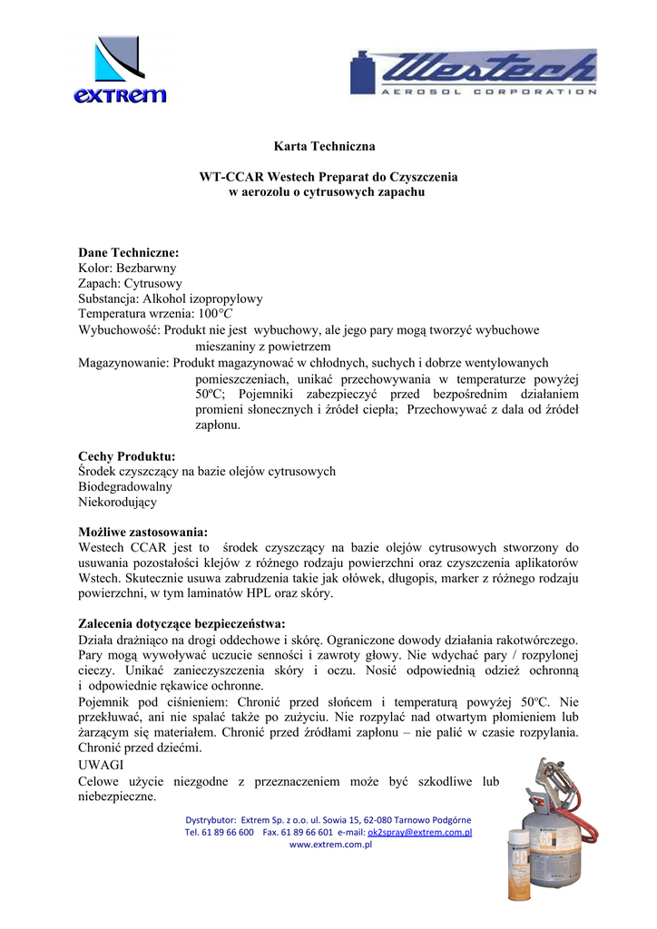 Karta Techniczna WT-CCAR Westech Preparat do Czyszczenia w aerozolu o cytrusowych zapachu Dane Techniczne: Kolor: Bezbarwny Zapach: Cytrusowy Substancja: Alkohol izopropylowy Temperatura wrzenia: 100°C Wybuchowość: Produkt nie jest wybuchowy, ale jego pary mogą tworzyć wybuchowe mieszaniny z powietrzem Magazynowanie: Produkt magazynować w chłodnych, suchych i dobrze wentylowanych pomieszczeniach, unikać przechowywania w temperaturze powyżej 50ºC; Pojemniki zabezpieczyć przed bezpośrednim działaniem promieni słonecznych i źródeł ciepła; Przechowywać z dala od źródeł zapłonu. Cechy Produktu: Środek czyszczący na bazie olejów cytrusowych Biodegradowalny Niekorodujący Możliwe zastosowania: Westech CCAR jest to środek czyszczący na bazie olejów cytrusowych stworzony do usuwania pozostałości klejów z różnego rodzaju powierzchni oraz czyszczenia aplikatorów Wstech. Skutecznie usuwa zabrudzenia takie jak ołówek, długopis, marker z różnego rodzaju powierzchni, w tym laminatów HPL oraz skóry. Zalecenia dotyczące bezpieczeństwa: Działa drażniąco na drogi oddechowe i skórę. Ograniczone dowody działania rakotwórczego. Pary mogą wywoływać uczucie senności i zawroty głowy. Nie wdychać pary / rozpylonej cieczy. Unikać zanieczyszczenia skóry i oczu. Nosić odpowiednią odzież ochronną i odpowiednie rękawice ochronne. Pojemnik pod ciśnieniem: Chronić przed słońcem i temperaturą powyżej 50oC. Nie przekłuwać, ani nie spalać także po zużyciu. Nie rozpylać nad otwartym płomieniem lub żarzącym się materiałem. Chronić przed źródłami zapłonu – nie palić w czasie rozpylania. Chronić przed dziećmi. UWAGI Celowe użycie niezgodne z przeznaczeniem może być szkodliwe lub niebezpieczne. Dystrybutor: Extrem Sp. z o.o. ul. Sowia 15, 62-080 Tarnowo Podgórne Tel. 61 89 66 600 Fax. 61 89 66 601 e-mail: [email protected] www.extrem.com.pl