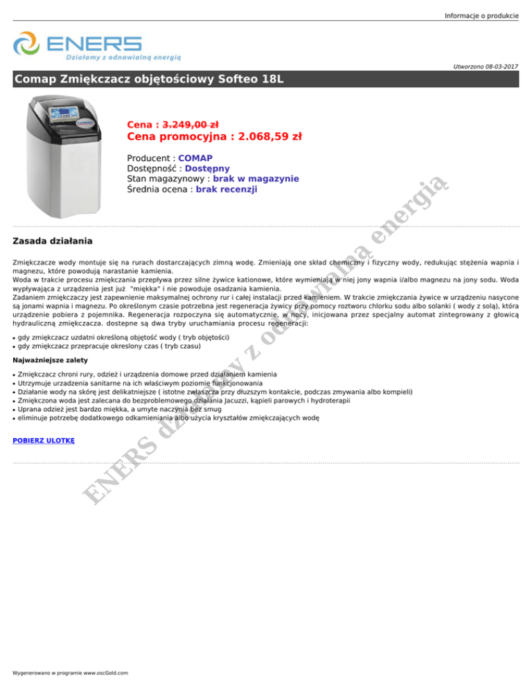Informacje o produkcie Utworzono 08-03-2017 Comap Zmiękczacz objętościowy Softeo 18L Cena : 3.249,00 zł Cena promocyjna : 2.068,59 zł en er gi ą Producent : COMAP Dostępność : Dostępny Stan magazynowy : brak w magazynie Średnia ocena : brak recenzji ną Zasada działania ● gdy zmiękczacz uzdatni określoną objętość wody ( tryb objętości) gdy zmiękczacz przepracuje okreslony czas ( tryb czasu) z ● ● ● ● ia ła m ● Zmiękczacz chroni rury, odzież i urządzenia domowe przed działaniem kamienia Utrzymuje urzadzenia sanitarne na ich właściwym poziomie funkcjonowania Działanie wody na skórę jest delikatniejsze ( istotne zwłaszcza przy dłuzszym kontakcie, podczas zmywania albo kompieli) Zmiękczona woda jest zalecana do bezproblemowego działania Jacuzzi, kąpieli parowych i hydroterapii Uprana odzież jest bardzo miękka, a umyte naczynia bez smug eliminuje potrzebę dodatkowego odkamieniania albo użycia kryształów zmiękczających wodę dz ● y Najważniejsze zalety ● od na w ia l Zmiękczacze wody montuje się na rurach dostarczających zimną wodę. Zmieniają one skład chemiczny i fizyczny wody, redukując stężenia wapnia i magnezu, które powodują narastanie kamienia. Woda w trakcie procesu zmiękczania przepływa przez silne żywice kationowe, które wymieniają w niej jony wapnia i/albo magnezu na jony sodu. Woda wypływająca z urządzenia jest już "miękka" i nie powoduje osadzania kamienia. Zadaniem zmiękczaczy jest zapewnienie maksymalnej ochrony rur i całej instalacji przed kamieniem. W trakcie zmiękczania żywice w urządzeniu nasycone są jonami wapnia i magnezu. Po określonym czasie potrzebna jest regeneracja żywicy przy pomocy roztworu chlorku sodu albo solanki ( wody z solą), która urządzenie pobiera z pojemnika. Regeneracja rozpoczyna się automatycznie, w nocy, inicjowana przez specjalny automat zintegrowany z głowicą hydrauliczną zmiękczacza. dostepne są dwa tryby uruchamiania procesu regeneracji: EN ER S POBIERZ ULOTKĘ Wygenerowano w programie www.oscGold.com