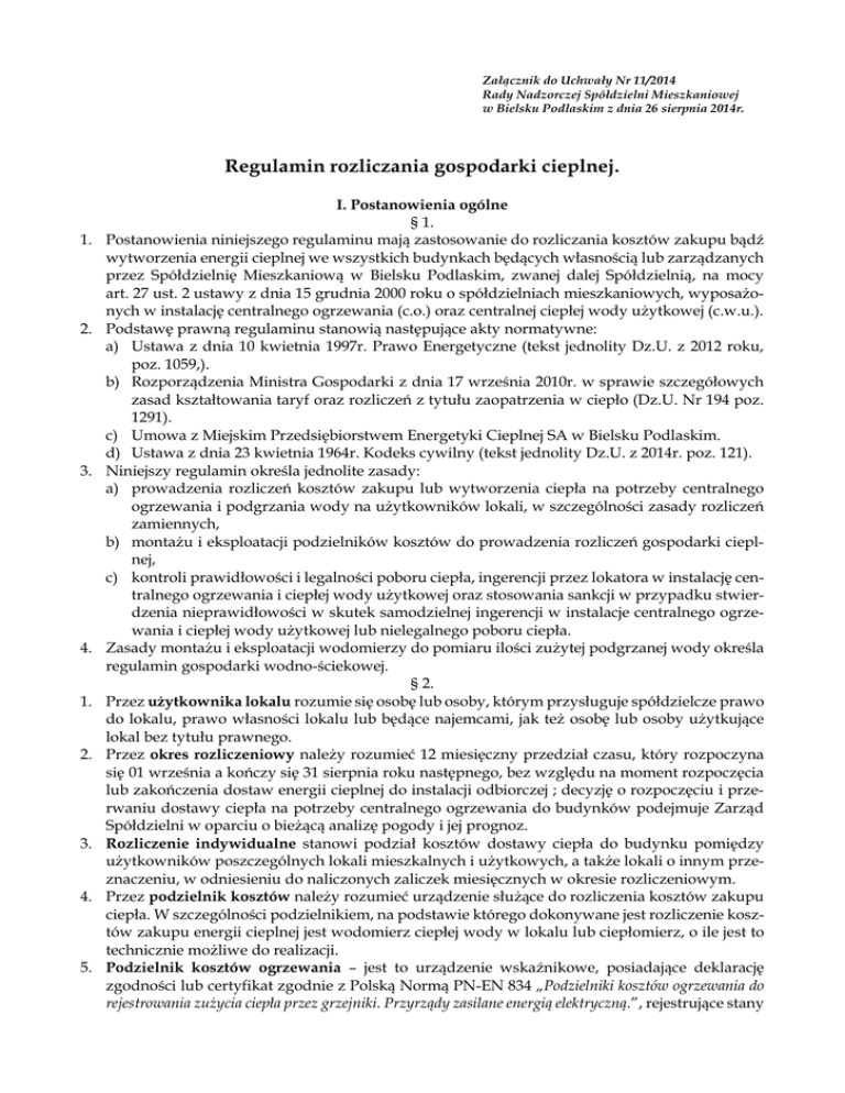 Załącznik do Uchwały Nr 11/2014 Rady Nadzorczej Spółdzielni Mieszkaniowej w Bielsku Podlaskim z dnia 26 sierpnia 2014r. Regulamin rozliczania gospodarki cieplnej. 1. 2. 3. 4. 1. 2. 3. 4. 5. I. Postanowienia ogólne § 1. Postanowienia niniejszego regulaminu mają zastosowanie do rozliczania kosztów zakupu bądź wytworzenia energii cieplnej we wszystkich budynkach będących własnością lub zarządzanych przez Spółdzielnię Mieszkaniową w Bielsku Podlaskim, zwanej dalej Spółdzielnią, na mocy art. 27 ust. 2 ustawy z dnia 15 grudnia 2000 roku o spółdzielniach mieszkaniowych, wyposażonych w instalację centralnego ogrzewania (c.o.) oraz centralnej ciepłej wody użytkowej (c.w.u.). Podstawę prawną regulaminu stanowią następujące akty normatywne: a) Ustawa z dnia 10 kwietnia 1997r. Prawo Energetyczne (tekst jednolity Dz.U. z 2012 roku, poz. 1059,). b) Rozporządzenia Ministra Gospodarki z dnia 17 września 2010r. w sprawie szczegółowych zasad kształtowania taryf oraz rozliczeń z tytułu zaopatrzenia w ciepło (Dz.U. Nr 194 poz. 1291). c) Umowa z Miejskim Przedsiębiorstwem Energetyki Cieplnej SA w Bielsku Podlaskim. d) Ustawa z dnia 23 kwietnia 1964r. Kodeks cywilny (tekst jednolity Dz.U. z 2014r. poz. 121). Niniejszy regulamin określa jednolite zasady: a) prowadzenia rozliczeń kosztów zakupu lub wytworzenia ciepła na potrzeby centralnego ogrzewania i podgrzania wody na użytkowników lokali, w szczególności zasady rozliczeń zamiennych, b) montażu i eksploatacji podzielników kosztów do prowadzenia rozliczeń gospodarki cieplnej, c) kontroli prawidłowości i legalności poboru ciepła, ingerencji przez lokatora w instalację centralnego ogrzewania i ciepłej wody użytkowej oraz stosowania sankcji w przypadku stwierdzenia nieprawidłowości w skutek samodzielnej ingerencji w instalacje centralnego ogrzewania i ciepłej wody użytkowej lub nielegalnego poboru ciepła. Zasady montażu i eksploatacji wodomierzy do pomiaru ilości zużytej podgrzanej wody określa regulamin gospodarki wodno-ściekowej. § 2. Przez użytkownika lokalu rozumie się osobę lub osoby, którym przysługuje spółdzielcze prawo do lokalu, prawo własności lokalu lub będące najemcami, jak też osobę lub osoby użytkujące lokal bez tytułu prawnego. Przez okres rozliczeniowy należy rozumieć 12 miesięczny przedział czasu, który rozpoczyna się 01 września a kończy się 31 sierpnia roku następnego, bez względu na moment rozpoczęcia lub zakończenia dostaw energii cieplnej do instalacji odbiorczej ; decyzję o rozpoczęciu i przerwaniu dostawy ciepła na potrzeby centralnego ogrzewania do budynków podejmuje Zarząd Spółdzielni w oparciu o bieżącą analizę pogody i jej prognoz. Rozliczenie indywidualne stanowi podział kosztów dostawy ciepła do budynku pomiędzy użytkowników poszczególnych lokali mieszkalnych i użytkowych, a także lokali o innym przeznaczeniu, w odniesieniu do naliczonych zaliczek miesięcznych w okresie rozliczeniowym. Przez podzielnik kosztów należy rozumieć urządzenie służące do rozliczenia kosztów zakupu ciepła. W szczególności podzielnikiem, na podstawie którego dokonywane jest rozliczenie kosztów zakupu energii cieplnej jest wodomierz ciepłej wody w lokalu lub ciepłomierz, o ile jest to technicznie możliwe do realizacji. Podzielnik kosztów ogrzewania – jest to urządzenie wskaźnikowe, posiadające deklarację zgodności lub certyfikat zgodnie z Polską Normą PN-EN 834 „Podzielniki kosztów ogrzewania do rejestrowania zużycia ciepła przez grzejniki. Przyrządy zasilane energią elektryczną.”, rejestrujące stany 6. 7. 8. 9. 10. 11. 12. 13. 14. cieplne grzejnika w trakcie okresu rozliczeniowego. Wskazania te, traktowane jako bezwymiarowe, są wykorzystywane jako podstawa do ustalania względnych udziałów poszczególnych lokali w kosztach ogrzewania budynku, w szczególności do ustalania udziału kosztów ogrzewania niezależnych od zużycia indywidualnego w lokalu, tj. kosztów ogrzewania grzejnikami łazienkowymi i pionami świecowymi, a także zysków ciepła od niezaizolowanych pionów centralnego ogrzewania do tych pomieszczeń, w których zostały zamontowane. Podzielniki kosztów nie są urządzeniami pomiarowymi, lecz służą do podziału kosztów w rozliczeniach, są wprowadzone do stosowania na zasadach i w trybie określonym w przepisach o systemie oceny zgodności. Współczynnik wyrównawczy – jest to względna wartość liczbowa uwzględniająca straty lub uzyski ciepła związane z położeniem lokalu w bryle budynku oraz położeniem w stosunku do przylegających lokali i budynków. Wartość współczynnika wyrównawczego dla danego lokalu jest równa stosunkowi najniższego projektowego obciążenia cieplnego pomieszczeń przypadającego na 1 m3 ogrzewanej kubatury lokalu, który wystąpił w budynku , do wartości tego obciążenia obliczonego dla każdego lokalu w tym budynku. Projektowe obciążenie cieplne pomieszczeń ustalane jest zgodnie z obowiązującymi normami na podstawie dokumentacji technicznej odzwierciadlającej aktualną charakterystykę energetyczną budynku oraz innych niezbędnych czynników mających wpływ na wielkość zapotrzebowania na ciepło dla lokali (w szczególności tak zwanych mostków termicznych). Zamówiona moc cieplna – jest to największa moc cieplna, jaka w ciągu roku występuje w danym budynku dla warunków obliczeniowych, która zgodnie z warunkami technicznymi oraz wymaganiami technologicznymi dla tego budynku jest niezbędna do zapewnienia pokrycia strat ciepła w celu utrzymania temperatury normatywnej i wymiany powietrza w pomieszczeniu oraz prawidłowej pracy innych urządzeń i instalacji z uwzględnieniem modernizacji instalacji centralnego ogrzewania, instalacji ciepłej wody użytkowej i obudowy cieplnej budynku (ociepleniem). Temperatura obliczeniowa w pomieszczeniu – temperatura powietrza w pomieszczeniu, którą należy przyjmować p