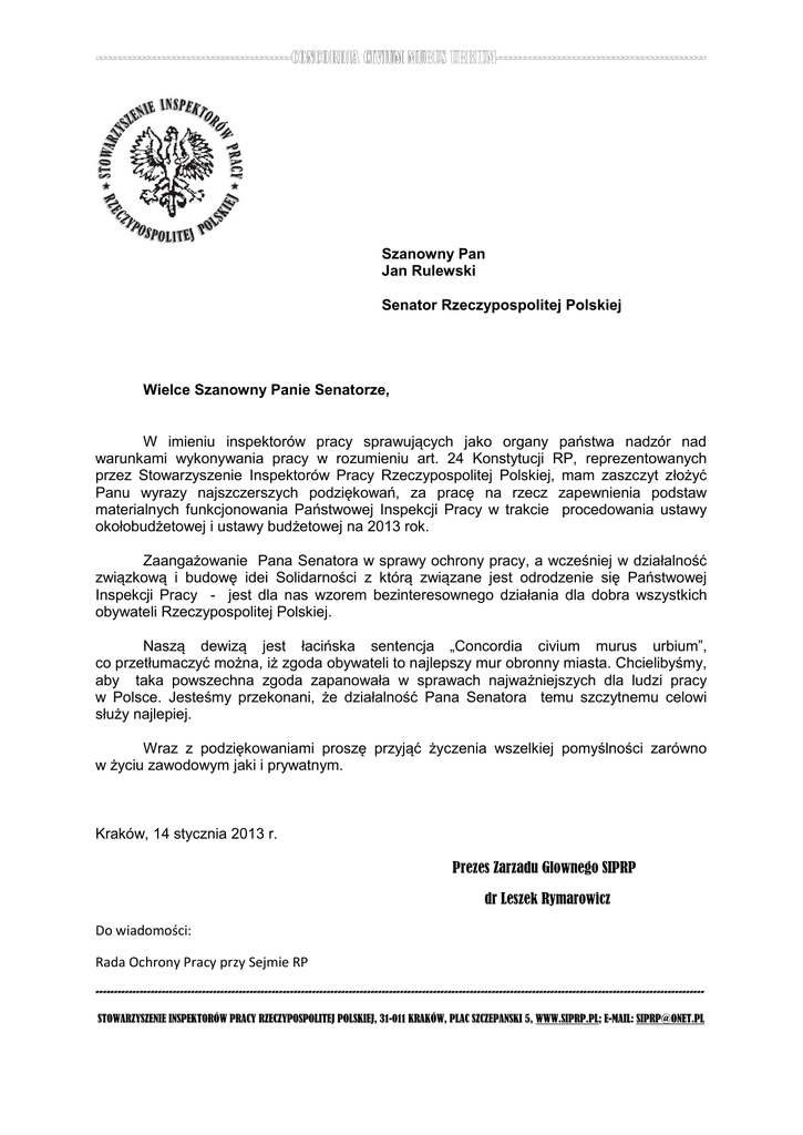 Szanowny Pan Jan Rulewski Senator Rzeczypospolitej Polskiej Wielce Szanowny Panie Senatorze, W imieniu inspektorów pracy sprawujących jako organy państwa nadzór nad warunkami wykonywania pracy w rozumieniu art. 24 Konstytucji RP, reprezentowanych przez Stowarzyszenie Inspektorów Pracy Rzeczypospolitej Polskiej, mam zaszczyt złożyć Panu wyrazy najszczerszych podziękowań, za pracę na rzecz zapewnienia podstaw materialnych funkcjonowania Państwowej Inspekcji Pracy w trakcie procedowania ustawy okołobudżetowej i ustawy budżetowej na 2013 rok. Zaangażowanie Pana Senatora w sprawy ochrony pracy, a wcześniej w działalność związkową i budowę idei Solidarności z którą związane jest odrodzenie się Państwowej Inspekcji Pracy - jest dla nas wzorem bezinteresownego działania dla dobra wszystkich obywateli Rzeczypospolitej Polskiej. Naszą dewizą jest łacińska sentencja „Concordia civium murus urbium”, co przetłumaczyć można, iż zgoda obywateli to najlepszy mur obronny miasta. Chcielibyśmy, aby taka powszechna zgoda zapanowała w sprawach najważniejszych dla ludzi pracy w Polsce. Jesteśmy przekonani, że działalność Pana Senatora temu szczytnemu celowi służy najlepiej. Wraz z podziękowaniami proszę przyjąć życzenia wszelkiej pomyślności zarówno w życiu zawodowym jaki i prywatnym. Kraków, 14 stycznia 2013 r. Prezes Zarzadu Glownego SIPRP dr Leszek Rymarowicz Do wiadomości: Rada Ochrony Pracy przy Sejmie RP ---------------------------------------------------------------------------------------------------------------------------------------------------------------------STOWARZYSZENIE INSPEKTORÓW PRACY RZECZYPOSPOLITEJ POLSKIEJ, 31-011 KRAKÓW, PLAC SZCZEPANSKI 5, WWW.SIPRP.PL; E-MAIL: [email protected]