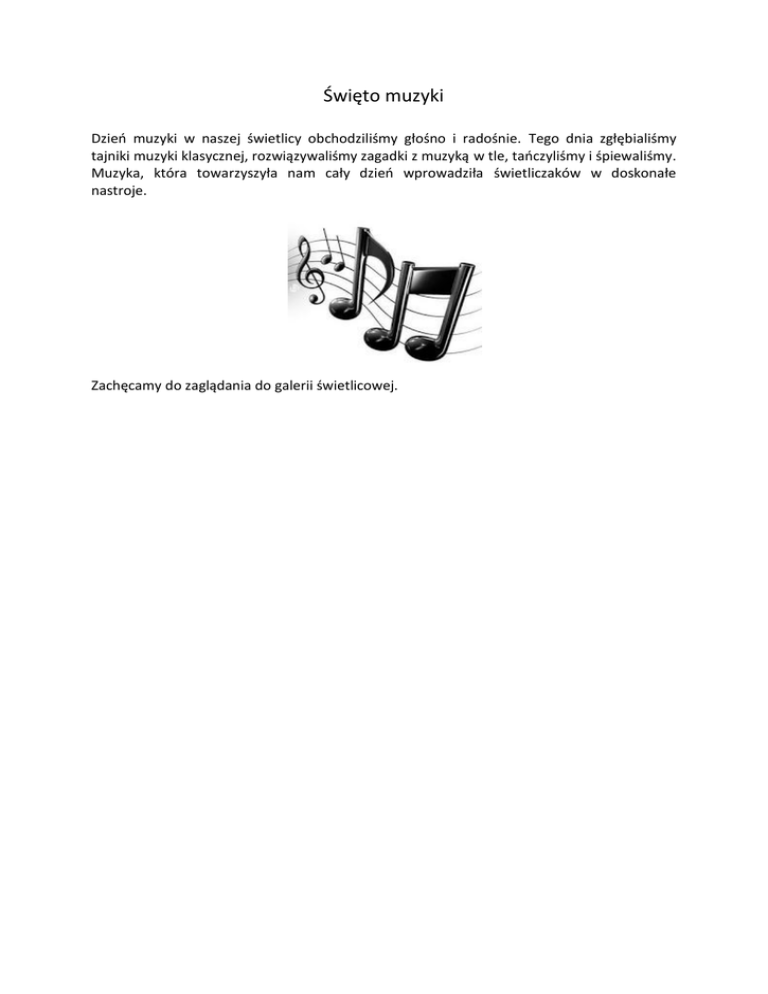 Święto muzyki Dzień muzyki w naszej świetlicy obchodziliśmy głośno i radośnie. Tego dnia zgłębialiśmy tajniki muzyki klasycznej, rozwiązywaliśmy zagadki z muzyką w tle, tańczyliśmy i śpiewaliśmy. Muzyka, która towarzyszyła nam cały dzień wprowadziła świetliczaków w doskonałe nastroje. Zachęcamy do zaglądania do galerii świetlicowej.