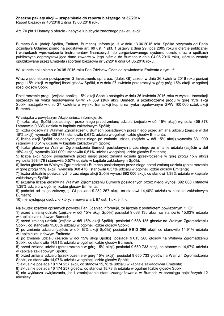 Znaczne pakiety akcji – uzupełnienie do raportu bieżącego nr 32/2016 Raport bieżący nr 40/2016 z dnia 13.06.2016 roku Art. 70 pkt 1 Ustawy o ofercie - nabycie lub zbycie znacznego pakietu akcji Bumech S.A. (dalej: Spółka, Emitent, Bumech) informuje, iż w dniu 13.06.2016 roku Spółka otrzymała od Pana Zdzisława Gdaniec pismo na podstawie art. 69 ust. 1 pkt. 1 ustawy z dnia 29 lipca 2005 roku o ofercie publicznej i warunkach wprowadzania instrumentów finansowych do zorganizowanego systemu obrotu oraz o spółkach publicznych doprecyzowujące dane zawarte w jego piśmie do Bumech z dnia 04.05.2016 roku, które to zostały opublikowane przez Emitenta raportem bieżącym nr 32/2016 dnia 04.05.2016 roku. W uzupełnieniu pisma z 04.05.2016 roku Pan Zdzisław Gdaniec zawiadamia Emitenta o tym, iż: Wraz z podmiotem powiązanym G Investments sp. z o.o. (dalej: GI) zszedł w dniu 26 kwietnia 2016 roku poniżej progu 15% akcji w ogólnej ilości głosów Spółki, a w dniu 27 kwietnia przekroczył w górę próg 15% akcji w ogólnej ilości głosów Spółki. Przekroczenie progu (zejście poniżej 15% akcji Spółki) nastąpiło w dniu 26 kwietnia 2016 roku w wyniku transakcji sprzedaży na rynku regulowanym GPW 74 869 sztuk akcji Bumech, a przekroczenie progu w górę 15% akcji Spółki nastąpiło w dniu 27 kwietnia w wyniku transakcji kupna na rynku regulowanym GPW 100 000 sztuk akcji Bumech. W związku z powyższym Akcjonariusz informuje, że: 1) liczba akcji Spółki posiadanych przez niego przed zmianą udziału (zejście w dół 15% akcji) wynosiła 405 878 i stanowiła 0,63% udziału w kapitale zakładowym Spółki; 2) liczba głosów na Walnym Zgromadzeniu Bumech posiadanych przez niego przed zmianą udziału (zejście w dół 15% akcji) wynosiła 405 878 i stanowiła 0,63% udziału w ogólnej liczbie głosów Emitenta; 3) liczba akcji Spółki posiadanych przez niego po zmianie udziału (zejście w dół 15% akcji) wynosiła 331 009 i stanowiła 0,51% udziału w kapitale zakładowym Spółki; 4) liczba głosów na Walnym Zgromadzeniu Bumech posiadanych przez niego po zmianie udziału (zejście w dół 15% akcji) wynosiła 331 009 i stanowiła 0,51% udziału w ogólnej liczbie głosów Emitenta; 5) liczba akcji Spółki posiadanych przez niego przed zmianą udziału (przekroczenie w górę progu 15% akcji) wynosiła 368 476 i stanowiła 0,57% udziału w kapitale zakładowym Spółki; 6) liczba głosów na Walnym Zgromadzeniu Bumech posiadanych przez niego przed zmianą udziału (przekroczenie w górę progu 15% akcji) wynosiła 368 476 i stanowiła 0,57% udziału w ogólnej liczbie głosów Emitenta; 7) liczba aktualnie posiadanych przez niego akcji Spółki wynosi 892 000 akcji, co stanowi 1,38% udziału w kapitale zakładowym Spółki: 8) aktualna liczba głosów na Walnym Zgromadzeniu Bumech posiadanych przez niego wynosi 892 000 i stanowi 1,38% udziału w ogólnej liczbie głosów Emitenta; 9) podmiot od niego zależny, tj. GI posiada 9 282 257 akcji, co stanowi 14,40% udziału w kapitale zakładowym Bumech; 10) nie występują osoby, o których mowa w art. 87 ust. 1 pkt 3 lit. c. Na skutek zdarzeń opisanych powyżej Pan Gdaniec informuje, że łącznie z podmiotem powiązanym, tj. GI: 1) przed zmianą udziału (zejście w dół 15% akcji Spółki) posiadał 9 688 135 akcji, co stanowiło 15,03% udziału w kapitale zakładowym Bumech; 2) przed zmianą udziału (zejście w dół 15% akcji Spółki) posiadał 9 688 135 głosów na Walnym Zgromadzeniu Spółki, co stanowiło 15,03% udziału w ogólnej liczbie głosów Spółki; 3) po zmianie udziału (zejście w dół 15% akcji Spółki) posiadał 9 613 266 akcji, co stanowiło 14,91% udziału w kapitale zakładowym Emitenta; 4) po zmianie udziału (zejście w dół 15% akcji Spółki) posiadał 9 613 266 głosów na Walnym Zgromadzeniu Spółki, co stanowiło 14,91% udziału w ogólnej liczbie głosów Bumech; 5) przed zmianą udziału (przekroczenie w górę 15% akcji) posiadał 9 650 733 akcji, co stanowiło 14,97% udziału w kapitale zakładowym Spółki; 6) przed zmianą udziału (przekroczenie w górę 15% akcji) posiadał 9 650 733 głosów na Walnym Zgromadzeniu Spółki, co stanowiło 14,97% udziału w ogólnej liczbie głosów Spółki; 7) aktualnie posiada 10 174 257 akcji, co stanowi 15,78 % udziału w kapitale zakładowym Emitenta; 8) aktualnie posiada 10 174 257 głosów, co stanowi 15,78 % udziału w ogólnej liczbie głosów Spółki; 9) nie wyklucza zwiększania, jak i zmniejszania stanu zaangażowania w Bumech w przeciągu najbliższych 12 miesięcy.