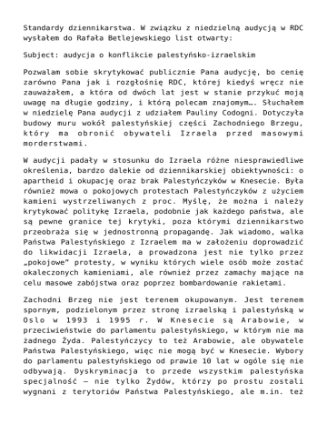 Audycja o konflikcie palestyńsko - izraelskim w radiu RDC. List