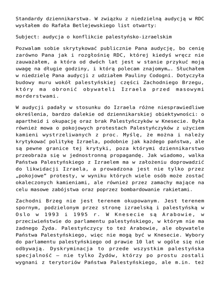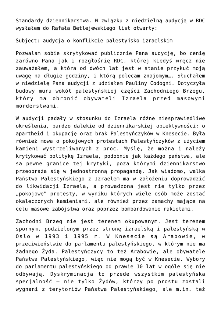 Standardy dziennikarstwa. W związku z niedzielną audycją w RDC wysłałem do Rafała Betlejewskiego list otwarty: Subject: audycja o konflikcie palestyńsko-izraelskim Pozwalam sobie skrytykować publicznie Pana audycję, bo cenię zarówno Pana jak i rozgłośnię RDC, której kiedyś wręcz nie zauważałem, a która od dwóch lat jest w stanie przykuć moją uwagę na długie godziny, i którą polecam znajomym…. Słuchałem w niedzielę Pana audycji z udziałem Pauliny Codogni. Dotyczyła budowy muru wokół palestyńskiej części Zachodniego Brzegu, który ma obronić obywateli Izraela przed masowymi morderstwami. W audycji padały w stosunku do Izraela różne niesprawiedliwe określenia, bardzo dalekie od dziennikarskiej obiektywności: o apartheid i okupację oraz brak Palestyńczyków w Knesecie. Była również mowa o pokojowych protestach Palestyńczyków z użyciem kamieni wystrzeliwanych z proc. Myślę, że można i należy krytykować politykę Izraela, podobnie jak każdego państwa, ale są pewne granice tej krytyki, poza którymi dziennikarstwo przeobraża się w jednostronną propagandę. Jak wiadomo, walka Państwa Palestyńskiego z Izraelem ma w założeniu doprowadzić do likwidacji Izraela, a prowadzona jest nie tylko przez „pokojowe” protesty, w wyniku których wiele osób może zostać okaleczonych kamieniami, ale również przez zamachy mające na celu masowe zabójstwa oraz poprzez bombardowanie rakietami. Zachodni Brzeg nie jest terenem okupowanym. Jest terenem spornym, podzielonym przez stronę izraelską i palestyńską w Oslo w 1993 i 1995 r. W Knesecie są Arabowie, w przeciwieństwie do parlamentu palestyńskiego, w którym nie ma żadnego Żyda. Palestyńczycy to też Arabowie, ale obywatele Państwa Palestyńskiego, więc nie mogą być w Knesecie. Wybory do parlamentu palestyńskiego od prawie 10 lat w ogóle się nie odbywają. Dyskryminacja to przede wszystkim palestyńska specjalność – nie tylko Żydów, którzy po prostu zostali wygnani z terytoriów Państwa Palestyńskiego, ale m.in. też kobiet, mniejszości seksualnych i dziennikarzy. Narzekanie na „apartheid” w Izraelu, stosunkowo demokratycznym państwie (nawet jeżeli z odchyleniem religijnym), otoczonym krwawymi i agresywnymi dyktaturami, do których nie można nie zaliczyć również Państwa Palestyńskiego – jest hipokryzją.