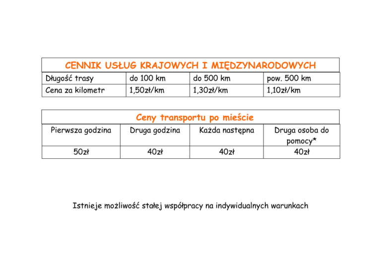 CENNIK USŁUG KRAJOWYCH I MIĘDZYNARODOWYCH Długość trasy do 100 km do 500 km pow. 500 km Cena za kilometr 1,50zł/km 1,30zł/km 1,10zł/km Ceny transportu po mieście Pierwsza godzina Druga godzina Każda następna 50zł 40zł 40zł Druga osoba do pomocy* 40zł Istnieje możliwość stałej współpracy na indywidualnych warunkach
