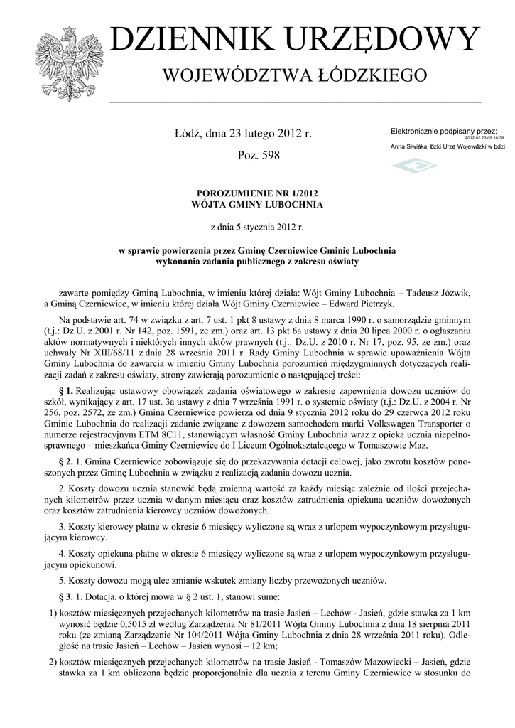DZIENNIK URZĘDOWY WOJEWÓDZTWA ŁÓDZKIEGO ——————————————————————————————————————————— Łódź, dnia 23 lutego 2012 r. Elektronicznie podpisany przez: 2012.02.23 09:10:39 Anna Siwińska; Łódzki Urząd Wojewódzki w Łodzi Poz. 598 POROZUMIENIE NR 1/2012 WÓJTA GMINY LUBOCHNIA Public key: Data: 2012-02-23 z dnia 5 stycznia 2012 r. w sprawie powierzenia przez Gminę Czerniewice Gminie Lubochnia wykonania zadania publicznego z zakresu oświaty zawarte pomiędzy Gminą Lubochnia, w imieniu której działa: Wójt Gminy Lubochnia – Tadeusz Józwik, a Gminą Czerniewice, w imieniu której działa Wójt Gminy Czerniewice – Edward Pietrzyk. Na podstawie art. 74 w związku z art. 7 ust. 1 pkt 8 ustawy z dnia 8 marca 1990 r. o samorządzie gminnym (t.j.: Dz.U. z 2001 r. Nr 142, poz. 1591, ze zm.) oraz art. 13 pkt 6a ustawy z dnia 20 lipca 2000 r. o ogłaszaniu aktów normatywnych i niektórych innych aktów prawnych (t.j.: Dz.U. z 2010 r. Nr 17, poz. 95, ze zm.) oraz uchwały Nr XIII/68/11 z dnia 28 września 2011 r. Rady Gminy Lubochnia w sprawie upoważnienia Wójta Gminy Lubochnia do zawarcia w imieniu Gminy Lubochnia porozumień międzygminnych dotyczących realizacji zadań z zakresu oświaty, strony zawierają porozumienie o następującej treści: § 1. Realizując ustawowy obowiązek zadania oświatowego w zakresie zapewnienia dowozu uczniów do szkół, wynikający z art. 17 ust. 3a ustawy z dnia 7 września 1991 r. o systemie oświaty (t.j.: Dz.U. z 2004 r. Nr 256, poz. 2572, ze zm.) Gmina Czerniewice powierza od dnia 9 stycznia 2012 roku do 29 czerwca 2012 roku Gminie Lubochnia do realizacji zadanie związane z dowozem samochodem marki Volkswagen Transporter o numerze rejestracyjnym ETM 8C11, stanowiącym własność Gminy Lubochnia wraz z opieką ucznia niepełnosprawnego – mieszkańca Gminy Czerniewice do I Liceum Ogólnokształcącego w Tomaszowie Maz. § 2. 1. Gmina Czerniewice zobowiązuje się do przekazywania dotacji celowej, jako zwrotu kosztów ponoszonych przez Gminę Lubochnia w związku z realizacją zadania dowozu ucznia. 2. Koszty dowozu ucznia stanowić będą zmienną wartość za każdy miesiąc zależnie od ilości przejechanych kilometrów przez ucznia w danym miesiącu oraz kosztów zatrudnienia opiekuna uczniów dowożonych oraz kosztów zatrudnienia kierowcy uczniów dowożonych. 3. Koszty kierowcy płatne w okresie 6 miesięcy wyliczone są wraz z urlopem wypoczynkowym przysługującym kierowcy. 4. Koszty opiekuna płatne w okresie 6 miesięcy wyliczone są wraz z urlopem wypoczynkowym przysługującym opiekunowi. 5. Koszty dowozu mogą ulec zmianie wskutek zmiany liczby przewożonych uczniów. § 3. 1. Dotacja, o której mowa w § 2 ust. 1, stanowi sumę: 1) kosztów miesięcznych przejechanych kilometrów na trasie Jasień – Lechów - Jasień, gdzie stawka za 1 km wynosić będzie 0,5015 zł według Zarządzenia Nr 81/2011 Wójta Gminy Lubochnia z dnia 18 sierpnia 2011 roku (ze zmianą Zarządzenie Nr 104/2011 Wójta Gminy Lubochnia z dnia 28 września 2011 roku). Odległość na trasie Jasień – Lechów – Jasień wynosi – 12 km; 2) kosztów miesięcznych przejechanych kilometrów na trasie Jasień - Tomaszów Mazowiecki – Jasień, gdzie stawka za 1 km obliczona będzie proporcjonalnie dla ucznia z terenu Gminy Czerniewice w stosunku do Dziennik Urzędowy Województwa Łódzkiego —2— Poz. 598 ————————————————————————————————————————————————————————————— kosztów ogólnych dla 7 uczniów. Odległość na trasie Jasień – Tomaszów Mazowiecki – Jasień wynosi 24 km; 3) dzienny koszt zatrudnienia kierowcy obliczony proporcjonalnie dla 1 ucznia z terenu Gminy Czerniewice, w stosunku do kosztów ogólnych dla 11 uczniów x liczba dni dojazdów; 4) dzienny koszt zatrudnienia opiekuna obliczony proporcjonalnie dla 1 ucznia z terenu Gminy Czerniewice, w stosunku do kosztów ogólnych dla 11 uczniów x liczba dni dojazdów. 2. Wysokość kosztów dowozu ucznia z terenu Gminy Czerniewice za dany miesiąc, ustalana na podstawie karty dowozu ucznia zawierającej daty przejazdu podpisanej przez rodzica i opiekuna, przekazana zostanie Gminie Czerniewice w terminie do dnia 15 następnego miesiąca. 3. Gmina Czerniewice zobowiązuje się do uiszczania należności w terminie do ostatniego dnia miesiąca, w którym przekazane zostało pismo informujące o wysokości kosztów dowozu uczniów za miesiąc poprzedni na konto Urzędu Gminy Lubochnia w Powiatowym Banku Spółdzielczym w Tomaszowie Mazowieckim nr: 40 8985 0004 0010 0143 3085 0005, pod rygorem naliczania odsetek ustawowych w przypadku uchybienia terminu płatności. 4. Wysokość dotacji na realizację zadania określonego w porozumieniu, strony określają szacunkowo na kwotę 2 600,00 zł. § 4. Porozumienie obowiązuje w okresie od 9 stycznia 2012 r. do dnia 29 czerwca 2012 r. § 5. 1. Gmina Lubochnia zobowiązuje się do przekazania Gminie Czerniewice sprawozdania finansowego z realizacji przejętego zadania związanego z dowozem ucznia-mieszkańca Gminy Czerniewice do I Liceum Ogólnokształcącego w Tomaszowie Maz., za okres: 9 styczeń–29 czerwiec 2012 r. w ciągu 15 dni po zakończeniu okresu rozliczeniowego. 2. Środki niewykorzystane podlegają zwrotowi na rachunek bankowy Gminy Czerniewice w Powiatowym Banku Spółdzielczym w Tomaszowie Maz. nr 47 8985 0004 0010 0144 1165 0006, w terminie do dnia 15 lipca 2012 r. 3. W przypadku zwrotu niewykorzystanych środków po terminie określonych w ust. 2, należy przekazać je wraz z odsetkami w wysokości określonej jak do zaległości podatkowych. 4. Środki finansowe wykorzystane niezgodnie z przeznaczeniem, podlegają zwrotowi zgodnie z art. 252 ustawy z dnia 27 sierpnia 2009 r. o finansach publicznych (Dz.U. Nr 157, poz. 1240, ze 