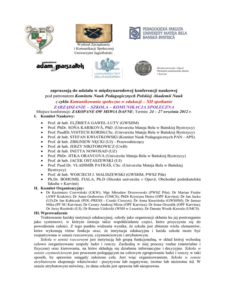 Wydział Zarządzania i Komunikacji Społecznej Uniwersytet Jagielloński Slezská univerzita v Opavě Obchodně podnikatelská fakulta v Karviné zapraszają do udziału w międzynarodowej konferencji naukowej pod patronatem Komitetu Nauk Pedagogicznych Polskiej Akademii Nauk z cyklu Komunikowanie społeczne w edukacji – XII spotkanie ZARZĄDZANIE – SZKOŁA – KOMUNIKACJA SPOŁECZNA Miejsce konferencji: ZAKOPANE OW MSWiA DAFNE; Termin: 24 – 27 września 2012 r. I. Komitet Naukowy: Prof. dr hab. ELŻBIETA GAWEŁ-LUTY (GWSHM) Prof. PhDr. SOŇA KARIKOVÁ, PhD. (Univerzita Mateja Bela w Bańskiej Bystrzycy) Prof. PaedDr.VOJTECH KORIM,CSc. (Univerzita Mateja Bela w Bańskiej Bystrzycy) Prof. dr hab. STEFAN KWIATKOWSKI (Komitet Nauk Pedagogicznych PAN - APS) Prof. dr hab. ZBIGNIEW NĘCKI (UJ) - Przewodniczący Prof. dr hab. JERZY NIKITOROWICZ (UwB) Prof. dr hab. INETTA NOWOSAD (UZ) Prof. PhDr. JITKA ORAVCOVA (Univerzita Mateja Bela w Bańskiej Bystrzycy) Prof. dr hab. JACEK OSTASZEWSKI (UJ) Prof. Paed Dr. VLADIMÍR PATRÁŃ, CSc. (Univerzita Mateja Bela w Bańskiej Bystrzycy) Prof. dr hab. WOJCIECH J. MALISZEWSKI (GWSHM, PWSZ Piła) Ph.Dr. BOHUMIL FIALA, Ph.D (Slezská univerzita v Opavě, Obchodně podnikatelská fakulta v Karviné) II. Komitet Organizacyjny: Dr Kazimierz Czerwiński (UKW); Mgr Mirosław Drzewowski (PWSZ Piła); Dr Marian Fiedor (AWF Kraków); Dr Anna Grabowiec (UMCS); PhDr Krystyna Heinz (OPF Karvina); Dr Jan Jacko (UJ);Dr Jan Kubiczek (POL-PRESS - Czeski Cieszyn); Dr Anna Knocińska (GWSHM); Dr Janusz Mika (PF SU Karvina); Dr Cezary Andrzej Mizia (OPF Karvina); Dr Irena Orszulik (OPF Karvina); Dr Jerzy Rosiński (UJ); Dr Roman Uździcki (WSH w Lesznie); Dr Danuta Wosik-Kawala (UMCS) III. Wprowadzenie Traktowanie każdej instytucji edukacyjnej, szkoły jako organizacji skłania ku jej postrzeganiu jako systemowi, w którym istnieje takie współdziałanie części, które przyczynia się do powodzenia całości. Z tego punktu widzenia wynika, że szkoła jest zbiorem wielu elementów, które wykonują różne funkcje oraz, że instytucja edukacyjna i każda szkoła może być rozpatrywana w sensie rzeczowym, czynnościowym i atrybutowym. Szkoła w sensie rzeczowym jest instytucją lub grupą funkcjonalną, w skład której wchodzą celowo zorganizowane zespoły ludzi i rzeczy. Zachodzą w niej procesy realne (materialne i fizyczne) oraz kierowania, na które składają się działania informacyjne i decyzyjne. Szkoła w sensie czynnościowym jest procesem polegającym na celowym zgrupowaniu ludzi i rzeczy w taki sposób, by sprawnie osiągały założone cele. Jest więc organizowaniem. Szkoła w sensie atrybutowym eksponuje właściwości - pozytywne lub negatywne, istotne lub nieistotne itd. W sensie atrybutowym mówimy, że dana szkoła jest sprawna lub niesprawna. O szkole można również powiedzieć, że to ogólnie pojęta cecha rzeczy lub ciągów zdarzeń, rozpatrywanych jako złożone z części oraz ze względu na stosunek tych części do siebie nawzajem i do całości, a polegająca na tym, że elementy te muszą się łączyć, być wzajemnie powiązane, bo tylko wtedy szkoła osiąga zamierzone cele. Struktura każdej organizacji, zatem i szkoły, stanowiąca podstawę jej wewnętrznego uporządkowania, nie tylko odzwierciedla układ powiązań poszczególnych części, ale przede wszystkim pozwala wyjaśnić zachowania ludzi funkcjonujących w jej ramach. Szkoły tworzą i rozwijają ludzie. Ich zachowania w decydujący sposób wpływają na jej funkcjonowanie i efektywność prowadzonej działalności. Ludzie też są tworzywem szkoły, bowiem powiązane ze sobą jednostki i grupy, realizujące wspólnie określone cele i zadania, stanowią podsystem społeczny szkoły Człowiek jest jednym z najbardziej złożonych, wysoce zmiennych i trudnych do przewidzenia elementów każdej szkoły. Szczególnie jego zachowania są funkcją wielu czynników (wewnętrznych i zewnętrznych). Te wszystkie czynniki zadecydowały o nadaniu kolejnej debacie wiążącej zagadnienia komunikacji społecznej, szkoły i zarządzania. Warto zatem podjąć rozważania o wspólnocie szkolnej w perspektywie: mistrzostwa osobistego, refleksji nad obrazem rzeczywistości szkolnej, kreowania wspólnej wizji szkoły, przekształcania sumy kwalifikacji członków wspólnoty w „większy wymiar” kompetencji i myślenia systemowego. Zapraszamy… IV. Celem konferencji jest: diagnoza problematyki zarządzania oraz komunikacji i negocjacji w edukacji, głównie w odniesieniu do szkoły jako organizacji; identyfikacja kompetencji warunkujących sprawność i efektywność pracy szkoły, a także jej jakości; poznanie i propagowanie nowoczesnej myśli naukowej z zakresu efektywności zarządzania i organizacji szkolnictwem, szczególnie w zakresie postrzegania szkoły (każdego szczebla kształcenia i wychowania) jako wytworu sposobów myślenia i interakcji uczestników procesu edukacji: nauczycieli, uczniów, rodziców i osób zarządzających szkołą; V. Proponowany program konferencji Dyskusje panelowe w grupach tematycznych (równolegle): Grupa 1: Komunikowanie społeczne w sytuacji konfliktu. Mediacje i negocjacje – kompetencje do kreacji porozumienia i wspólnoty. Perspektywa środowiska edukacji i jej otoczenia społecznego Moderator: prof. dr hab. Zbigniew Nęcki (Wydział Zarządzania i Komunikacji Społecznej Uniwersytet Jagielloński) a) Komunikowanie w organizacji b) Relacje interpersonalne w organizacji c) Kompetencje do mediacji i negocjacji d) Specyfika komunikacji społecznej w sytuacji konfliktu e) Kompetencja komunikacyjna w sytuacji konfliktu f) Metody wpływu społecznego – komunikowanie perswazyjne Grupa 2: Komunikacja społeczna w szkole. Szkoła jako organizacja i jej sieci komunikacyjne Moderatorzy: prof. dr hab. Ewa Gaweł-Luty (GWSHM) i prof. dr hab. Wojciech J. Maliszewski (GWSHM) a) Szkoła i jej otoczenie w perspektywie komunikacji społecznej b) Sz