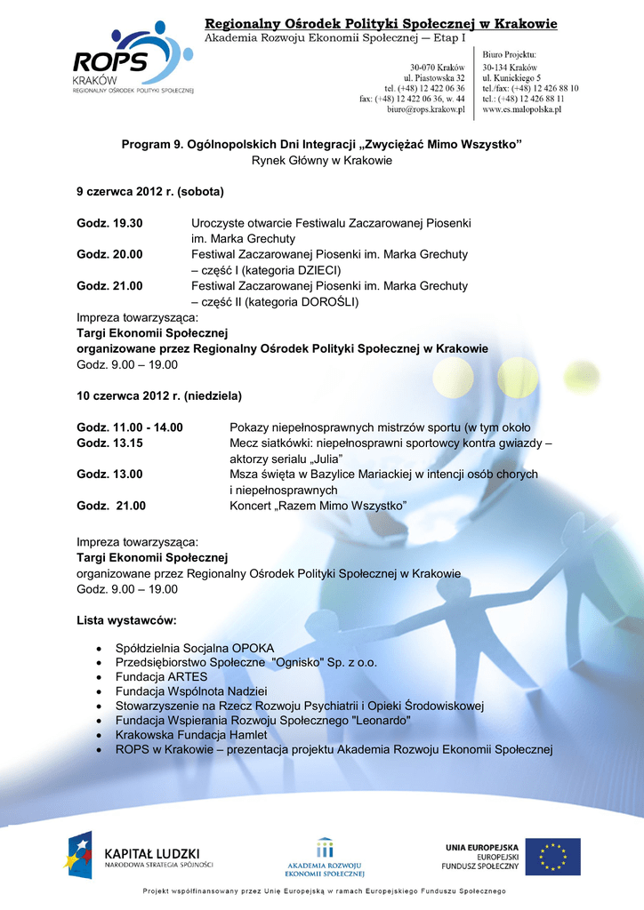 Program 9. Ogólnopolskich Dni Integracji „Zwyciężać Mimo Wszystko” Rynek Główny w Krakowie 9 czerwca 2012 r. (sobota) Godz. 19.30 Uroczyste otwarcie Festiwalu Zaczarowanej Piosenki im. Marka Grechuty Godz. 20.00 Festiwal Zaczarowanej Piosenki im. Marka Grechuty – część I (kategoria DZIECI) Godz. 21.00 Festiwal Zaczarowanej Piosenki im. Marka Grechuty – część II (kategoria DOROŚLI) Impreza towarzysząca: Targi Ekonomii Społecznej organizowane przez Regionalny Ośrodek Polityki Społecznej w Krakowie Godz. 9.00 – 19.00 10 czerwca 2012 r. (niedziela) Godz. 11.00 - 14.00 Godz. 13.15 Godz. 13.00 Godz. 21.00 Pokazy niepełnosprawnych mistrzów sportu (w tym około Mecz siatkówki: niepełnosprawni sportowcy kontra gwiazdy – aktorzy serialu „Julia” Msza święta w Bazylice Mariackiej w intencji osób chorych i niepełnosprawnych Koncert „Razem Mimo Wszystko” Impreza towarzysząca: Targi Ekonomii Społecznej organizowane przez Regionalny Ośrodek Polityki Społecznej w Krakowie Godz. 9.00 – 19.00 Lista wystawców: Spółdzielnia Socjalna OPOKA Przedsiębiorstwo Społeczne "Ognisko" Sp. z o.o. Fundacja ARTES Fundacja Wspólnota Nadziei Stowarzyszenie na Rzecz Rozwoju Psychiatrii i Opieki Środowiskowej Fundacja Wspierania Rozwoju Społecznego "Leonardo" Krakowska Fundacja Hamlet ROPS w Krakowie – prezentacja projektu Akademia Rozwoju Ekonomii Społecznej Spółdzielnia Socjalna Opoka Oferuje usługi cateringowe i gastronomiczne świadczone zarówno dla osób prywatnych jak i instytucji” oraz że usługi szkoleniowe w skład których wchodzą szkolenia zawodowe, szkolenia z zakresu przedsiębiorczości społecznej. Spółdzielnia „Opoka” oferuje także ręcznie robione zaproszenia, wyroby ze sznurka, gliny i inne wyroby rękodzieła artystycznego. Więcej na www.opokas.pl Przedsiębiorstwo Społeczne "Ognisko" Sp z o.o. Oferuje szeroki wybór rękodzieła artystycznego zwłaszcza ceramicznego, wykonywanego ręcznie, co nadaje przedmiotom niepowtarzalny charakter. Firma świadczy także usługi związane z utrzymaniem czystości, oraz catering i usługi gastronomiczne, prowadzone w formie „Baru Małej Gastronomii- Bar przy Ognisku” Więcej www.ognisko.net.pl Fundacja ARTES Oferuje szeroką gamę rękodzieła artystycznego wykonywanego ręcznie co nadaje przedmiotom niepowtarzalny charakter. W ofercie znajdują się wyroby z drewna, tkane gobeliny i torebki oraz kartki drukowane. Więcej na www.artes.krakow.pl Fundacja Wspólnota Nadziei Na żyznej ziemi w okolicy Jurajskich Parków Krajobrazowych, na Farmie Życia, uprawiane są czyste ekologicznie warzywa i owoce. Farma jest położona z dala od szlaków komunikacyjnych i ośrodków przemysłowych, a sadzonki i nasiona przeznaczone do zasiewów nie są poddawane żadnej obróbce. Na Farmie można kupić ekologiczne warzywa i produkty rękodzielnicze wykonywane przez osoby z autyzmem więcej na www.farma.org.pl Stowarzyszenie na Rzecz Rozwoju Psychiatrii i Opieki Środowiskowej Prowadzi działalność na rzecz osób chorujących psychicznie. W swojej ofercie ma produkty rękodzieła artystycznego, ręcznie wykonywane, unikalne świece oraz kartki i zaproszenia okolicznościowe. Więcej na www.stowarzyszenie-rozwoju.eu. Fundacja Wspierania Rozwoju Społecznego "Leonardo". W swojej ofercie ma produkty rękodzieła artystycznego oraz pracowni ceramicznej. Prowadzi także stolarnie, w ramach której można wykonać meble kuchenne i biurowe według indywidualnego projektu. Więcej na www. fundacja-leonardo.pl Krakowska Fundacja „Hamlet” Fundacja Hamlet obchodzi w tym roku swoje dwudziestolecie. Jest organizacją pozarządową pomagającą osobom chorym psychicznie w zakresie pozyskiwania miejsc pracy, mieszkań chronionych, prowadzeniu grup wsparcia i samopomocy oraz integracji społecznej poprzez promocję ich twórczości artystycznej. Na targach będą prezentowane obrazy i fotografie, wyroby dekoracyjne z surowców odzyskanych w drodze recyklingu, oraz hafty i rękodzieło. Goście będą mogli również napić się pysznej kawy i zakupić ciasteczka wykonane przez pracownię kulinarną firmy społecznej Cafe Hamlet. Zapraszamy do naszego stoiska!!! Więcej na www.hamlet.org.pl