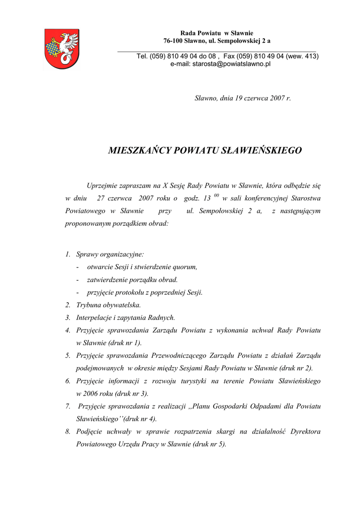 Rada Powiatu w Sławnie 76-100 Sławno, ul. Sempołowskiej 2 a ___________________________________________________________ Sławno, dnia stycznia 200 Tel.18 (059) 810 49 04 do 08 , Fax (059) 810 49 04 (wew. 413) e-mail: [email protected] Sławno, dnia 19 czerwca 2007 r. MIESZKAŃCY POWIATU SŁAWIEŃSKIEGO Uprzejmie zapraszam na X Sesję Rady Powiatu w Sławnie, która odbędzie się w dniu 27 czerwca 2007 roku o godz. 13 Powiatowego w Sławnie przy 00 w sali konferencyjnej Starostwa ul. Sempołowskiej 2 a, z następującym proponowanym porządkiem obrad: 1. Sprawy organizacyjne: - otwarcie Sesji i stwierdzenie quorum, - zatwierdzenie porządku obrad. - przyjęcie protokołu z poprzedniej Sesji. 2. Trybuna obywatelska. 3. Interpelacje i zapytania Radnych. 4. Przyjęcie sprawozdania Zarządu Powiatu z wykonania uchwał Rady Powiatu w Sławnie (druk nr 1). 5. Przyjęcie sprawozdania Przewodniczącego Zarządu Powiatu z działań Zarządu podejmowanych w okresie między Sesjami Rady Powiatu w Sławnie (druk nr 2). 6. Przyjęcie informacji z rozwoju turystyki na terenie Powiatu Sławieńskiego w 2006 roku (druk nr 3). 7. Przyjęcie sprawozdania z realizacji ,,Planu Gospodarki Odpadami dla Powiatu Sławieńskiego’’(druk nr 4). 8. Podjęcie uchwały w sprawie rozpatrzenia skargi na działalność Dyrektora Powiatowego Urzędu Pracy w Sławnie (druk nr 5). 9. Podjęcie uchwały w sprawie pozbawienia dróg powiatowych kategorii drogi powiatowej ( druk nr 6). 10. Podjęcie uchwały w sprawie przyjęcia Planu Rozwoju Lokalnego dla jednostek podległych Powiatowi Sławieńskiemu (druk nr 7). 11. Podjęcie uchwały w sprawie zmian w budŜecie Powiatu na 2007 rok (druk nr 8). 12. Podjęcie uchwały w sprawie zmiany uchwały budŜetowej na 2007 rok (druk nr 9). 13. Podjęcie uchwały w sprawie zatwierdzenia planu przychodów i wydatków Powiatowego Funduszu Gospodarki Zasobem Geodezyjnym i Kartograficznym na 2007 r. (druk nr 10). 14. Podjęcie uchwały w sprawie wyraŜenia zgody na ustalenie wartości jednego punktu w złotych dla pracowników samorządowych zatrudnionych w niektórych powiatowych jednostkach budŜetowych (druk nr11). 15. Podjęcie uchwały zmieniająca Uchwałę Nr VII/III/51/07 Rady Powiatu w Sławnie z dnia 29 marca 2007 r. w sprawie określenia zadań, na które przeznacza się środki Państwowego Funduszu Rehabilitacji Osób Niepełnosprawnych przekazywane przez Prezesa Zarządu Funduszu na wyodrębniony rachunek bankowy- wg algorytmu w 2007 roku (druk nr 12). 16. Odpowiedzi na interpelacje i zapytania radnych. 17. Wnioski i oświadczenia radnych. 18. Zamknięcie Sesji. Z powaŜaniem Przewodniczący Rady Roman Margielewski