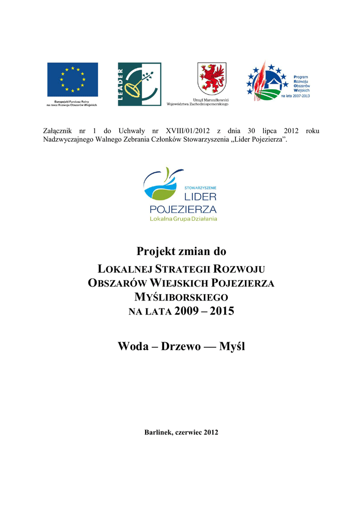 Załącznik nr 1 do Uchwały nr XVIII/01/2012 z dnia 30 lipca 2012 Nadzwyczajnego Walnego Zebrania Członków Stowarzyszenia „Lider Pojezierza”. Projekt zmian do LOKALNEJ STRATEGII ROZWOJU OBSZARÓW WIEJSKICH POJEZIERZA MYŚLIBORSKIEGO NA LATA 2009 – 2015 Woda – Drzewo –– Myśl Barlinek, czerwiec 2012 roku Nad opracowaniem projektu zmian do "Lokalnej Strategii Rozwoju Obszarów Wiejskich Pojezierza Myśliborskiego 2009-2015 „Woda-Drzewo-Myśl" pracowali: Zespół ds. strategii Konwent Wójtów i Burmistrzów z obszaru działania LGD – sektor publiczny Zarząd LGD Biuro LGD Poprawki i uaktualnienia dokumentu opracował Zespól ds. LSR na podstawie konsultacji społecznych oraz przygotowywane na Nadzwyczajne Walne Zebranie Członków Stowarzyszenia w dniu 30 lipca 2012 roku. 2 Spis treści 1. Charakterystyka Lokalnej Grupy Działania jako jednostki odpowiedzialnej za realizację Lokalnej Strategii Rozwoju …………................................. str. 4 1.1 Nazwa i status prawny LGD 1.2 Opis procesu budowania dodatkowych zadań do LSR 1.3 Budowanie dodatkowych zadań do LSR w oparciu o projekty współpracy 2. Opis obszaru objętego LSR ………………………………………………………………. str. 7 2.1 Ocena społeczno-gospodarcza obszaru ………………………………………. ……….. str. 2.1.1. Potencjał demograficzny ……………………………………………………. str. 7 2.1.2. Potencjał gospodarczy ………………………………………………………. str. 8 2.1.3. Poziom aktywności społecznej …………………………………………….. str. 10 2.1.4. Stan rozwoju infrastruktury……………………………………………….... str. 12 2.4. Specyfika obszaru……………………………………………………………………... str. 15 3. Analiza SWOT dla obszaru objętego LSR ……………………………………................ str. 18 4. Dodatkowe cele szczegółowe w LSR oraz planowane do realizacji nowe przedsięwzięcia………………………………………………………………………….. str. 25 4.1. Cel ogólny I. Pobudzenie działalności gospodarczej na terenach wiejskich ….......... str. 27 4.1.1. Cel szczegółowy I.1. Wdrożenie innowacji i nowych technologii oraz tworzenie pozarolniczych miejsc pracy……………………………………………..… str. 28 I.1.4. Dodatkowe przedsięwzięcie: Dywersyfikacja działalności gospodarczej na obszarach wiejskich z wykorzystaniem elementów innowacyjnych ……str. 28 4.2. Cel ogólny II. Poprawa, jakości życia i wzmocnienie potencjału wsi na Pojezierzu Myśliborskim ……………………………………………………………………..... str. 29 4.2.1. Cel szczegółowy II.4. Polepszenie funkcjonowania przestrzeni publicznej oraz obiektów użyteczności publicznej…………………………………………………… str.34 3 1. CHARAKTERYSTYKA LGD JAKO LOKALNEJ STRATEGII ROZWOJU JEDNOSTKI ODPOWIEDZIALNEJ ZA REALIZACJĘ 1.1. Nazwa i status prawny LGD Lokalna Grupa Działania jest stowarzyszeniem, które przyjęło oficjalnie nazwę „Lider Pojezierza” i zostało zarejestrowane w dniu 15 marca 2006r. w Krajowym Rejestrze Sądowym pod numerem 0000252730. Dane adresowe: Siedziba Stowarzyszenia „Lider Pojezierza” ul. Niepodległości 20, 74-320 Barlinek Siedziba Biura ul. Sadowa 8, 74-320 Barlinek tel.: 095 746 03 60, fax: 095 7460360, e-mail: [email protected], Strona internetowa: www.liderpojezierza.pl. 1.2. Opis procesu budowania dodatkowych zadań do LSR Stowarzyszenie powstało w trakcie realizacji projektu „Strategia dla Pojezierza – zintegrowanie obszarów wiejskich dziewięciu gmin z południa województwa zachodniopomorskiego” realizowanego w ramach I schematu Pilotażowego Programu Leader+. Do jego napisania i realizacji doszło dzięki inicjatywie gminy Barlinek, której przedstawiciele rozpoczęli najpierw rozmowy z sąsiadującymi samorządami, a następnie z innymi partnerami społecznymi i gospodarczymi z tego obszaru. W ramach projektu powołano zespoły robocze: a) Zespół ds. Strategii b) Konwent Wójtów i Burmistrzów z obszaru działania Stowarzyszenia „Lider Pojezierza”. c) Konsultacje społeczne d) Biuro LGD W zespołach tych znaleźli się przedstawiciele samorządu, organizacji pozarządowych i przedsiębiorców z dwunastu gmin (Barlinek, Bierzwnik, Boleszkowice, Choszczno, Dębno, Krzęcin, Lipiany, Myślibórz, Nowogródek Pomorski, Pełczyce, Przelewice, Trzcińsko Zdrój). Pierwszy zespół roboczy - Zespół ds. Strategii miał za zadanie przeprowadzenie procesu tworzenia i konsultacji. Zespół był odpowiedzialny za przeprowadzenie procesu opracowania dodatkowych przedsięwzięć i ewentualnych celów szczegółowych strategii począwszy od zebrania danych, przeprowadzenia wstępnych analiz, aż do konsultowania przygotowanej propozycji na Zarząd Stowarzyszenia. Konwent Wójtów i Burmistrzów, czyli grupa, która przez cały czas trwania projektu była zaangażowana w pracę nad przygotowaniem Strategii została utworzona 20 września 2011 roku w Barlinku. W skład Konwentu wchodzą wójtowie i burmistrzowie z obszaru objętego Lokalna Strategia Rozwoju, reprezentujący w LGD sektor publiczny. Konwent spotykał się 4 razy, tj. 20 września 2011 roku, 02 grudnia 2011 roku, 24 lutego 2012 roku i 20 maja 2012 roku. 4 Na każdym spotkaniu wspólnie określano nowe propozycje do LSR. Członkowie konwentu postanowili realizować nowe przedsięwzięcia poprzez współpracę kilku gmin na zasadach partnerskich, korzystając głównie ze środków w ramach działań „Odnowa i rozwój wsi” oraz „małe projekty”. Konsultacje społeczne dotyczące propozycji dodatkowych zadań do LSR prowadzone były na każdym spotkaniu i szkoleniu podczas bieżących naborów. Podczas spotkań byli obecni przedstawiciele sektora społecznego i