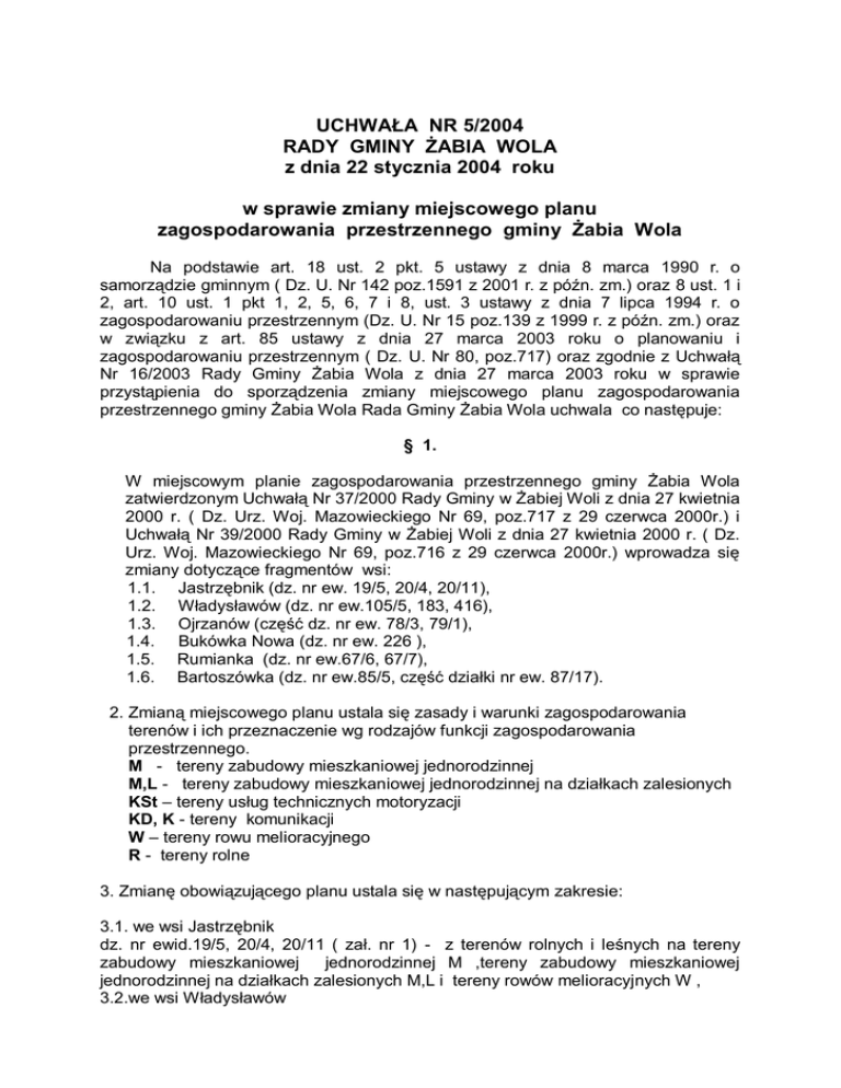 UCHWAŁA NR 5/2004 RADY GMINY ŻABIA WOLA z dnia 22 stycznia 2004 roku w sprawie zmiany miejscowego planu zagospodarowania przestrzennego gminy Żabia Wola Na podstawie art. 18 ust. 2 pkt. 5 ustawy z dnia 8 marca 1990 r. o samorządzie gminnym ( Dz. U. Nr 142 poz.1591 z 2001 r. z późn. zm.) oraz 8 ust. 1 i 2, art. 10 ust. 1 pkt 1, 2, 5, 6, 7 i 8, ust. 3 ustawy z dnia 7 lipca 1994 r. o zagospodarowaniu przestrzennym (Dz. U. Nr 15 poz.139 z 1999 r. z późn. zm.) oraz w związku z art. 85 ustawy z dnia 27 marca 2003 roku o planowaniu i zagospodarowaniu przestrzennym ( Dz. U. Nr 80, poz.717) oraz zgodnie z Uchwałą Nr 16/2003 Rady Gminy Żabia Wola z dnia 27 marca 2003 roku w sprawie przystąpienia do sporządzenia zmiany miejscowego planu zagospodarowania przestrzennego gminy Żabia Wola Rada Gminy Żabia Wola uchwala co następuje: § 1. W miejscowym planie zagospodarowania przestrzennego gminy Żabia Wola zatwierdzonym Uchwałą Nr 37/2000 Rady Gminy w Żabiej Woli z dnia 27 kwietnia 2000 r. ( Dz. Urz. Woj. Mazowieckiego Nr 69, poz.717 z 29 czerwca 2000r.) i Uchwałą Nr 39/2000 Rady Gminy w Żabiej Woli z dnia 27 kwietnia 2000 r. ( Dz. Urz. Woj. Mazowieckiego Nr 69, poz.716 z 29 czerwca 2000r.) wprowadza się zmiany dotyczące fragmentów wsi: 1.1. Jastrzębnik (dz. nr ew. 19/5, 20/4, 20/11), 1.2. Władysławów (dz. nr ew.105/5, 183, 416), 1.3. Ojrzanów (część dz. nr ew. 78/3, 79/1), 1.4. Bukówka Nowa (dz. nr ew. 226 ), 1.5. Rumianka (dz. nr ew.67/6, 67/7), 1.6. Bartoszówka (dz. nr ew.85/5, część działki nr ew. 87/17). 2. Zmianą miejscowego planu ustala się zasady i warunki zagospodarowania terenów i ich przeznaczenie wg rodzajów funkcji zagospodarowania przestrzennego. M - tereny zabudowy mieszkaniowej jednorodzinnej M,L - tereny zabudowy mieszkaniowej jednorodzinnej na działkach zalesionych KSt – tereny usług technicznych motoryzacji KD, K - tereny komunikacji W – tereny rowu melioracyjnego R - tereny rolne 3. Zmianę obowiązującego planu ustala się w następującym zakresie: 3.1. we wsi Jastrzębnik dz. nr ewid.19/5, 20/4, 20/11 ( zał. nr 1) - z terenów rolnych i leśnych na tereny zabudowy mieszkaniowej jednorodzinnej M ,tereny zabudowy mieszkaniowej jednorodzinnej na działkach zalesionych M,L i tereny rowów melioracyjnych W , 3.2.we wsi Władysławów 2 dz. nr ewid.105/5, 416 ( zał. nr 2) - z terenów rolnych i terenów zabudowy rekreacyjnej na tereny zabudowy mieszkaniowej jednorodzinnej M , dz. nr ewid. 183 ( zał. nr 3) - z terenów zabudowy rekreacyjnej na działkach zalesionych na tereny zabudowy mieszkaniowej jednorodzinnej na działkach zalesionych M,L i tereny komunikacji K, 3.3. we wsi Ojrzanów część dz. nr ewid. 78/3, 79/1 ( zał. nr 4) - z terenów rolnych i leśnych na tereny zabudowy mieszkaniowej jednorodzinnej M , tereny zabudowy mieszkaniowej jednorodzinnej na działkach zalesionych M,L , tereny komunikacji KD i K oraz tereny rolne R , 3.4. we wsi Bukówka Nowa dz. nr ewid.226 ( zał. nr 5) - z terenów rolnych na tereny usług technicznych motoryzacji KSt oraz tereny komunikacji K, 3.5.we wsi Rumianka dz. nr ewid. 67/6, 67/7 ( zał. nr 6) – z terenów rolnych na tereny zabudowy mieszkaniowej jednorodzinnej M, 3.6. we wsi Bartoszówka część działki nr ewid.87/17 ( zał. nr 7) - z terenów rolnych na tereny zabudowy mieszkaniowej jednorodzinnej M, dz. nr ewid. 85/5 ( zał. nr 8 ) - z terenów urządzeń obsługi produkcji rolnej na tereny zabudowy mieszkaniowej jednorodzinnej M. § 2. Warunki zagospodarowania wynikające z potrzeb ochrony środowiska przyrodniczego. 1. Ustanawia się zakaz realizacji inwestycji oraz użytkowania obiektów powodujących pogarszanie warunków życia mieszkańców oraz stanu środowiska, a w szczególności takich jego elementów jak: powietrze atmosferyczne, klimat akustyczny, środowisko gruntowo-wodne, krajobraz. 2. Ustanawia się minimalną wielkość powierzchni biologicznie czynnej dla działek budowlanych. Definicja powierzchni biologicznie czynnej wg przepisów szczególnych. § 3. Zasady obsługi w zakresie infrastruktury technicznej: 1. Zaopatrzenie w wodę: a) ustala się zaopatrzenie w wodę z istniejących i projektowanych sieci wodociągowych, b) dopuszcza się inne alternatywne zaopatrzenie w wodę z ujęć indywidualnych do czasu realizacji sieci wodociągowej. 2. Odprowadzenie ścieków sanitarnych i deszczowych: a) ustala się zakaz odprowadzania nie oczyszczonych ścieków i wód deszczowych wprost do gruntu lub cieków powierzchniowych, b) ustala się, że ścieki będą docelowo odprowadzane do komunalnych sieci kanalizacji sanitarnej lub do lokalnych systemów wraz z urządzeniami oczyszczającymi ( o uciążliwości nie wykraczającej poza granice własności) dla działek o powierzchni min. 2000 m² , a w okresie przejściowym do 3 3. 4. 5. 6. szczelnych zbiorników bezodpływowych , z okresowym ich wywozem na zlewnię przy oczyszczalni ścieków na podstawie umów, c) ścieki technologiczne przed zrzutem do kanalizacji sanitarnej wymagają wstępnego oczyszczenia z zanieczyszczeń przemysłowych w urządzeniach oczyszczających znajdujących się w granicach działek , do których Inwestor posiada tytuł prawny, niezależnie od dalszego sposobu oczyszczania , d) wody deszczowe z terenów utwardzonych wymagają odprowadzania do kanalizacji deszczowej, a przed zrzutem do odbiornika wymagają oczyszczenia w separatorach. Ilość i sposób odprowadzania ścieków deszczowych wymaga uzgodnienia z Wojewódzkim Zarządem Melioracji i Urządzeń Wodnych w Warszawie. Odprowadzanie ścieków deszczowych z terenów zabudowy mieszkaniowej do gruntu wymaga właściwego ukształtowania działek, chroniącego tereny sąsiednie przed podtapianiem i zalewaniem. e) wprowadza się zakaz odprowadzania do kanalizacji sanitarnej ścieków deszczowych i z odwodnień oraz do kanalizacji deszczowej – zakaz odprowadzania ścieków sanitarnych. Elektroenergetyka: a) zaopatrzenie w energię elekt