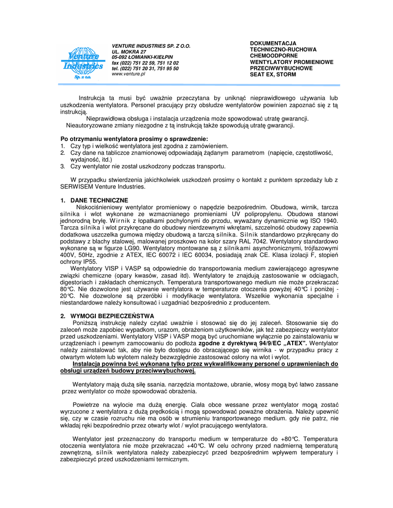VENTURE INDUSTRIES SP. Z O.O. UL. MOKRA 27 05-092 ŁOMIANKI-KIEŁPIN fax (022) 751 22 59, 751 12 02 tel. (022) 751 20 31, 751 95 50 www.venture.pl DOKUMENTACJA TECHNICZNO-RUCHOWA CHEMOODPORNE WENTYLATORY PROMIENIOWE PRZECIWWYBUCHOWE SEAT EX, STORM Instrukcja ta musi być uważnie przeczytana by uniknąć nieprawidłowego używania lub uszkodzenia wentylatora. Personel pracujący przy obsłudze wentylatorów powinien zapoznać się z tą instrukcją. Nieprawidłowa obsługa i instalacja urządzenia może spowodować utratę gwarancji. Nieautoryzowane zmiany niezgodne z tą instrukcją także spowodują utratę gwarancji. Po otrzymaniu wentylatora prosimy o sprawdzenie: 1. Czy typ i wielkość wentylatora jest zgodna z zamówieniem. 2. Czy dane na tabliczce znamionowej odpowiadają żądanym parametrom (napięcie, częstotliwość, wydajność, itd.) 3. Czy wentylator nie został uszkodzony podczas transportu. W przypadku stwierdzenia jakichkolwiek uszkodzeń prosimy o kontakt z punktem sprzedaży lub z SERWISEM Venture Industries. 1. DANE TECHNICZNE Niskociśnieniowy wentylator promieniowy o napędzie bezpośrednim. Obudowa, wirnik, tarcza silnika i wlot wykonane ze wzmacnianego promieniami UV polipropylenu. Obudowa stanowi jednorodną bryłę. W ir n ik z łopatkami pochylonymi do przodu, wyważany dynamicznie wg ISO 1940. Tarcza silnika i wlot przykręcane do obudowy nierdzewnymi wkrętami, szczelność obudowy zapewnia dodatkowa uszczelka gumowa między obudową a tarczą silnika. S iln i k standardowo przykręcany do podstawy z blachy stalowej, malowanej proszkowo na kolor szary RAL 7042. Wentylatory standardowo wykonane są w figurze LG90. Wentylatory montowane są z silnikami asynchronicznymi, trójfazowymi 400V, 50Hz, zgodnie z ATEX, IEC 60072 i IEC 60034, posiadają znak CE. Klasa izolacji F, stopień ochrony IP55. Wentylatory VISP i VASP są odpowiednie do transportowania medium zawierającego agresywne związki chemiczne (opary kwasów, zasad itd). Wentylatory te znajdują zastosowanie w odciągach, digestoriach i zakładach chemicznych. Temperatura transportowanego medium nie może przekraczać 80°C. Nie dozwolone jest używanie wentylatora w temperaturze otoczenia powyżej 40°C i poniżej 20°C. Nie dozwolone są przeróbki i modyfikacje wentylatora. Wszelkie wykonania specjalne i niestandardowe należy konsultować i uzgadniać bezpośrednio z producentem. 2. WYMOGI BEZPIECZEŃSTWA Poniższą instrukcję należy czytać uważnie i stosować się do jej zaleceń. Stosowanie się do zaleceń może zapobiec wypadkom, urazom, obrażeniom użytkowników, jak też zabezpieczy wentylator przed uszkodzeniami. Wentylatory VISP i VASP mogą być uruchomiane wyłącznie po zainstalowaniu w urządzeniach i pewnym zamocowaniu do podłoża zgodne z dyrektywą 94/9/EC „ATEX". Wentylator należy zainstalować tak, aby nie było dostępu do obracającego się wirnika - w przypadku pracy z otwartym wlotem lub wylotem należy bezwzględnie zastosować osłony na wlot i wylot. Instalacja powinna bvć wykonana tylko przez wykwalifikowany personel o uprawnieniach do obsługi urządzeń budowy przeciwwybuchowej. Wentylatory mają dużą siłę ssania. narzędzia montażowe, ubranie, włosy mogą być łatwo zassane przez wentylator co może spowodować obrażenia. Powietrze na wylocie ma dużą energię. Ciała obce wessane przez wentylator mogą zostać wyrzucone z wentylatora z dużą prędkością i mogą spowodować poważne obrażenia. Należy upewnić się, czy w czasie rozruchu nie ma osób w strumieniu transportowanego medium. gdy nie patrz, nie wkładaj ręki bezpośrednio przez otwarty wlot / wylot pracującego wentylatora. Wentylator jest przeznaczony do transportu medium w temperaturze do +80°C. Temperatura otoczenia wentylatora nie może przekraczać +40°C. W celu ochrony przed nadmierną temperaturą zewnętrzną, silnik wentylatora należy zabezpieczyć przed bezpośrednim wpływem temperatury i zabezpieczyć przed uszkodzeniami termicznym. 3. TRANSPORT I PRZECHOWYWANIE Do transportu należy używać odpowiednio do tego celu przeznaczonych urządzeń. Nie należy podnosić wentylatora za kable przyłączeniowe, skrzynkę elektryczną lub silnik. W chwili dostawy należy sprawdzić czy wentylator nie jest uszkodzony. Przed montażem wentylatory należy przechowywać w pomieszczeniach suchych i przewiewnych. Temperatura w miejscu przechowywania wentylatora nie powinna być niższa niż 5°C i nie powinna przekraczać 40°C, a wilgotność względna nie większa niż 70%. Wentylatory powinny być przemieszczane i transportowane na paletach, krytymi środkami transportowymi bez nadmiernych wstrząsów. W czasie transportu i przechowywania wentylatory należy chronić przed uszkodzeniami mechanicznym. Okres przechowywania nie powinien przekraczać jednego roku. 4. MONTAŻ Sprawdzić wszystkie części wentylatora czy nie są uszkodzone oraz czy w ir n ik nie trze o obudowę. Nie należy montować wentylatorów w miejscach, gdzie są narażone na działanie niekorzystnych warunków atmosferycznych. Wentylatory należy montować w pozycji poziomej VISP i VASP silnika. Upewnić się, że wentylator jest zabezpieczony przed wibracjami i wstrząsam. W przypadku otwartego wlotu lub wylotu należy bezwzględnie zamontować oferowane przez producenta osłony. Upewnić się, że s ilnik wentylatora ma dostateczną wentylację, należy bezwzględnie przestrzegać minimalnego odstępu przeszkód od przewietrznika silnika elektrycznego wynoszącego 150mm. Maksymalna temperatura otoczenia silnika nie może przekraczać 40°C. 4. Podłączenie elektryczne Niezbędne jest podłączenie zabezpieczenia przed skutkami zwarć, zaniku fazy czy przeciążeń w celu ochrony silnika elektrycznego i sieci zasilającej oraz innych urządzeń kontrolnozabezpieczających stosowanie do strefy zagrożenia wybuchem. Nastawy zabezpieczeń muszą być odpowiednie z maksymalnym dopuszczalnym, znamionowym natężeni