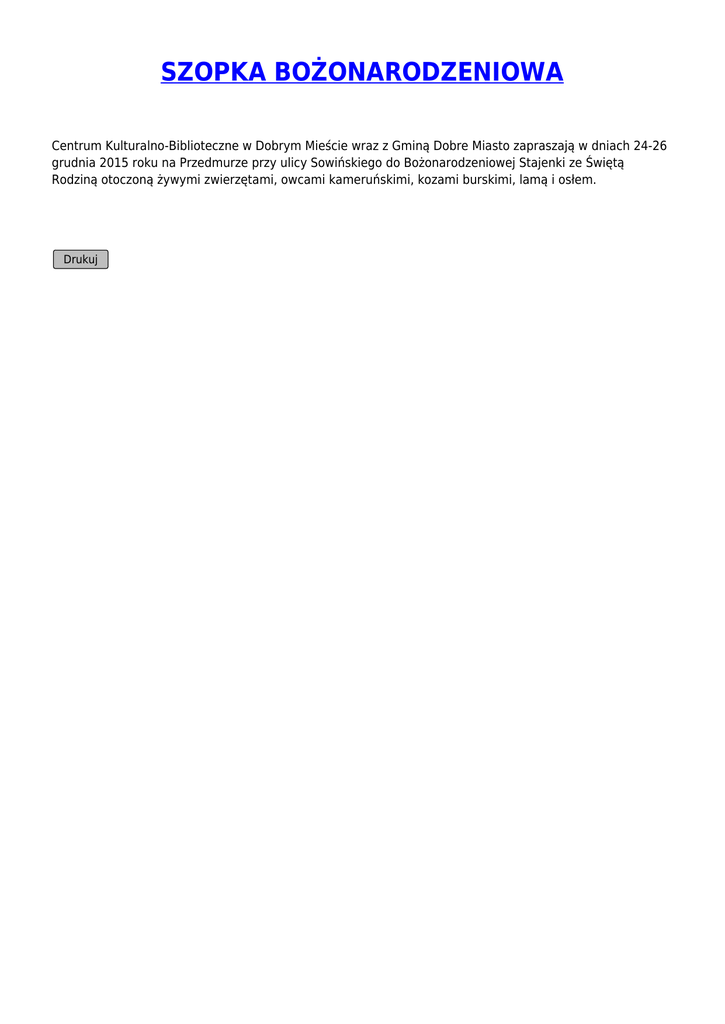 SZOPKA BOŻONARODZENIOWA Centrum Kulturalno-Biblioteczne w Dobrym Mieście wraz z Gminą Dobre Miasto zapraszają w dniach 24-26 grudnia 2015 roku na Przedmurze przy ulicy Sowińskiego do Bożonarodzeniowej Stajenki ze Świętą Rodziną otoczoną żywymi zwierzętami, owcami kameruńskimi, kozami burskimi, lamą i osłem. Drukuj