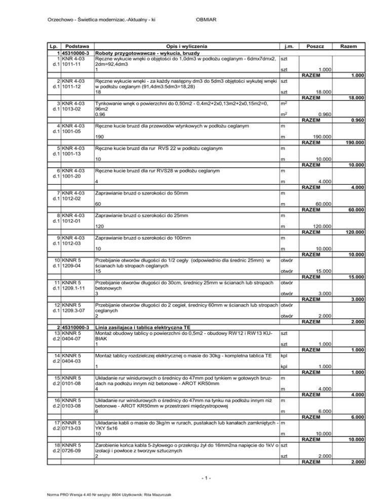 Orzechowo - Świetlica modernizac.-Aktualny - ki Lp. Podstawa 1 45310000-3 1 KNR 4-03 d.1 1011-11 2 KNR 4-03 d.1 1011-12 3 KNR 4-03 d.1 1013-02 4 KNR 4-03 d.1 1001-05 5 KNR 4-03 d.1 1001-13 6 KNR 4-03 d.1 1001-20 7 KNR 4-03 d.1 1012-02 8 KNR 4-03 d.1 1012-01 9 KNR 4-03 d.1 1012-03 10 KNNR 5 d.1 1209-04 11 KNNR 5 d.1 1209.1-11 12 KNNR 5 d.1 1209.3-07 2 45310000-3 13 KNNR 5 d.2 0404-07 14 KNNR 5 d.2 0404-03 15 KNNR 5 d.2 0101-08 16 KNNR 5 d.2 0103-08 17 KNNR 5 d.2 0713-03 18 KNNR 5 d.2 0726-09 OBMIAR Opis i wyliczenia j.m. Roboty przygotowawcze - wykucia, bruzdy Ręczne wykucie wnęki o objętości do 1,0dm3 w podłożu ceglanym - 6dmx7dmx2, szt 2dm=92,4dm3 1 szt Ręczne wykucie wnęki - za każdy następny dm3 do 5dm3 objętości wykutej wnęki szt w podłożu ceglanym (91,4dm3:5dm3=18,28) 18 szt Tynkowanie wnęk o powierzchni do 0,50m2 - 0,4m2+2x0,13m2+2x0,15m2=0, 96m2 0.96 m2 Ręczne kucie bruzd dla przewodów wtynkowych w podłożu ceglanym m 190 m Ręczne kucie bruzd dla rur RVS 22 w podłożu ceglanym m 10 m Ręczne kucie bruzd dla rur RVS28 w podłożu ceglanym m 4 m Zaprawianie bruzd o szerokości do 50mm m 60 m Zaprawianie bruzd o szerokości do 25mm m 120 m Zaprawianie bruzd o szerokości do 100mm m 10 m Przebijanie otworów długości do 1/2 cegły (odpowiednio dla średnic 25mm) w ścianach lub stropach ceglanych 15 otwór Przebijanie otworów długości do 30cm, średnicy 25mm w ścianach lub stropach betonowych 3 otwór m2 otwór otwór Przebijanie otworów długości do 2 cegieł, średnicy 60mm w ścianach lub stropach otwór ceglanych 2 otwór Linia zasilajaca i tablica elektryczna TE Montaż obudowy tablicy o powierzchni do 0,5m2 - obudowy RW12 i RW13 KUBIAK 1 szt kpl 1 kpl Układanie rur winidurowych o średnicy do 47mm pod tynkiem w gotowych bruzdach na podłożu innym niż betonowe - AROT KR50mm 4 m Układanie rur winidurowych o średnicy do 47mm na tynku na podłożu innym niż betonowe - AROT KR50mm w przestrzeni międzystropowej 6 m m m Układanie kabli o masie do 3kg/m w rurach, pustakach lub kanałach zamkniętych - m YKY 5x16 10 m Zarobienie końca kabla 5-żyłowego o przekroju żył do 16mm2na napięcie do 1kV o szt izolacji i powłoce z tworzyw sztucznych 2 szt Norma PRO Wersja 4.40 Nr seryjny: 8604 Użytkownik: Rita Mazurczak Razem 1.000 RAZEM 1.000 18.000 RAZEM 18.000 0.960 RAZEM 0.960 190.000 RAZEM 190.000 10.000 RAZEM 10.000 4.000 RAZEM 4.000 60.000 RAZEM 60.000 120.000 RAZEM 120.000 10.000 RAZEM 10.000 15.000 RAZEM 15.000 3.000 RAZEM 3.000 2.000 RAZEM 2.000 1.000 RAZEM 1.000 1.000 RAZEM 1.000 4.000 RAZEM 4.000 6.000 RAZEM 6.000 10.000 RAZEM 10.000 2.000 RAZEM 2.000 szt Montaż tablicy rozdzielczej elektrycznej o masie do 30kg - kompletna tablica TE -1- Poszcz Orzechowo - Świetlica modernizac.-Aktualny - ki Lp. Podstawa 3 45311000-0 19 KNNR 5 d.3 0204-05 20 KNNR 5 d.3 0204-05 21 KNNR 5 d.3 0103-05 22 KNNR 5 d.3 0301-08 23 KNNR 5 d.3 0302-01 24 KNNR 5 d.3 0306-02 25 KNNR 5 d.3 0306-03 26 KNNR 5 d.3 0307-01 27 KNNR 5 d.3 0307-02 28 KNR 4-03 d.3 1018-01 29 KNNR 5 d.3 0406-01 30 KNNR 5 d.3 0502-04 31 KNNR 5 d.3 0502-01 32 KNNR 5 d.3 0504-02 33 KNNR 5 d.3 0504-02 34 KNNR 5 d.3 0504-02 35 KNNR 5 d.3 0511-01 36 KNNR 5 d.3 0502-02 OBMIAR Opis i wyliczenia Instalacja oświetleniowa Układanie przewodów kabelkowych płaskich o łącznym przekroju żył do 7,5mm2 na podłożu innym niż betonowe - YDYp 3x1,5 300 j.m. m m Układanie rur winidurowych o średnicy do 20mm na tynku na podłożu innym niż betonowe - RVS 20 w przestrzeni międzystropowej 50 m m m Przygotowanie podłoża pod osprzęt instalacyjny - mocowanie osprzętu przez przy- szt kręcenie do konsolek osadzonych w podłożu z wykonaniem ślepych otworów w cegle 16 szt Montaż puszek instalacyjnych pojedynczych podtynkowych o średnicy do 60mm szt 16 szt Montaż pod tynkiem w puszce instalacyjnej łącznika 1-biegunowego szt 6 szt Montaż pod tynkiem w puszce instalacyjnej łącznika świecznikowego szt 4 szt Montaż łącznika jednobiegunowego bryzgoszczelnego szt 5 szt Montaż łącznika świecznikowego bryzgoszczelnego szt 1 szt Wycinanie otworów w płytach wiórkowo-cementowych szt 14 szt Montaż aparatów elektrycznych o masie do 2,5kg - montaż modułu zasilania awa- szt ryjnego 3 szt kpl Montaż porcelanowych opraw oświetleniowych przykręcanych bryzgoodpornych, strugoodpornych - kinkiet ścienny bryzgoszczelny 60W IP65 3 kpl Montaż porcelanowych opraw oświetleniowych przykręcanych bryzgoodpornych, strugoodpornych - oprawa żarowa sufitowa 60W IP54 2 kpl kpl kpl Montaż porcelanowych opraw oświetleniowych przykręcanych bryzgoodpornych, kpl strugoodpornych - oprawa żarowa szczelna zewn. 60W IP54 (strumień skierowany w dół) 4 kpl Montaż opraw świetlówkowych strugoodpornych, pyłoszczelnych w obudowie me- kpl talowej o źródle światła do 2x40W w pomieszczeniach produkcyjnych - np. COSMO 2x36W IP65 4 kpl -2- Norma PRO Wersja 4.40 Nr seryjny: 8604 Użytkownik: Rita Mazurczak 300.000 RAZEM 300.000 125.000 RAZEM 125.000 50.000 RAZEM 50.000 16.000 RAZEM 16.000 16.000 RAZEM 16.000 6.000 RAZEM 6.000 4.000 RAZEM 4.000 5.000 RAZEM 5.000 1.000 RAZEM 1.000 14.000 RAZEM 14.000 3.000 RAZEM 3.000 14.000 RAZEM 14.000 13.000 RAZEM 13.000 3.000 RAZEM 3.000 2.000 RAZEM 2.000 4.000 RAZEM 4.000 4.000 RAZEM 4.000 kpl Montaż opraw oświetleniowych żarowych przykręcanych (zwykłych) - kinkiet ścien- kpl ny 2x60W ozdobny zgodnie z wystrojem wnętrz 13 kpl Montaż opraw oświetleniowych świetlówkowych do 2x20W przykręcanych (zwykłych) - oprawy ewakuacyjne 8W/3h napis "WYJŚCIE AWARYJNE" 2 Razem m Układanie przewodów kabelkowych płaskich o łącznym przekroju żył do 7,5mm2 na podłożu innym niż betonowe - YDYp 4x1,5 125 Montaż opraw oświetleniowych świetlówkowych do 4x40W przykręcanych (zwykłych) - PLAFON OF 4x18W FAMOR Bydgoszcz 14 Poszcz kpl kpl 2.000 Orzechowo - Świetlica modernizac.-Aktualny - ki Lp. Podstawa 37 KNNR 5 d.3 0406-01 4 45310000-3 38 KNNR 5 d.4 0204-05 39 KNNR 5 d.4 0