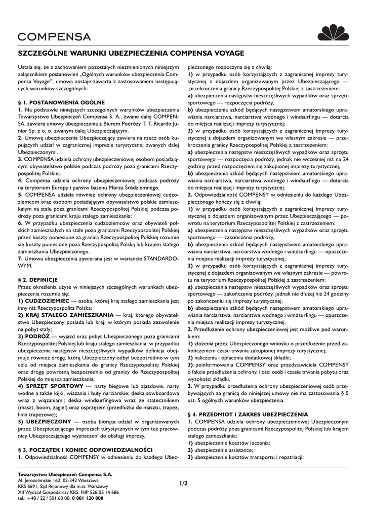 SZCZEGÓLNE WARUNKI UBEZPIECZENIA COMPENSA VOYAGE Ustala si´, ˝e z zachowaniem pozosta∏ych niezmienionych niniejszym za∏àcznikiem postanowieƒ „Ogólnych warunków ubezpieczenia Compensa Voyage”, umowa zostaje zawarta z zastosowaniem nast´pujàcych warunków szczególnych: pieczonego rozpoczyna si´ z chwilà: 1) w przypadku osób korzystajàcych z zagranicznej imprezy turystycznej z dojazdem organizowanym przez Ubezpieczajàcego — przekroczenia granicy Rzeczypospolitej Polskiej z zastrze˝eniem: a) ubezpieczenia nast´pstw nieszcz´Êliwych wypadków oraz sprz´tu sportowego — rozpocz´cia podró˝y, b) ubezpieczenia szkód b´dàcych nast´pstwem amatorskiego uprawiania narciarstwa, narciarstwa wodnego i windsurfingu — dotarcia do miejsca realizacji imprezy turystycznej; 2) w przypadku osób korzystajàcych z zagranicznej imprezy turystycznej z dojazdem organizowanym we w∏asnym zakresie — przekroczenia granicy Rzeczypospolitej Polskiej z zastrze˝eniem: a) ubezpieczenia nast´pstw nieszcz´Êliwych wypadków oraz sprz´tu sportowego — rozpocz´cia podró˝y, jednak nie wczeÊniej ni˝ na 24 godziny przed rozpocz´ciem si´ zakupionej imprezy turystycznej, b) ubezpieczenia szkód b´dàcych nast´pstwem amatorskiego uprawiania narciarstwa, narciarstwa wodnego i windsurfingu — dotarcia do miejsca realizacji imprezy turystycznej. 2. OdpowiedzialnoÊç COMPENSY w odniesieniu do ka˝dego Ubezpieczonego koƒczy si´ z chwilà: 1) w przypadku osób korzystajàcych z zagranicznej imprezy turystycznej z dojazdem organizowanym przez Ubezpieczajàcego — powrotu na terytorium Rzeczypospolitej Polskiej z zastrze˝eniem: a) ubezpieczenia nast´pstw nieszcz´Êliwych wypadków oraz sprz´tu sportowego — zakoƒczenia podró˝y, b) ubezpieczenia szkód b´dàcych nast´pstwem amatorskiego uprawiania narciarstwa, narciarstwa wodnego i windsurfingu — opuszczenia miejsca realizacji imprezy turystycznej; 2) w przypadku osób korzystajàcych z zagranicznej imprezy turystycznej z dojazdem organizowanym we w∏asnym zakresie — powrotu na terytorium Rzeczypospolitej Polskiej z zastrze˝eniem: a) ubezpieczenia nast´pstw nieszcz´Êliwych wypadków oraz sprz´tu sportowego — zakoƒczenia podró˝y, jednak nie d∏u˝ej ni˝ 24 godziny po zakoƒczeniu si´ imprezy turystycznej, b) ubezpieczenia szkód b´dàcych nast´pstwem amatorskiego uprawiania narciarstwa, narciarstwa wodnego i windsurfingu — opuszczenia miejsca realizacji imprezy turystycznej. 2. Przed∏u˝enie ochrony ubezpieczeniowej jest mo˝liwe pod warunkiem: 1) z∏o˝enia przez Ubezpieczonego wniosku o przed∏u˝enie przed zakoƒczeniem czasu trwania zakupionej imprezy turystycznej; 2) naliczenia i op∏acenia dodatkowej sk∏adki; 3) poinformowania COMPENSY oraz przedstawiciela COMPENSY o fakcie przed∏u˝enia ochrony, iloÊci osób i czasie trwania pobytu oraz wysokoÊci sk∏adki. 3. W przypadku przed∏u˝enia ochrony ubezpieczeniowej osób przebywajàcych za granicà do niniejszej umowy nie ma zastosowania § 5 ust. 5 ogólnych warunków ubezpieczenia. § 1. POSTANOWIENIA OGÓLNE 1. Na podstawie niniejszych szczególnych warunków ubezpieczenia Towarzystwo Ubezpieczeƒ Compensa S. A., zwane dalej COMPENSA, zawiera umowy ubezpieczenia z Biurem Podró˝y T. T. Ricardo Junior Sp. z o. o. zwanym dalej Ubezpieczajàcym. 2. Umow´ ubezpieczenia Ubezpieczajàcy zawiera na rzecz osób kupujàcych udzia∏ w zagranicznej imprezie turystycznej zwanych dalej Ubezpieczonymi. 3. COMPENSA udziela ochrony ubezpieczeniowej osobom posiadajàcym obywatelstwo polskie podczas podró˝y poza granicami Rzeczypospolitej Polskiej. 4. Compensa udziela ochrony ubezpieczeniowej podczas podró˝y na terytorium Europy i paƒstw basenu Morza Âródziemnego. 5. COMPENSA udziela równie˝ ochrony ubezpieczeniowej cudzoziemcom oraz osobom posiadajàcym obywatelstwo polskie zamieszka∏ym na sta∏e poza granicami Rzeczypospolitej Polskiej podczas podro˝y poza granicami kraju sta∏ego zamieszkania; 6. W przypadku ubezpieczenia cudzoziemców oraz obywateli polskich zamieszka∏ych na sta∏e poza granicami Rzeczypospolitej Polskiej przez koszty poniesione za granicà Rzeczypospolitej Polskiej rozumie si´ koszty poniesione poza Rzeczypospolità Polskà lub krajem sta∏ego zamieszkania Ubezpieczonego. 7. Umowa ubezpieczenia zawierana jest w wariancie STANDARDOWYM. § 2. DEFINICJE Przez okreÊlenia u˝yte w niniejszych szczególnych warunkach ubezpieczenia rozumie si´: 1) CUDZOZIEMIEC — osoba, której kraj sta∏ego zamieszkania jest inny ni˝ Rzeczypospolita Polska; 2) KRAJ STA¸EGO ZAMIESZKANIA — kraj, którego obywatelstwo Ubezpieczony posiada lub kraj, w którym posiada zezwolenie na pobyt sta∏y; 3) PODRÓ˚ — wyjazd oraz pobyt Ubezpieczonego poza granicami Rzeczypospolitej Polskiej lub kraju sta∏ego zamieszkania; w przypadku ubezpieczenia nast´pstw nieszcz´Êliwych wypadków definicja obejmuje równie˝ drog´, którà Ubezpieczony odby∏ bezpoÊrednio w tym celu od miejsca zamieszkania do granicy Rzeczypospolitej Polskiej oraz drog´ powrotnà bezpoÊrednio od granicy do Rzeczypospolitej Polskiej do miejsca zamieszkania; 4) SPRZ¢T SPORTOWY — narty biegowe lub zjazdowe, narty wodne a tak˝e kijki, wiazania i buty narciarskie; deska sowboardowa wraz z wiàzaniami; deska windsurfingowa wraz ze statecznikiem (maszt, boom, ˝agiel) oraz osprz´tem (przed∏u˝ka do masztu, trapez, linki trapezowe); 5) UBEZPIECZONY — osoba bioràca udzia∏ w organizowanych przez Ubezpieczajàcego imprezach turystycznych w tym te˝ pracownicy Ubezpieczajàcego wyznaczeni do obs∏ugi imprezy. § 4. PRZEDMIOT I ZAKRES UBEZPIECZENIA 1. COMPENSA udziela ochrony ubezpieczeniowej Ubezpieczonym podczas podró˝y poza granicami Rzeczypospolitej Polskiej lub krajem sta∏ego zamieszkania: 1) ubezpieczenie kosztów leczenia; 2) ubezpieczenie assistance; 3) ubezpieczenie kosztów transportu i repatriacji; § 3. POCZÑTEK I KONIEC ODPOWIEDZIALNO