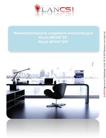 LANCS1 Sp. z o. o ul. Rudnickiego 3a lok. 1H, 01-858 Warszawa, www.lancs1.pl Monochromatyczne urządzenie wielofunkcyjne Ricoh MP305+SP, Ricoh MP305+SPF Ricoh Aficio TM MP305+SP i MP305+SPF to kompaktowe, monochromatyczne urządzenia wielofunkcyjne formatu A4, które posiadają możliwość wydruku w formacie A3 dzięki bocznej tacy ręcznej (maksymalnie do 10 arkuszy). Ricoh Aficio TM MP305+SP i MP305+SPF są pierwszymi urządzeniami, które w standardzie posiadają 10,1 calowy panel dotykowy w systemie ANDROID, który obsługiwany jest tak samo jak smartphony nowej generacji. Użytkownicy mogą m.in. tworzyć i dodawać nowe widżety, instalować aplikacje, odtwarzać filmy (You Tube), a także przeglądać strony internetowe. Dla urządzeń opartych na platformie Android, producent stworzył aplikacje (dostępne na Google Play i App Store): Smart Device Connector – aplikacja dla urządzeń mobilnych. Dzięki technologii NFC autoryzacja funkcji wydruku, kopii, skanu lub faxu odbywa się bezpośrednio z urządzenia mobilnego po zbliżeniu do panela urządzenia wielofunkcyjnego. Smart Device Print & Scan – aplikacja pozwala na wydruk plików, dokumentów, stron internetowych za pomocą urządzenia mobilnego lub z chmury Cloud Service oraz skanowanie plików PDF lub JPEG do pamięci urządzenia mobilnego. LANCS1 Sp. z o. o ul. Rudnickiego 3a lok. 1H, 01-858 Warszawa, www.lancs1.pl Ricoh Aficio TM MP305+SP i MP305+SPF Cechy, które wyróżniają Ricoh Aficio™ MP305+SP i MP305+SPF: Drukowanie z prędkością 30 str./min. A4; Pamięć 2GB, HDD 320GB; Urządzenie gotowe do pracy już po upływie 27 sek.; Pierwsza strona w ciągu 4,9 sek.; Obsługa papieru o gramaturze do 163 g/m2 ; Rozdzielczość wydruku: 600 x 600 dpi; Rozdzielczość skanowania:100-600 dpi; Język drukarki: PCL5e, PCL6(XL), Adobe® PostScript® 3™, PDF, XPS Direct (opcja); Wymiary (szer. x gł. x wys.) - 350 x 493 x 505 mm; Waga urządzenia: 32 kg; Obsługa formatów: A3, A4, A5, A6, B4, B5, B6; Pojemność wejściowa papieru od 260 do 760 arkuszy; Kolorowe skanowanie 30 str. A4/ min.; Możliwość skanowania do: E-mail, Folder, SMB, FTP, NCP, USB, Karta SD; Opcjonalnie możliwość połączenia przez Bluetooth; Zwiększona wydajność tonera – 9 000 stron ( wydajność tonera u poprzednika wynosiła 8 000 stron). LANCS1 Sp. z o. o ul. Rudnickiego 3a lok. 1H, 01-858 Warszawa, www.lancs1.pl Ricoh MP305+SP/MP305+SPF MP305+SP/ MP305+SPF – specyfikacja ogólna 30 stron na minutę Czas nagrzewania Czas uzyskania pierwszej strony Pamięć 27 sekund 4.9 sekundy HDD Wymiary (szer. x gł. x wys.) Waga Źródło zasilania OBSŁUGIWANY PAPIER Zalecany rozmiar papieru Standardowa/e kaseta/y na papier: A4, A5, A6, B4, B5, B6 Taca ręczna: A3, A4, A5, A6, B4, B5, B6 Opcja: 320 GB Pojemność wejściowa papieru Pojemność wyjściowa papieru Standardowo: 260 arkuszy Maksymalnie: 760 arkuszy Standardowo: 100 arkuszy Maksymalnie: 100 arkuszy 350 x 493 x 505 mm Gramatura papieru Standardowa/e kaseta/y na papier: 60- 105 g/m² Taca ręczna: 52 - 163 g/m² Dupleks: 60 - 105 g/m² Standard: 2 GB Maksymalnie: 2 GB 32 kg 220 – 240V, 50/60 Hz KOPIARKA Proces kopiowania Wielokrotne kopiowanie Rozdzielczość Powiększenie Elektrofotograficzny, suchy, jednoskładnikowy Do 999 kopii 300 x 600 dpi, 600 x 600 dpi 25 – 400% (w krokach co 1%) DRUKARKA Język drukarki Rozdzielczość drukowania Interfejs Protokół sieciowy Środowiska Windows® Środowiska Mac OS Środowiska UNIX Inne obsługiwane środowiska Standardowo: PCL5e, PCL6(XL), Adobe® PostScript® 3™, PDF Opcja: XPS direct Max. 600 x 600 dpi Standardowo: USB2.0 Typ B, Gniazdo SD, Ethernet 10 base-T/100 baseTX/1000 base-T, USB2.0 Host I/F Type A Opcja: Bluetooth TCP/IP (IP v4, IP v6) Windows® Vista, Windows® 7, Windows® 8, Windows® 8.1, Windows® Server 2003, Windows® Server 2003R2, Windows® Server 2008, Windows® Server 2008R2, Windows® Server 2012, Windows® Server 2012R2 Macintosh OS X v10.7 UNIX Sun® Solaris: 9, 10, HP-UX: 11.x, 11i v2, 11i v3 SCO OpenServer: 5.0.7, 6.0, RedHat® Linux Enterprise: 4, 5, 6, IBM® AIX: 5L v5.3, 5L v6.1, 5L v7.1 SAP® R/3®, AS/400® using OS/400 Host Print Transform, IBM iSeries SKANER Prędkość skanowania Rozdzielczość Rozmiary oryginałów Sterowniki Skanowanie do: Max. 30 oryginałów/min. kolor/mono Standardowo od 100 do 600 dpi A3,A4,A5,B4,B5,B6 Sieciowy TWAIN E-mail, Folder, FTP, USB, SD card Broszura utworzona na podstawie danych źródłowych, powielanie treści oraz zdjęć zawartych w niej bez uprzedniej zgody LANCS1 Sp. z o.o. zabronione. FAX Sieć PSTN, PBX Kompatybilność Rozdzielczość ITU-T (CCITT) G3 8 x 3.85 linii/mm, 200 x 100 dpi, 8 x 7.7 linii/mm, 200 x200 dpi Prędkość transmisji G3 2 sekundy (200 x 100 dpi, JBIG) 3 sekundy (200 x 100 dpi, MMR) Max. 33.6 Kbps Prędkość modemu Prędkość skanowania Pojemność pamięci 23,8 sek. Pobór mocy: Maksymalnie: 1 140 W Tryb pracy: 455,1 W Tryb gotowości: 83,5 W Tryb niskiego poboru mocy: 66,5 W Tryb uśpienia: 0,87 W Współczynnik TEC (typowy pobór energii elektrycznej): 1 243 Wh Standardowo: 4 MB EKOLOGIA OPCJE 1 x 500-arkuszowa kaseta na papier, Wysoka szafka, Bluetooth, Interfejs licznika, Moduł bezpiecznego nadpisywania danych (wersja certyfikowana), Moduł zabezpieczenia danych przed kopiowaniem, Moduł połączenia faksu, opcja faksu, Unicode Font Package for SAP, Moduł OCR, Bezpośrednie drukowanie pliku w formacie XPS, Zwiększone zabezpieczenia dysku twardego, NFC Card Reader, USB Device Server MATERIAŁY EKSPLOATACYJNE Toner standardowy: Czarny - 9 000 wydruków (deklarowana wartość wydajności zgodna z ISO/IEC 19752) LANCS1 Sp. z o. o ul. Rudnickiego 3a lok. 1H, 01-858 Warszawa, www.lancs1.pl OGÓLNE Prędkość kopiowania