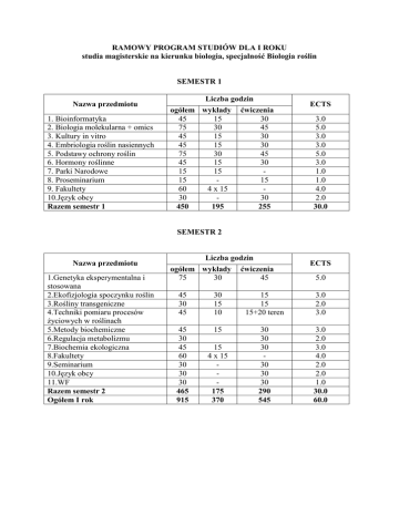 RAMOWY PROGRAM STUDIÓW DLA I ROKU studia magisterskie na kierunku biologia, specjalność Biologia roślin SEMESTR 1 Nazwa przedmiotu 1. Bioinformatyka 2. Biologia molekularna + omics 3. Kultury in vitro 4. Embriologia roślin nasiennych 5. Podstawy ochrony roślin 6. Hormony roślinne 7. Parki Narodowe 8. Proseminarium 9. Fakultety 10.Język obcy Razem semestr 1 Liczba godzin ogółem wykłady 45 15 75 30 45 15 45 15 75 30 45 15 15 15 15 60 4 x 15 30 450 195 ćwiczenia 30 45 30 30 45 30 15 30 255 ECTS 3.0 5.0 3.0 3.0 5.0 3.0 1.0 1.0 4.0 2.0 30.0 SEMESTR 2 Nazwa przedmiotu 1.Genetyka eksperymentalna i stosowana 2.Ekofizjologia spoczynku roślin 3.Rośliny transgeniczne 4.Techniki pomiaru procesów życiowych w roślinach 5.Metody biochemiczne 6.Regulacja metabolizmu 7.Biochemia ekologiczna 8.Fakultety 9.Seminarium 10.Język obcy 11.WF Razem semestr 2 Ogółem I rok Liczba godzin ogółem wykłady 75 30 ćwiczenia 45 ECTS 5.0 45 30 45 30 15 10 15 15 15+20 teren 3.0 2.0 3.0 45 30 45 60 30 30 30 465 915 15 30 30 30 30 30 30 290 545 3.0 2.0 3.0 4.0 2.0 2.0 1.0 30.0 60.0 15 4 x 15 175 370 SEMESTR 3 Nazwa przedmiotu Fizjologia stresu u roślin Symbiozy roślin i mikroorganizmów Fitoremediacje Metody statystyczne w biologii Chemia środowiska Redakcja pracy naukowej Mikroskopowe metody wizualizacji procesów i substancji Proseminarium magisterskie Fakultety Pracownia magisterska Razem semestr 3 Liczba godzin ogółem wykłady 60 30 45 15 ćwiczenia 30 30 ECTS 4.0 3.0 30 30 30 15 45 15 15 10 15 30 15 15 35 2.0 2.0 2,0 1.0 3.0 30 60 345 4 x 15 145 30 200 2.0 4.0 7.0 30.0 SEMESTR 4 Nazwa przedmiotu Zastosowanie roślin modelowych w biologii eksperymentalnej Metodologia nauk przyrodniczych Bioetyka Wybrane zagadnienia prawne w przedsiębiorczości Fakultety Seminarium magisterskie Praca magisterska Razem semestr 4 Ogółem II rok Liczba godzin ogółem wykłady 30 - ćwiczenia 30 ECTS 3.0 30 15 60 30 15 15 45 3.0 1.0 4.0 60 30 225 570 4 x 15 120 265 30 105 305 4.0 2.0 13.0 30.0 60.0
