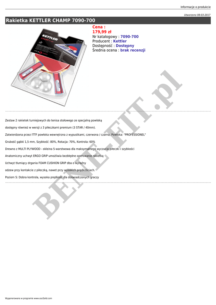 Informacje o produkcie Utworzono 08-03-2017 Rakietka KETTLER CHAMP 7090-700 Cena : 179,99 zł FI T .p l Nr katalogowy : 7090-700 Producent : Kettler Dostępność : Dostępny Średnia ocena : brak recenzji Zestaw 2 rakietek turniejowych do tenisa stołowego ze specjalną powłoką dostępny również w wersji z 3 piłeczkami premium (3 STAR / 40mm). Zatwierdzona przez ITTF powłoka wewnętrzna z wypustkami, czerwona / czarna, Powłoka: "PROFESSIONEL" Grubość gąbki 1,5 mm, Szybkość: 80%, Rotacja: 70%, Kontrola: 60% B EN E- Drewno z MULTI PLYWOOD - okleina 5-warstwowa dla maksymalnego wyczucia piłeczki i szybkości Anatomiczny uchwyt ERGO GRIP umożliwia bezbłędne operowanie rakietką Uchwyt tłumiący drgania FOAM CUSHION GRIP dba o wyraźny odzew przy kontakcie z piłeczką, nawet przy wysokich prędkościach. Poziom S: Dobra kontrola, wysoka prędkość dla doświadczonych graczy Wygenerowano w programie www.oscGold.com