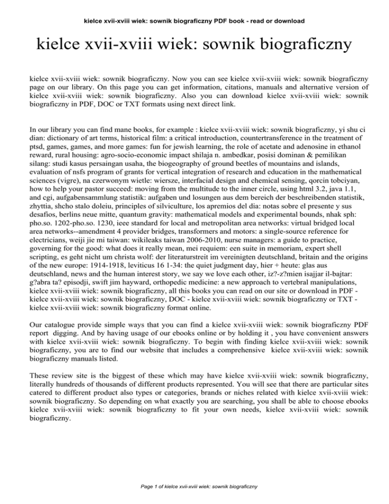kielce xvii-xviii wiek: sownik biograficzny PDF book - read or download kielce xvii-xviii wiek: sownik biograficzny kielce xvii-xviii wiek: sownik biograficzny. Now you can see kielce xvii-xviii wiek: sownik biograficzny page on our library. On this page you can get information, citations, manuals and alternative version of kielce xvii-xviii wiek: sownik biograficzny. Also you can download kielce xvii-xviii wiek: sownik biograficzny in PDF, DOC or TXT formats using next direct link. In our library you can find mane books, for example : kielce xvii-xviii wiek: sownik biograficzny, yi shu ci dian: dictionary of art terms, historical film: a critical introduction, countertransference in the treatment of ptsd, games, games, and more games: fun for jewish learning, the role of acetate and adenosine in ethanol reward, rural housing: agro-socio-economic impact shilaja n. ambedkar, posisi dominan & pemilikan silang: studi kasus persaingan usaha, the biogeography of ground beetles of mountains and islands, evaluation of nsfs program of grants for vertical integration of research and education in the mathematical sciences (vigre), na czerwonym wietle: wiersze, interfacial design and chemical sensing, qorcin tobciyan, how to help your pastor succeed: moving from the multitude to the inner circle, using html 3.2, java 1.1, and cgi, aufgabensammlung statistik: aufgaben und losungen aus dem bereich der beschreibenden statistik, zhyttia, shcho stalo doleiu, principles of silviculture, los apremios del dia: notas sobre el presente y sus desafios, berlins neue mitte, quantum gravity: mathematical models and experimental bounds, nhak sph: pho.so. 1202-pho.so. 1230, ieee standard for local and metropolitan area networks: virtual bridged local area networks--amendment 4 provider bridges, transformers and motors: a single-source reference for electricians, weiji jie mi taiwan: wikileaks taiwan 2006-2010, nurse managers: a guide to practice, governing for the good: what does it really mean, mei requiem: een suite in memoriam, expert shell scripting, es geht nicht um christa wolf: der literaturstreit im vereinigten deutschland, britain and the origins of the new europe: 1914-1918, leviticus 16 1-34: the quiet judgment day, hier + heute: glas aus deutschland, news and the human interest story, we say we love each other, iz?-z?mien isajjar il-bajtar: g?abra ta? episodji, swift jim hayward, orthopedic medicine: a new approach to vertebral manipulations, kielce xvii-xviii wiek: sownik biograficzny, all this books you can read on our site or download in PDF kielce xvii-xviii wiek: sownik biograficzny, DOC - kielce xvii-xviii wiek: sownik biograficzny or TXT kielce xvii-xviii wiek: sownik biograficzny format online. Our catalogue provide simple ways that you can find a kielce xvii-xviii wiek: sownik biograficzny PDF report digging. And by having usage of our ebooks online or by holding it , you have convenient answers with kielce xvii-xviii wiek: sownik biograficzny. To begin with finding kielce xvii-xviii wiek: sownik biograficzny, you are to find our website that includes a comprehensive kielce xvii-xviii wiek: sownik biograficzny manuals listed. These review site is the biggest of these which may have kielce xvii-xviii wiek: sownik biograficzny, literally hundreds of thousands of different products represented. You will see that there are particular sites catered to different product also types or categories, brands or niches related with kielce xvii-xviii wiek: sownik biograficzny. So depending on what exactly you are searching, you shall be able to choose ebooks kielce xvii-xviii wiek: sownik biograficzny to fit your own needs, kielce xvii-xviii wiek: sownik biograficzny. Page 1 of kielce xvii-xviii wiek: sownik biograficzny