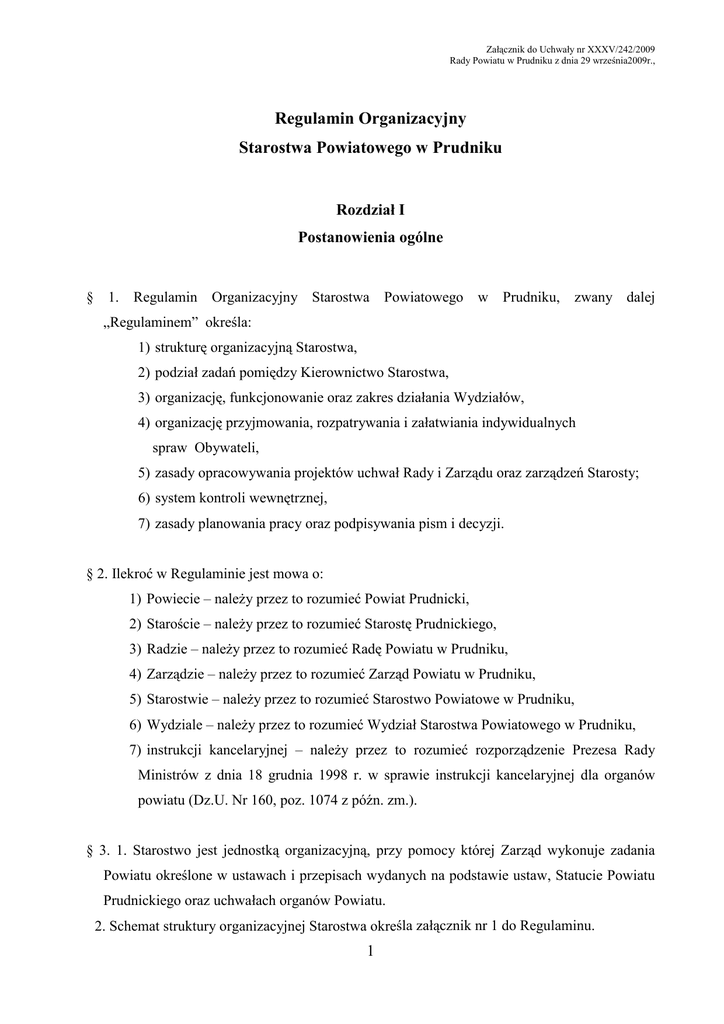 Załącznik do Uchwały nr XXXV/242/2009 Rady Powiatu w Prudniku z dnia 29 września2009r., Regulamin Organizacyjny Starostwa Powiatowego w Prudniku Rozdział I Postanowienia ogólne § 1. Regulamin Organizacyjny Starostwa Powiatowego w Prudniku, zwany dalej „Regulaminem” określa: 1) strukturę organizacyjną Starostwa, 2) podział zadań pomiędzy Kierownictwo Starostwa, 3) organizację, funkcjonowanie oraz zakres działania Wydziałów, 4) organizację przyjmowania, rozpatrywania i załatwiania indywidualnych spraw Obywateli, 5) zasady opracowywania projektów uchwał Rady i Zarządu oraz zarządzeń Starosty; 6) system kontroli wewnętrznej, 7) zasady planowania pracy oraz podpisywania pism i decyzji. § 2. Ilekroć w Regulaminie jest mowa o: 1) Powiecie – naleŜy przez to rozumieć Powiat Prudnicki, 2) Staroście – naleŜy przez to rozumieć Starostę Prudnickiego, 3) Radzie – naleŜy przez to rozumieć Radę Powiatu w Prudniku, 4) Zarządzie – naleŜy przez to rozumieć Zarząd Powiatu w Prudniku, 5) Starostwie – naleŜy przez to rozumieć Starostwo Powiatowe w Prudniku, 6) Wydziale – naleŜy przez to rozumieć Wydział Starostwa Powiatowego w Prudniku, 7) instrukcji kancelaryjnej – naleŜy przez to rozumieć rozporządzenie Prezesa Rady Ministrów z dnia 18 grudnia 1998 r. w sprawie instrukcji kancelaryjnej dla organów powiatu (Dz.U. Nr 160, poz. 1074 z późn. zm.). § 3. 1. Starostwo jest jednostką organizacyjną, przy pomocy której Zarząd wykonuje zadania Powiatu określone w ustawach i przepisach wydanych na podstawie ustaw, Statucie Powiatu Prudnickiego oraz uchwałach organów Powiatu. 2. Schemat struktury organizacyjnej Starostwa określa załącznik nr 1 do Regulaminu. 1 3. Starosta ustala wykaz stanowisk oraz liczbę etatów w Starostwie, które podlegają zatwierdzeniu przez Zarząd. Rozdział II Podział zadań pomiędzy Kierownictwo Starostwa § 4. 1. Pracą Starostwa kieruje Starosta przy pomocy Wicestarosty, Sekretarza i Skarbnika Powiatu. 2. Kierownikiem i zwierzchnikiem słuŜbowym pracowników Starostwa jest Starosta. 3. Starosta sprawuje nadzór nad realizacją zadań przez osoby określone w ust. 1 oraz przez poszczególne Wydziały i samodzielne stanowiska pracy. 4. Starosta bezpośrednio nadzoruje działalność: 1) Wydziałów: a) Wydziału Organizacyjnego, Spraw Obywatelskich i Zarządzania Kryzysowego, w którym funkcjonują: - Referat Administracyjno-Gospodarczy, - Referat Zarządzania Kryzysowego (Powiatowe Centrum Zarządzania Kryzysowego), b) Wydziału Finansowo-BudŜetowego, c) Wydziału Geodezji, Kartografii, Katastru i Gospodarki Nieruchomościami, w którym funkcjonują: - Powiatowy Ośrodek Dokumentacji Geodezyjnej i Kartograficznej( Referat), - Referat Gospodarki Nieruchomościami, 2) samodzielnych stanowisk pracy: a) Pełnomocnika ds. Ochrony Informacji Niejawnych, będącego jednocześnie Naczelnikiem Wydziału Organizacyjnego, Spraw Obywatelskich i Zarządzania Kryzysowego, b) Geodety Powiatowego, będącego jednocześnie Naczelnikiem Wydziału Geodezji, Kartografii, Katastru i Gospodarki Nieruchomościami, c) Powiatowego Rzecznika Konsumentów, d) Audytora Wewnętrznego, e) Kontrolera Wewnętrznego, f) Zespołu Radców Prawnych, g) SłuŜby Bezpieczeństwa i Higieny Pracy. 2 § 5. 1. Wicestarosta, z zastrzeŜeniem ust. 2 działa w zakresie spraw powierzonych mu przez Starostę. 2. W czasie nieobecności lub niemoŜliwości wykonania funkcji przez Starostę, Wicestarosta wykonuje zadania i kompetencje w zakresie kierowania Starostwem. 3. Wicestarosta bezpośrednio nadzoruje Wydziały: 1)Wydział Administracji Budowlanej, 2) Wydział Komunikacji i Transportu, 3) Wydział Ochrony Środowiska, Rolnictwa, Leśnictwa i Gospodarki Wodnej, 4) Wydział Oświaty i Zdrowia, 5) Wydział Programów Rozwojowych, Integracji Europejskiej i Promocji Powiatu, w którym funkcjonuje Powiatowe Centrum Informacji Europejskiej i GospodarczejLokalny Punkt Informacji (Referat), 6) Wydział Infrastruktury Powiatu. § 6. Sekretarz Powiatu przy pomocy Wydziału Organizacyjnego, Spraw Obywatelskich i Zarządzania Kryzysowego, w zakresie ustalonym przez Starostę: 1) zapewnia sprawne funkcjonowanie Starostwa, 2) organizuje pracę Starostwa oraz koordynuje działania Wydziałów i samodzielnych stanowisk pracy, 3) nadzoruje przestrzeganie instrukcji kancelaryjnej w Starostwie, obsługę interesantów, terminowość przygotowywania materiałów, analiz, sprawozdań i informacji, 4) zapewnia sprawne funkcjonowanie Zarządu, Rady, komisji Rady, 5) koordynuje współdziałanie Starostwa z powiatowymi jednostkami organizacyjnymi. § 7. 1. Skarbnik Powiatu jest Głównym Księgowym budŜetu Powiatu i pełni funkcję Naczelnika Wydziału Finansowo – BudŜetowego. 2. Do zadań Skarbnika Powiatu naleŜy w szczególności opracowywanie i wykonywanie budŜetu Powiatu oraz prowadzenie jego gospodarki finansowej. Rozdział III Organizacja, funkcjonowanie oraz zakres działania Wydziałów § 8. W Starostwie funkcjonują Wydziały, referaty i samodzielne stanowiska pracy, które przy oznakowaniu spraw stosują następujące symbole: 3 1)Wydział Organizacyjny, Spraw Obywatelskich i Zarządzania Kryzysowego, Or w którym funkcjonują: a) Referat Administracyjno–Gospodarczy, b) Referat Zarządzania Kryzysowego ( Powiatowe Centrum Zarządzania Kryzysowego) 2)Wydział Finansowo – BudŜetowy FB 1) Wydział Ochrony Środowiska,Rolnictwa, Leśnictwa i Gospodarki Wodnej RO 4) Wydział Geodezji, Kartografii, Katastru i Gospodarki Nieruchomościami, GK w którym funkcjonują: a) Powiatowy Ośrodek Dokumentacji Geodezyjnej i Kartograficznej (Referat) b) Referat Gospodarki Nieruchomościami 5) Wydział Oświaty i Zdrowia OZ 6) Wydział Administracji Budowlanej AB 7) Wydział Komunikacji i Transportu KT 8) Wydział Programów Rozwojowych,Integracji Europejskiej i Promocji Powiatu, PP w którym funkcjonuje Powiatowe Centrum Informacji Europejskiej i Gospodarczej-Lokalny Pun
