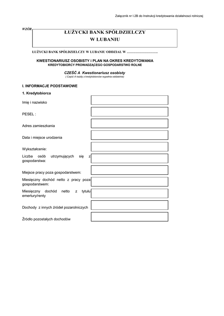 Załącznik nr I.2B do Instrukcji kredytowania działalnosci rolniczej WZÓR ŁUŻYCKI BANK SPÓŁDZIELCZY W LUBANIU ŁUŻYCKI BANK SPÓŁDZIELCZY W LUBANIU ODDZIAŁ W ………………………. KWESTIONARIUSZ OSOBISTY i PLAN NA OKRES KREDYTOWANIA KREDYTOBIORCY PROWADZĄCEGO GOSPODARSTWO ROLNE CZEŚĆ A Kwestionariusz osobisty ( Część A każdy z kredytobiorców wypełnia oddzielnie) I. INFORMACJE PODSTAWOWE 1. Kredytobiorca Imię i nazwisko PESEL : Adres zamieszkania Data i miejsce urodzenia Wykształcenie: Liczba osób gospodarstwa: utrzymujących się z Miejsce pracy poza gospodarstwem: Miesięczny dochód netto z pracy poza gospodarstwem: Miesięczny dochód emertury/renty netto z tytułu Dochody z innych źródeł pozarolniczych Źródło pozostałych dochodów Załącznik nr I.2B do Instrukcji kredytowania działalnosci rolniczej 2.Imię i nazwisko współmałżonka: PESEL : Adres zamieszkania Data i miejsce urodzenia Wykształcenie: Miejsce pracy poza gospodarstwem: Miesięczny dochód netto z pracy poza gospodarstwem: Miesięczny dochód emertury/renty netto z tytułu Dochody z innych źródeł pozarolniczych Źródło pozostałych dochodów Załącznik nr I.2B do Instrukcji kredytowania działalnosci rolniczej II.MAJĄTEK OSOBISTY 1. Posiadane nieruchomości (inne niż gospodarstwo rolne): Rodzaj i adres KW nr Wartość w tys. PLN Obciążenia Ubezpiecz enie (tak/nie) 2. Posiadane rachunki bankowe, lokaty, oszczędności, papiery wartościowe: Nazwa i adres Banku Rodzaj posiadanego rachunku Wartość (np. lokaty) w tys. PLN 3. Pożyczki udzielone: Nazwisko dłużnika 4. Inny majątek osobisty : Rodzaj Kwota pożyczki w tys. zł Ostateczny termin spłaty Wartość w tys PLN Obciążenia Ubezpieczenie Załącznik nr I.2B do Instrukcji kredytowania działalnosci rolniczej IV. INFORMACJA O ZOBOWIĄZANIACH KREDYTOBIORCY 1. Kredyty i pożyczki: Nazwa Banku pożyczkodawcy Kwota pozostała do spłaty (w tys. zł) Ostateczny termin spłaty Prawne zabezpiec Stopa % 2. Udzielone poręczenia i inne zobowiązania: Rodzaj zobowiązania Wartość do zapłaty w tys. PLN Termin zakończenia zobowiązania Dane osobowe, zawarte w niniejszym kwestionariuszu, Bank będzie przetwarzać wyłącznie w celu zawarcia i realizacji przedmiotowej transakcji, oraz działań marketingowych, i nie będzie udostępniać innym podmiotom, z wyjątkiem podmiotów i okoliczności ich ujawnienia przewidzianych w ustawie z dnia 29 sierpnia 1997 r. Prawo bankowe (tekst jednolity Dz. U. z 2002 r. Nr 72, poz. 665 z późn. zm.), oraz innych przepisach powszechnie obowiązujących. Bank informuje niniejszym o prawie osoby udostępniającej swoje dane do wglądu do danych oraz ich poprawiania zgodnie z art. 32-35 ustawy o ochronie danych osobowych. Dane zostały podane dobrowolnie. Oświadczam pod rygorem odpowiedzialności karnej przewidzianej w art. 297 § 1 Kodeksu karnego, że informacje podane w tym kwestionariuszu są zgodne ze stanem faktycznym. miejscowość, data /podpis osoby składającej kwestionariusz/ Za��cznik I.2B do Instrukcji cz.I grunty rolne Wyposażenie gospodarstwa w 1. Grunty rolne Stan na ……………….. Własne Dzierżawione Klasy Grunty Plantacje ziemi GO orne wieloletnie ha ha Sady Grunty orne Plantacje wieloletnie Sady ha ha ha ha I II IIIa III b IV a IV b V VI INNE RAZEM WARTOŚĆ OGÓŁEM Sporządził: Data 5 Za��cznik I.2B do Instrukcji cz.I śr. trwałe Imię i nazwisko Wnioskodawcy: 2.1 Budynki i budowle Lp. Rodzaj Rok budowy Szacunkowa wartość w tys. zł Modernizacje i remonty Rok Zakres 1. 2. 3. 4. 5. 6. 7. Razem: 2.2. Maszyny i urządzenia Wyszczególnienie Lp. Rok Szacunkowa wartość produkcji w tys. zł 1. 2. 3. 4. 5. 6. 7. 8. 9. 10. 11. 12. 13. 14. 15. 16. 17. 18. 19. 20. Razem: Sporządził: Data 6 Stan techniczny Za��cznik I.2B do Instrukcji cz.I produkcja roślinna Imię i nazwisko Wnioskodawcy: Produkcja roślinna (plan) w tys. zł 2006 Uprawy przeznaczone na sprzedaż 2005 Lp. Wyszczególnienie (rodzaj produkcji) I. Sprzedaż produkcji roślinnej Uprawy przeznaczone na sprzedaż 2007 Uprawy przeznaczone na sprzedaż 1. Powierzchnia w ha 2. Plon dt/ha 3. Produkcja (zbiór) w dt 4. Zużycie wewnętrzne w dt 5. Cena za dt w zł 6. Wartość sprzedaży Koszty bezpośrednie II. 8. Nasiona zł/ha 9. Nawozy zł/ha 10. Środki ochrony roślin w zł/ha 11. Usługi zł/ha 12. Inne koszty bezpośrednie zł/ha 13. Razem koszty bezpośrednie zł/ha 14. Koszty bezpośrednie ogółem(1*13) Nadwyżka bezpośrednia z produkcji roślinnej Wartość nadwyżki bezpośredniej w zł Wartość sprzedaży produkcji roślinnej ogółem Nadwyżka bezpośrednia z produkcji roślinnej Koszty bezpośrednie produkcji pasz Lp. Wyszczególnienie (rodzaj produkcji) 2004 2005 2006 Uprawy przeznaczone na paszę Uprawy przeznaczone na paszę Uprawy przeznaczone na paszę Produkcja roślinna w dt 1. Powierzchnia w ha 2. Plon dt/ha Koszty bezpośrednie II. 7. Nasiona zł/ha 8. Nawozy zł/ha 9. Środki ochrony roślin w zł/ha 10. Usługi zł/ha 11. Inne koszty bezpośrednie zł/ha 12. Razem koszty bezpośrednie zł/ha I. 13. Koszty bezpośrednie ogółem (1*12) Roczna produkcja pasz własnych w dt Roczna produkcja pasz własnych w dt Roczna produkcja pasz własnych w dt Koszty bezpośrednie produkcji pasz w zł Koszty bezpośrednie produkcji pasz w zł Koszty bezpośrednie produkcji pasz w zł 7 Za��cznik I.2B do Instrukcji cz.I 2008 Uprawy przeznaczone na sprzedaż produkcja roślinna 2009 Uprawy przeznaczone na sprzedaż 2007 2008 Uprawy przeznaczone na paszę Uprawy przeznaczone na paszę 0,00 Roczna produkcja pasz własnych w dt Roczna produkcja pasz własnych w dt Koszty bezpośrednie produkcji pasz w zł Koszty bezpośrednie produkcji pasz w zł Sporządził: Data 8 Za��cznik I.2B do Instrukcji cz.I produkcja zwierzęca Imię i nazwisko Wnioskodawcy: Produkcja zwierzęca ( plan) w tys. zł 2005 Sprzedaż produktów Ilość Jednostka 2006 cena w zł/jed wartość Jednostka Razem: