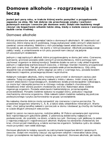 Domowe alkohole – rozgrzewają i leczą Jesień jest porą roku, w trakcie której warto pomyśleć o przygotowaniu zapasów na zimę. Nic tak dobrze nie przechowuje smaku i wartości jesiennych warzyw i owoców jak domowe weki. Dzięki nim będziemy mogli cieszyć się bogactwem witamin także zimą, kiedy o świeże owoce i warzywa będzie coraz trudniej. Domowe alkohole Wśród przetworów warto pamiętać także o domowych alkoholach. W zależności od owoców, które staną się ich podstawą, mogą wykazywać wiele cennych właściwości i zawierać cenne witaminy. Niektóre z nich posiadają nawet właściwości lecznicze. Oczywiście, jak ze wszystkim, nie warto z nimi przesadzać. Alkohole posiadają swoje zalety i wady, a umiarkowanie w ich piciu pozwoli nam cieszyć się jedynie ich pozytywnym działaniem. Jednym z najczęstszych alkoholi, które przygotowujemy w domu jest wino. Czerwone, wytrawne, gronowe posiada wiele cennych przeciwutleniaczy, które pomogą nam zachować organizm w dobrej kondycji. Świetnie działa na serce i cały układ krążenia. Jednym z najbardziej wartościowych owoców, z którego również możemy przygotować wino jest czarny bez. Tak jak gronowe posiada wiele przeciwutleniaczy. Gdy zimą dopadnie nas przeziębienie, warto sięgnąć po wino z czarnego bzu, posiada bowiem właściwości napotne, przeciwgorączkowe i wykrztuśne. Kolejnym rodzajem alkoholu, który możemy sami zrobić w domowym zaciszu jest nalewka. Tutaj szczególnie polecamy nalewki z imbiru i aloesu. Imbir znany jest ze swoich właściwości rozgrzewających, dodatkowo działa przeciwzapalnie i odkażająco, co może być niezwykle pomocne w różnego rodzaju stadiach chorobowych. Dodatkowo imbir obniża poziom cholesterolu we krwi. Natomiast aloes świetnie regeneruje organizm. Posiada właściwości bakteriobójcze, przeciwzapalne, przeciwbólowe. Ponadto świetnie wpływa na wygląd skóry, pobudza i reguluje mechanizmy obronne organizmu. Obie nalewki zatem świetnie nadadzą się podczas podwyższonego ryzyka zachorowania na grypę i przeziębienie. Na nalewkę równie dobrze może sprawdzić się czerwona i czarna porzeczka. To prawdziwe bogactwo witaminy C, A, B, a także wielu składników mineralnych. Warto mieć, choć jedną karafkę nalewki z porzeczek w domu i dodawać ją choćby do herbaty w czasie długich zimowych wieczorów. Jesień to sezon na nasze pyszne, rodzime jabłka. W Polsce uprawiana jest ogromna ilość najróżniejszych gatunków jabłek. Z pewnością dobierzemy najlepsze na podwieczorek, do szarlotki, na dżem, a także na cydr. Domowy cydr jabłkowy to jeden z najsmaczniejszych i najzdrowszych alkoholi. Wpływa na obniżenie cholesterolu we krwi, chroni przed miażdżycą, a także wzmacnia organizm. Szklanka cydru do obiadu może przynieść nam wiele dobrego. Domowe alkohole to kolejny sposób na zatrzymanie bogactwa letnich i jesiennych owoców. Dzięki nim możemy cieszyć się ogromem witamin i minerałów także zimą. Grypa i przeziębienie nie będzie już więcej nas niepokoić. Domowe alkohole, jak każde, mogą jednak prowadzić do uzależnienia. Zachowując umiar będziecie mogli cieszyć się nie tylko ich wspaniałym smakiem, ale także wszystkimi cennymi właściwościami, które mają Wam do zaoferowania. Author: Bonavita.pl Link do artykułu: http://bonavita.pl/domowe-alkohole-rozgrzewaja-i-lecza