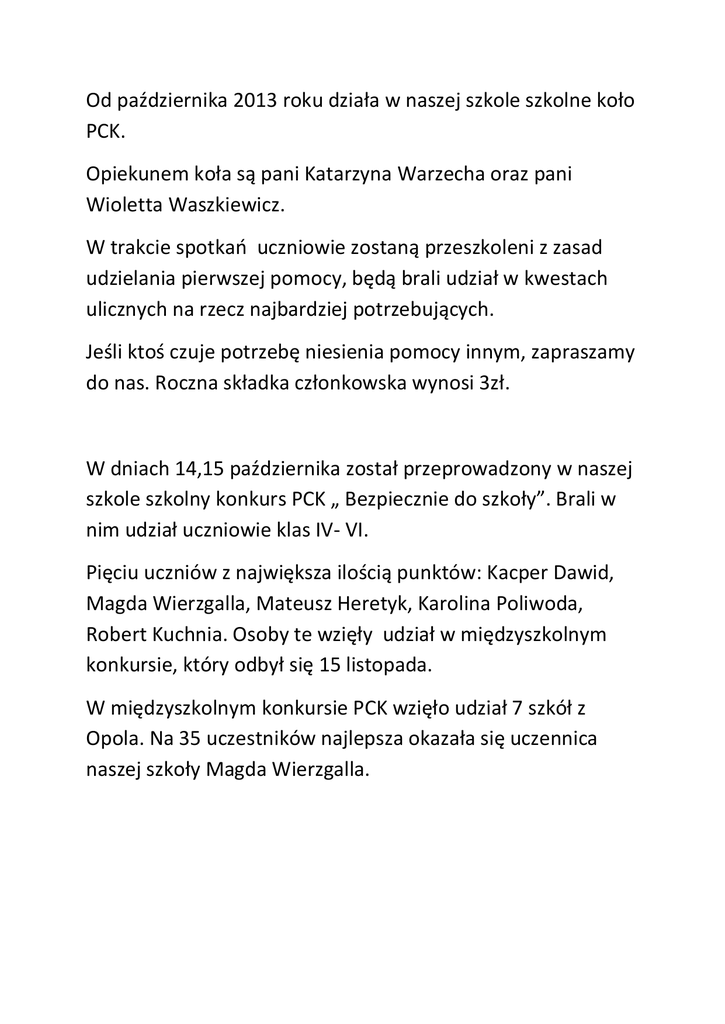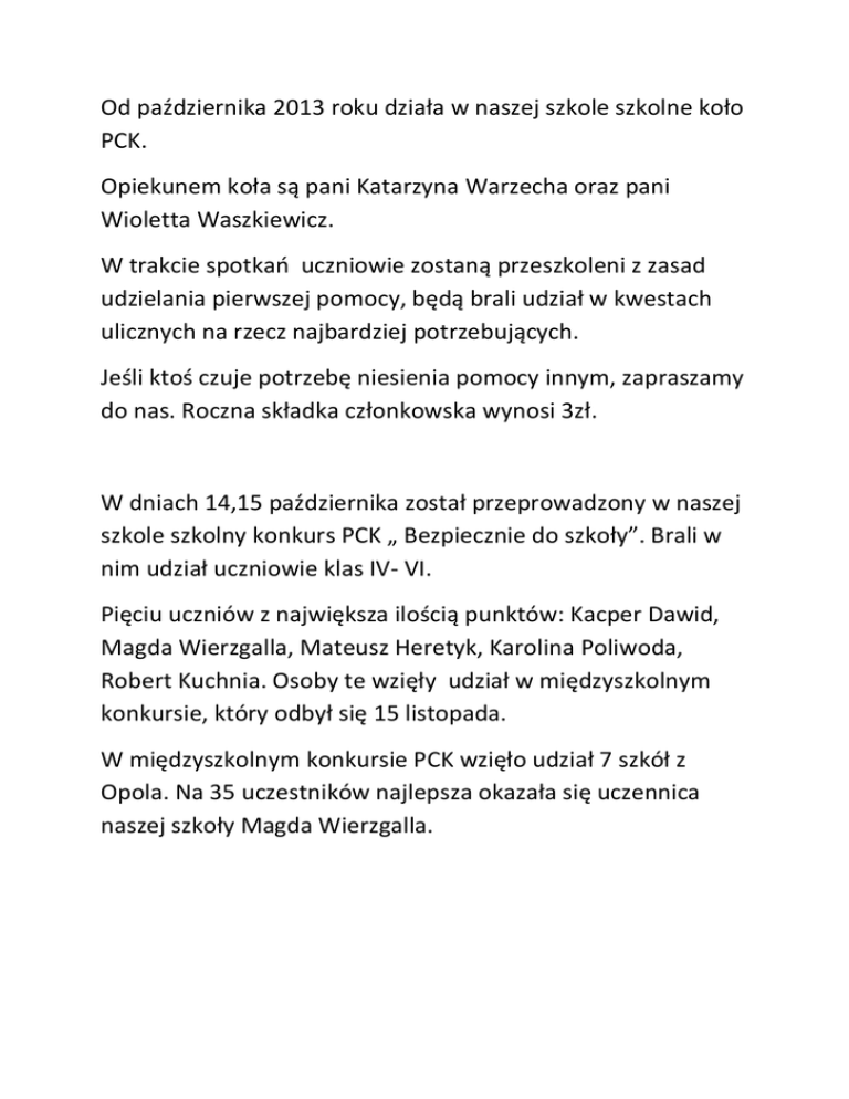 Od października 2013 roku działa w naszej szkole szkolne koło PCK. Opiekunem koła są pani Katarzyna Warzecha oraz pani Wioletta Waszkiewicz. W trakcie spotkao uczniowie zostaną przeszkoleni z zasad udzielania pierwszej pomocy, będą brali udział w kwestach ulicznych na rzecz najbardziej potrzebujących. Jeśli ktoś czuje potrzebę niesienia pomocy innym, zapraszamy do nas. Roczna składka członkowska wynosi 3zł. W dniach 14,15 października został przeprowadzony w naszej szkole szkolny konkurs PCK „ Bezpiecznie do szkoły”. Brali w nim udział uczniowie klas IV- VI. Pięciu uczniów z największa ilością punktów: Kacper Dawid, Magda Wierzgalla, Mateusz Heretyk, Karolina Poliwoda, Robert Kuchnia. Osoby te wzięły udział w międzyszkolnym konkursie, który odbył się 15 listopada. W międzyszkolnym konkursie PCK wzięło udział 7 szkół z Opola. Na 35 uczestników najlepsza okazała się uczennica naszej szkoły Magda Wierzgalla.