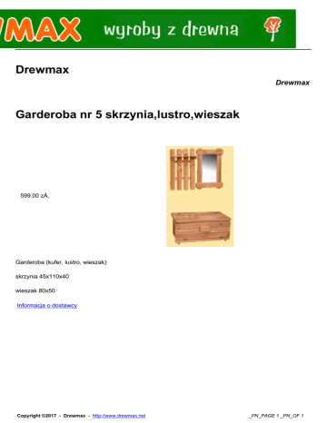Drewmax Drewmax Garderoba nr 5 skrzynia,lustro,wieszak 599.00 zÅ‚ Garderoba (kufer, lustro, wieszak) skrzynia 45x110x40 wieszak 80x50 Informacja o dostawcy Copyright ©2017 - Drewmax - http://www.drewmax.net _PN_PAGE 1 _PN_OF 1