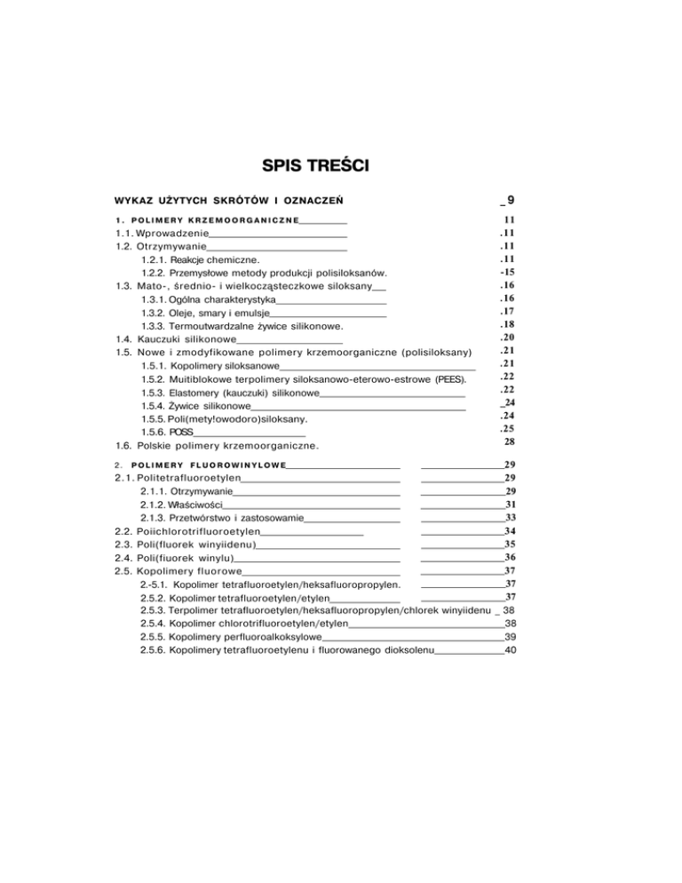 SPIS TREŚCI WYKAZ UŻYTYCH SKRÓTÓW I OZNACZEŃ _9 1. POLIMERY KRZEMOORGANICZNE 11 .11 .11 .11 -15 .16 .16 .17 .18 .20 .21 .21 .22 .22 _24 .24 .25 28 1.1. Wprowadzenie 1.2. Otrzymywanie 1.2.1. Reakcje chemiczne. 1.2.2. Przemysłowe metody produkcji polisiloksanów. 1.3. Mato-, średnio- i wielkocząsteczkowe siloksany 1.3.1. Ogólna charakterystyka 1.3.2. Oleje, smary i emulsje 1.3.3. Termoutwardzalne żywice silikonowe. 1.4. Kauczuki silikonowe 1.5. Nowe i zmodyfikowane polimery krzemoorganiczne (polisiloksany) 1.5.1. Kopolimery siloksanowe 1.5.2. Muitiblokowe terpolimery siloksanowo-eterowo-estrowe (PEES). 1.5.3. Elastomery (kauczuki) silikonowe 1.5.4. Żywice silikonowe 1.5.5. Poli(mety!owodoro)siloksany. 1.5.6. POSS 1.6. Polskie polimery krzemoorganiczne. 29 2.1. Politetrafluoroetylen 29 29 2.1.1. Otrzymywanie 31 2.1.2. Właściwości 33 2.1.3. Przetwórstwo i zastosowamie 34 2.2. Poiichlorotrifluoroetylen 35 2.3. Poli(fluorek winyiidenu) 36 2.4. Poli(fiuorek winylu) 37 2.5. Kopolimery fluorowe 37 2.-5.1. Kopolimer tetrafluoroetylen/heksafluoropropylen. 37 2.5.2. Kopolimer tetrafluoroetylen/etylen 2.5.3. Terpolimer tetrafluoroetylen/heksafluoropropylen/chlorek winyiidenu _ 38 2.5.4. Kopolimer chlorotrifluoroetylen/etylen 38 2.5.5. Kopolimery perfluoroalkoksylowe 39 2.5.6. Kopolimery tetrafluoroetylenu i fluorowanego dioksolenu 40 2. POLIMERY FLUOROWINYLOWE 2.6. Kauczuki fluorowe 2.7. Polimery fluorowinylowe i ich pochodne 3. POLIMERY P O C H O D Z E N I A NATURALNEGO 40 41 „____ 45 3.1. Wprowadzenie 3.2. Polisacharydy 3.2.1. Celuloza i jej pochodne 3.2.1.1. Celuloza naturalna 3.2.1.2. Celuloza regenerowana 3.2.1.3. Estry celulozy 3.2.1.4. Etery celulozy 3.2.1.5. Szczepione kopolimery celulozy 3.2.1.6. Celuloza usieciowana 3.2.2. Skrobia i jej pochodne 3.2.2.1. Rodzaje skrobi 3.2.2.2. Budowa skrobi 3.2.2.3. Procesy chemicznej modyfikacji skrobi 3.2.2.4. Najnowsze prace nad modyfikacją skrobi 45 45 45 45 46 48 51 53 54 55 55 57 58 63 3.2.3. Inteligentne pestycydy i nawozy sztuczne 3.2.4. Inne polisacharydy i ich pochodne 3.3. Białka 3.4. Kauczuk naturalny i jego pochodne 66 68 69 70 4. POLIMERY B I O D E G R A D O W A L N E 73 4 . 1 . Wprowadzenie 4.2. Biodegradowalne polimery pochodzenia naturalnego 4.2.1. Rodzaje biodegradowalnych polimerów 4.2.2. Koło życia (LCA) foli celulozopochodnej 4.3. Biorozkładalne tworzywa sztuczne 4.4. Biodegradowalne polimery syntetyczne 4.5. Polilaktyd 4.5.1. Metody otrzymywania 4.5.2. Folia PLA wytwarzana przez wytłaczanie 4.6. Polikaprolaktony 4.7. Prognozy rozwoju biorozkładalnych i biodegradowalnych tworzyw polimerowych 73 74 74 76 80 83 84 84 86 88 5. POLIAMIDY AROMATYCZNE I SPECJALNE 5.1. Poliamidy aromatyczne (aramidy) 5.1.1. Wiadomości ogólne 5.1.2. Krystaliczne poliamidy aromatyczne 5.1.3. Amorficzne poliamidy aromatyczne 5.2. Poliamidy alifatyczno-aromatyczne 5.2.1. Ultramid T 5.2.2. Poliftalamidy 5.3. Termoplastyczne elastomery poliamidowe 89 95 95 95 96 99 103 103 105 112 5.3.1. Struktura i ogólne właściwości 112 5.3.2. Poliamidowe nanokompozyty 115 5.3.3. Poliamidy otrzymywanie i przetwarzanie techniką wtrysku reaktywnego 116 6. POLliMIDY 6.1. Wprowadzenie 6.2. Klasyczne poliimidy kondensacyjne 6.2.1. Otrzymywanie 6.2.2. Właściwości i zastosowanie 6.3. Kopoliimidy 6.3.1. Polioksadiazobenzimidazole 6.3.2. Polibenzimidazole 6.4 Aromatyczne poliimidy o strukturze drabiniastej 6.5 Termoplastyczne poliimidy 6.6 Pol bismaieimidy 6.7 Pol amidoimidy 6.8 Pol eteroimidy 6.9 Pol akryloestroimidy 119 119 119 119 123 125 125 125 126 126 127 128 132 133 7. Ż Y W I C E B E Z F O R M A L D E H Y D O W E 135 7.1. Szkodliwość formaldehydu 135 7.2. Pochodne skrobi jako efektywne czynniki wychwytujące formaldehyd 137 7.3. Izocyjaniany i poliuretany jako czynniki zastępujące żywice formaldehydowe _ 139 7.3.1. Izocyjanian PMDI 139 7.3.2. Izocyjanian PMDI modyfikowany poliolami 140 7.3.3. Uniepalnione glikole do produkcji klejów 141 7.3.4. Produkty recyklingu poliuretanów jako czynnik wiążący płyty wiórowe _ 142 7.3.5. Alternatywne poliuretany na bazie oleju rycynowego - kleje do produkcji sklejki drewnopochodnej 143 7.4. Zastosowanie produktów naturalnych (ligniny, taniny i oleju sojowego) 144 7.5. Niektóre aspekty unieszkodliwiania formaldehydu 146 8 . P O L I M E R Y SPECJALNE Z A W I E R A J Ą C E A Z O T 149 8.1. Poli-N-winylokarbazol 8.2. Poliwinylopirydyny 8.3. Poli-N-winyiopirolidon 8.4. Poli(kwas asparaginowy) i jego pochodne 149 150 150 151 9. P O L I M E R Y CYKLICZNYCH T L E N K Ó W A L K I L E N O W Y C H (POLIETERY) 153 9.1. Wprowadzenie 9.2. Poli(tlenek etylenu) i poli(tlenek propylenu) 9.3. Poii-3,3-bis(chlorometylo) oksacyklobutan 9.3.1. Otrzymywanie 9.3.2. Właściwości, przetwórstwo i zastosowanie 9.4. Politetrahydrofuran 9.5. Polioksyfenyleny (aromatyczne polietery) 153 154 156 156 156 158 158 . 10. P O L I M E R Y T E R M O S T A B I L N E I T E R M O O D P O R I M E . 10.1. Termostabilność 10.2. Polimery termoodporne 10.3. Liniowe polimery aromatyczne 10.3.1. Poii(p-fenylen) 10.3.2. Poli(p-ksylilen) 10.4. Aromatyczne polimery termoplastyczne z grupami funkcyjnymi. 10.4.1. Polibezwodniki aromatyczne 10.4.2. Polisulfidy aromatyczne 10.4.3. Polisulfony aromatyczne 10.4.3.1. Otrzymywanie 10.4.3.2. Właściwości, przetwarzanie i zastosowanie 10.4.3.3. Mieszaniny polisulfonów (blendy polimerowe) 10.4.3.4. Polisulfony na bazie bisfenolu C 10.4.3.5. Poliaryloeterosulfony 10.4.4. Polieteroketony aromatyczne. 10.4.4.1. Otrzymywanie 10.4.4.2. Poli(eteroeteroketon) 10.4.4.3. Struktura i ogólne właściwości. 10.4.4.4. Przetwarzanie 10.4.4.5. Zastosowanie 10.5. Aromatyczne polimery heterocykliczne 10.5.1. Polibenzimidazole 10.5.2. Polibenzoksazole i polibenztiazole. 10.5.3. Polihydantoiny 10.6. Polimery o strukturze drabiniastej 10.7. Polimery termoutwardzalne o dużej termostabilności 10.7.1. Żywice polistyrylopirydynowe 10.7.2. Żywice polifenylochinoksalinowe. 10.7.3. Żywice polibenzimidazolowe 10.7.4. 