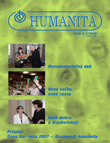 číslo 2-3/2008 ročník XVII Nezabudnuteľný deň Nové voľby, nové výzvy Hold dobru a šľachetnosti Príloha: Cena Dar roka 2007 - Osobnosti humanity Nech im Drago pomáha Čas ďakovania Stalo sa tradíciou, že slovenskí paralympionici odchádzajú na paralympijské hry s vlastným maskotom. Jeho námet sa už tretíkrát zrodil v detskej výtvarnej súťaži Mesiac detskej tvorby, ktorú každoročne organizuje Združenie Korytnačky v spolupráci s Nadáciou SPP a Slovenským paralympijským výborom. Krst maskota sa nedávno konal v priestoroch Slovenského plynárenského priemyslu v Bratislave, ktorý je už piaty rok generálnym partnerom slovenských paralympionikov. Krstnými rodičmi maskota sa stali predseda predstavenstva SPP Philippe Boucly a štátna tajomníčka Ministerstva školstva SR Bibiána Obrimčáková. Autorkou námetu maskota Draga je štrnásťročná Andrejka Sasáková, ktorej kresbu spomedzi detských prác súťaže hendicapovaných detí porota vybrala ako víťaznú. Andrejka je žiačkou 5. ročníka špeciálnej triedy v Základnej škole s materskou školou v Helcmanovciach, v okrese Gelnica. Je skromná, tichá, ale veľmi šikovná. Tento rok vyhrala aj v okresnej súťaži „Vesmír očami detí“. Andrejkin námet prepracoval do súčasnej podoby výtvarník Vladimír Král a rozkreslil ho aj do ďalších 10 motívov, ktoré predstavujú športy, v ktorých budú slovenskí reprezentanti súťažiť na XIII. paralympijských hrách v Pekingu. Čas bilancovania úspechov, neúspechov, plusov a mínusov minulého roku je už dávno za nami a s nimi aj chvíle, v ktorých sme si uvedomili, že sme zasa starší, skúsenejší, múdrejší. Ale po bilancovaní prichádza zvyčajne aj čas ďakovania - niekomu za nádej, inému za inšpiráciu, dobrý nápad, ktorý mnohým iným pomohol lepšie, dôstojne žiť a mnohým za podporu a pomoc, ktorá prišla ako na zavolanie, neraz v poslednej chvíli. O niektorých z činov, za ktoré patrí ich nositeľom vďaka, sme počuli a čítali v médiách. Oveľa viac šľachetných, dobročinných skutkov však zostalo verejnosti neznámych, takmer nikto nikde o nich nepočul ani nečítal. Mnohé z nich by však nemali celkom zapadnúť do zabudnutia len preto, že sú skryté často v tých nejneuveriteľnejších príbehoch, aké píše sám život. Mám na mysli skutky nekonečnej obetavosti, ľudskosti, odhodlania, odvahy, trpezlivosti, pracovitosti a statočnosti. Za mnohé sme nestihli poďakovať vôbec, za niektoré sme ďakovali len vduchu. Mnohokrát sa aj chceme aspoň slovami odvďačiť, ale ten, kto si vďaku zaslúži, chce zostať neznámy, anonymný darca, podporovateľ či dokonca záchranca života. Práve takéto činy šľachetnej, nezištnej pomoci Slovenská Humanitná rada Ivan Sýkora každoročne vyzdvihuje a sníma Prezident Slovenskej z nich aj závoj tajomstva, ktohumanitnej rady rým sú mnohé z nich zahalené. Čas ďakovania Slovenskej humanitnej rady spojený s udelením ceny Dar roka 2007 sa uskutočnil 17. júna tohto roku. Nielen pre Slovenskú Humanitnú radu to bol veľký, slávnostný deň, jeden z najkrajších v roku. Žiaľ, nikdy sa nám, pochopiteľne, nepodarilo morálne oceniť všetkých, ktorí by si ocenenie spoločnosti zaslúžili. Ani kronika najšľachetnejších činov zatiaľ neexistuje, hoci, mnohé z nich by si boli zaslúžili záznam do nej, a to zlatým písmom. Takmer každý deň chcú mnohí z nás opäť niekomu za niečo aspoň ďakovať. A nielen preto, že sa to patrí. Často ide o skutok nesmiernej hodnoty, ktorý sa nedá vyčísliť peniazmi, ktorého prospešnosť ukáže čas. Nezabúdajme na to, keď sa staneme svedkami, ako niekto niekomu podal pomocnú ruku alebo poskytol materiálny či finančný dar človeku, odkázanému na pomoc iných či dokonca zachránil niekomu život. A keď zasa budeme o rok starší, skúsenejší a múdrejší, spomeňme si na tých, ktorí pomáhajú, obetujú sa a nič za to nežiadajú želajúc si len, aby aj tým, ktorým je zle, bolo raz lepšie, aby bol aj ich život krajší, kvalitnejší. Ak nám po prečítaní týchto riadkov napíšte o takýchto ľuďoch a ich skutkoch hodných vďaky a pošlete svoj návrh na ocenenie Dar roka 2008 Slovenskej humanitnej rade, urobíte dobre. Svoj návrh nám môžete poslať hoci už aj dnes. Pri príležitosti krstu maskota Draga vystúpili so svojím umením aj dva tanečné páry: Peter Vidašič s partnerkou Helenou Kašickou a Ján Puchein s partnerkou Miroslavou Sekaninovou. Peter Vidašič je známy z televízneho programu Bailando, kde tancoval spolu s Alenou Heribanovou, moderátorkou krstu maskota. Je trénerom a vedúcim klubu TK Ellegance Košice. Členovia tohoto klubu tancujú už dlhšie spoločne aj s vozíčármi a majú z ich úspechov veľkú radosť. Na krste maskota nechýbali ani športovci, ktorí na paralympiáde už v minulosti vybojovali zlatú medailu. Boli to: Ján Riapoš, ktorý získal zlato v roku 2004 v Athénach v stolnom tenise, Ladislav Gáspár, takisto zlatý medailista ako Ján Riapoš, Marek Margoč, ktorý priniesol domov zlato ako víťaz v disciplíne vo vrhu guľou v roku 2004 na Paralympiáde v Athénach, Alena Kánová, držiteľka zlatej medaily, ktorú získala na Paralympiáde v Sydney v roku 2000 a Andrej Zaťko, ktorí získal zlatú medailu na Paralympiáde v Atlante roku 1996. Držíme im palce, aby sa im z Pekingu podarilo doniesť ďalšie zlaté medaily. Nech im v tom aj Drago pomáha. (mš) Snímky: autorka 2 Cena Dar roka 2007 už trinásty raz Nezabudnuteľný deň Primátor hlavného mesta Bratislavy, Andrej Ďurkovský. Bol krásny, slnečný deň, 17. júna tohto roku. Pre Slovenskú humanitnú radu, jej sympatizantov, vzácnych hostí a jej spolupracovníkov, ale najmä pre hlavných laureátov, laureátov, ktorí si prišli prevziať do bratislavského Primaciálneho paláca Cen