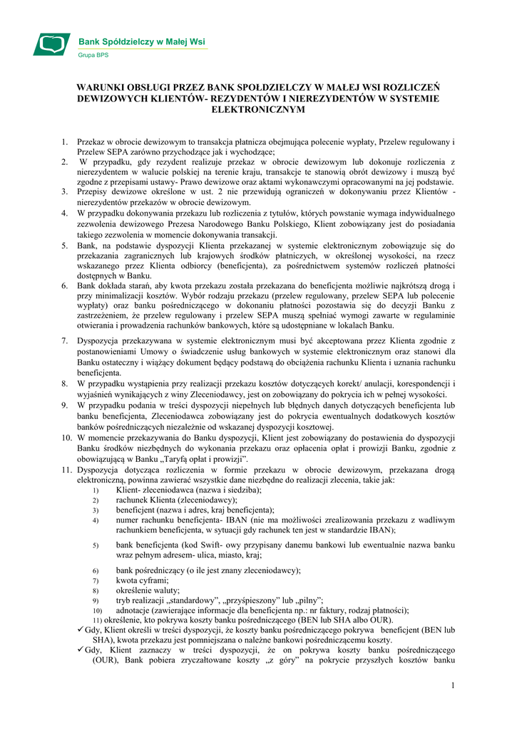 Bank Spółdzielczy w Małej Wsi ——————————————— Grupa BPS WARUNKI OBSŁUGI PRZEZ BANK SPOŁDZIELCZY W MAŁEJ WSI ROZLICZEŃ DEWIZOWYCH KLIENTÓW- REZYDENTÓW I NIEREZYDENTÓW W SYSTEMIE ELEKTRONICZNYM 1. 2. 3. 4. 5. 6. Przekaz w obrocie dewizowym to transakcja płatnicza obejmująca polecenie wypłaty, Przelew regulowany i Przelew SEPA zarówno przychodzące jak i wychodzące; W przypadku, gdy rezydent realizuje przekaz w obrocie dewizowym lub dokonuje rozliczenia z nierezydentem w walucie polskiej na terenie kraju, transakcje te stanowią obrót dewizowy i muszą być zgodne z przepisami ustawy- Prawo dewizowe oraz aktami wykonawczymi opracowanymi na jej podstawie. Przepisy dewizowe określone w ust. 2 nie przewidują ograniczeń w dokonywaniu przez Klientów nierezydentów przekazów w obrocie dewizowym. W przypadku dokonywania przekazu lub rozliczenia z tytułów, których powstanie wymaga indywidualnego zezwolenia dewizowego Prezesa Narodowego Banku Polskiego, Klient zobowiązany jest do posiadania takiego zezwolenia w momencie dokonywania transakcji. Bank, na podstawie dyspozycji Klienta przekazanej w systemie elektronicznym zobowiązuje się do przekazania zagranicznych lub krajowych środków płatniczych, w określonej wysokości, na rzecz wskazanego przez Klienta odbiorcy (beneficjenta), za pośrednictwem systemów rozliczeń płatności dostępnych w Banku. Bank dokłada starań, aby kwota przekazu została przekazana do beneficjenta możliwie najkrótszą drogą i przy minimalizacji kosztów. Wybór rodzaju przekazu (przelew regulowany, przelew SEPA lub polecenie wypłaty) oraz banku pośredniczącego w dokonaniu płatności pozostawia się do decyzji Banku z zastrzeżeniem, że przelew regulowany i przelew SEPA muszą spełniać wymogi zawarte w regulaminie otwierania i prowadzenia rachunków bankowych, które są udostępniane w lokalach Banku. Dyspozycja przekazywana w systemie elektronicznym musi być akceptowana przez Klienta zgodnie z postanowieniami Umowy o świadczenie usług bankowych w systemie elektronicznym oraz stanowi dla Banku ostateczny i wiążący dokument będący podstawą do obciążenia rachunku Klienta i uznania rachunku beneficjenta. 8. W przypadku wystąpienia przy realizacji przekazu kosztów dotyczących korekt/ anulacji, korespondencji i wyjaśnień wynikających z winy Zleceniodawcy, jest on zobowiązany do pokrycia ich w pełnej wysokości. 9. W przypadku podania w treści dyspozycji niepełnych lub błędnych danych dotyczących beneficjenta lub banku beneficjenta, Zleceniodawca zobowiązany jest do pokrycia ewentualnych dodatkowych kosztów banków pośredniczących niezależnie od wskazanej dyspozycji kosztowej. 10. W momencie przekazywania do Banku dyspozycji, Klient jest zobowiązany do postawienia do dyspozycji Banku środków niezbędnych do wykonania przekazu oraz opłacenia opłat i prowizji Banku, zgodnie z obowiązującą w Banku „Taryfą opłat i prowizji”. 11. Dyspozycja dotycząca rozliczenia w formie przekazu w obrocie dewizowym, przekazana drogą elektroniczną, powinna zawierać wszystkie dane niezbędne do realizacji zlecenia, takie jak: 1) Klient- zleceniodawca (nazwa i siedziba); 2) rachunek Klienta (zleceniodawcy); 3) beneficjent (nazwa i adres, kraj beneficjenta); 4) numer rachunku beneficjenta- IBAN (nie ma możliwości zrealizowania przekazu z wadliwym rachunkiem beneficjenta, w sytuacji gdy rachunek ten jest w standardzie IBAN ); 7. 5) bank beneficjenta (kod Swift- owy przypisany danemu bankowi lub ewentualnie nazwa banku wraz pełnym adresem- ulica, miasto, kraj; 6) bank pośredniczący (o ile jest znany zleceniodawcy); 7) kwota cyframi; 8) określenie waluty; 9) tryb realizacji „standardowy”, „przyśpieszony” lub „pilny”; 10) adnotacje (zawierające informacje dla beneficjenta np.: nr faktury, rodzaj płatności); 11) określenie, kto pokrywa koszty banku pośredniczącego (BEN lub SHA albo OUR). Gdy, Klient określi w treści dyspozycji, że koszty banku pośredniczącego pokrywa beneficjent (BEN lub SHA), kwota przekazu jest pomniejszana o należne bankowi pośredniczącemu koszty. Gdy, Klient zaznaczy w treści dyspozycji, że on pokrywa koszty banku pośredniczącego (OUR), Bank pobiera zryczałtowane koszty „z góry” na pokrycie przyszłych kosztów banku 1 pośredniczącego, zgodnie z obowiązującą w Banku „Taryfą opłat i prowizji”. W odniesieniu do przekazów objętych ustawą o usługach płatniczych opłaty i prowizje są dzielone odpowiednio pomiędzy zleceniodawcę i beneficjenta (opcja SHA). Nie istnieje możliwość zastosowania w tym przypadku innej opcji kosztowej. Opcja kosztowa OUR i BEN w odniesieniu do przekazów objętych ustawą o usługach płatniczych jest dopuszczalna jedynie dla przekazów wykonywanych w ciężar rachunku płatniczego w walucie innej niż waluta przekazu. 12. Dyspozycja przyjęta przez Bank w walucie EUR jest rozliczana w trybie standardowym: 1) z datą waluty następnego dnia roboczego, przypadającego po dacie złożenia dyspozycji, jeśli zostanie przekazana do godziny 13.00; 2) z datą waluty przypadającą na drugi dzień roboczy, przypadający po dacie złożenia, jeśli zostanie przekazana po godz.: 13.00 i w soboty robocze. 13. Dyspozycja przyjęta przez Bank w pozostałych walutach jest rozliczana w trybie standardowym: 1) z datą waluty „spot”, jeśli zostanie dostarczona do godziny 13.00; 2) z datą waluty „spot”+1 , jeśli zostanie dostarczona po godzinie 13.00 i w soboty robocze. 14. Istnieje możliwość realizacji przekazu w trybie pilnym lub w trybie przyspieszonym. Realizacja przekazu w trybie pilnym lub przyspieszonym wymaga dyspozycji zleceniodawcy w tym zakresie i wiąże się z naliczeniem i pobraniem dodatkowych prowizji. 15. Pilny tryb realizacji przekazu oznacza, że jest on wykonany z datą waluty odpowiadającą dacie złożenia dyspozycji, o ile zlecenie wyrażone w USD, EUR, GBP został