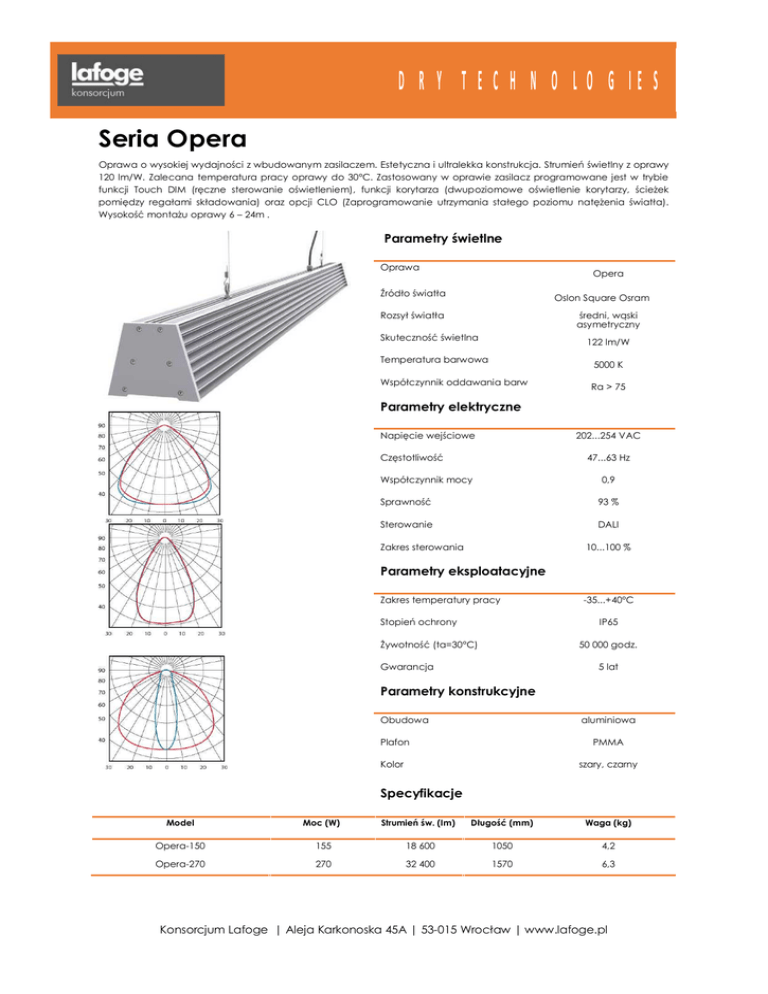 DRY TECHNOLOGIES Seria Opera Oprawa o wysokiej wydajno ci z wbudowanym zasilaczem. Estetyczna i ultralekka konstrukcja. Strumie wietlny z oprawy 120 lm/W. Zalecana temperatura pracy oprawy do 30°C. Zastosowany w oprawie zasilacz programowane jest w trybie funkcji Touch DIM (r czne sterowanie o wietleniem), funkcji korytarza (dwupoziomowe o wietlenie korytarzy, cie ek pomi dzy rega ami sk adowania) oraz opcji CLO (Zaprogramowanie utrzymania sta ego poziomu nat enia wiat a). Wysoko monta u oprawy 6 – 24m . Parametry wietlne Oprawa Opera ród o wiat a Oslon Square Osram Rozsy wiat a Skuteczno redni, w ski asymetryczny wietlna 122 lm/W Temperatura barwowa 5000 K Wspó czynnik oddawania barw Ra > 75 Parametry elektryczne Napi cie wej ciowe 202...254 VAC Cz stotliwo 47...63 Hz Wspó czynnik mocy 0,9 Sprawno 93 % Sterowanie DALI Zakres sterowania 10...100 % Parametry eksploatacyjne Zakres temperatury pracy -35...+40°C Stopie ochrony ywotno IP65 (ta=30°C) 50 000 godz. Gwarancja 5 lat Parametry konstrukcyjne Obudowa aluminiowa Plafon PMMA Kolor szary, czarny Specyfikacje Model Moc (W) Strumie w. (Im) ugo (mm) Waga (kg) Opera-150 155 18 600 1050 4,2 Opera-270 270 32 400 1570 6,3 Konsorcjum Lafoge | Aleja Karkonoska 45A | 53-015 Wroc aw | www.lafoge.pl