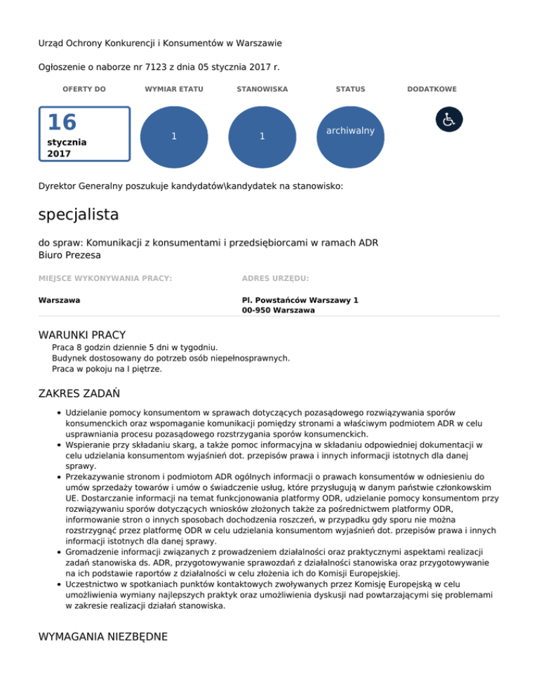 Urząd Ochrony Konkurencji i Konsumentów w Warszawie Ogłoszenie o naborze nr 7123 z dnia 05 stycznia 2017 r. OFERTY DO WYMIAR ETATU STANOWISKA 1 1 16 stycznia 2017 STATUS DODATKOWE archiwalny Dyrektor Generalny poszukuje kandydatów\kandydatek na stanowisko: specjalista do spraw: Komunikacji z konsumentami i przedsiębiorcami w ramach ADR Biuro Prezesa MIEJSCE WYKONYWANIA PRACY: ADRES URZĘDU: Warszawa Pl. Powstańców Warszawy 1 00-950 Warszawa WARUNKI PRACY Praca 8 godzin dziennie 5 dni w tygodniu. Budynek dostosowany do potrzeb osób niepełnosprawnych. Praca w pokoju na I piętrze. ZAKRES ZADAŃ Udzielanie pomocy konsumentom w sprawach dotyczących pozasądowego rozwiązywania sporów konsumenckich oraz wspomaganie komunikacji pomiędzy stronami a właściwym podmiotem ADR w celu usprawniania procesu pozasądowego rozstrzygania sporów konsumenckich. Wspieranie przy składaniu skarg, a także pomoc informacyjna w składaniu odpowiedniej dokumentacji w celu udzielania konsumentom wyjaśnień dot. przepisów prawa i innych informacji istotnych dla danej sprawy. Przekazywanie stronom i podmiotom ADR ogólnych informacji o prawach konsumentów w odniesieniu do umów sprzedaży towarów i umów o świadczenie usług, które przysługują w danym państwie członkowskim UE. Dostarczanie informacji na temat funkcjonowania platformy ODR, udzielanie pomocy konsumentom przy rozwiązywaniu sporów dotyczących wniosków złożonych także za pośrednictwem platformy ODR, informowanie stron o innych sposobach dochodzenia roszczeń, w przypadku gdy sporu nie można rozstrzygnąć przez platformę ODR w celu udzielania konsumentom wyjaśnień dot. przepisów prawa i innych informacji istotnych dla danej sprawy. Gromadzenie informacji związanych z prowadzeniem działalności oraz praktycznymi aspektami realizacji zadań stanowiska ds. ADR, przygotowywanie sprawozdań z działalności stanowiska oraz przygotowywanie na ich podstawie raportów z działalności w celu złożenia ich do Komisji Europejskiej. Uczestnictwo w spotkaniach punktów kontaktowych zwoływanych przez Komisję Europejską w celu umożliwienia wymiany najlepszych praktyk oraz umożliwienia dyskusji nad powtarzającymi się problemami w zakresie realizacji działań stanowiska. WYMAGANIA NIEZBĘDNE Wykształcenie: wyższe doświadczenie zawodowe: 1 rok na stanowisku związanym ze stosowaniem prawa znajomość języka angielskiego na poziomie B2; posiadanie kompetencji wiedza specjalistyczna i umiejętność jej praktycznego wykorzystania w zakresie: prawa konsumenckiego i znajomość zagadnień z zakresu ADR posiadanie kompetencji: skuteczna komunikacja, pozytywne podejście do klienta, rzetelność i terminowość, zorientowanie na osiąganie celów Posiadanie obywatelstwa polskiego Korzystanie z pełni praw publicznych Nieskazanie prawomocnym wyrokiem za umyślne przestępstwo lub umyślne przestępstwo skarbowe WYMAGANIA DODATKOWE Wykształcenie: wyższe prawnicze lub administracyjne doświadczenie zawodowe: 1 rok w stosowaniu prawa konsumenckiego znajomość języka angielskiego na poziomie C1 posiadanie kompetencji: umiejętność analitycznego myślenia, umiejętność współpracy, podejmowanie decyzji i odpowiedzialność. DOKUMENTY I OŚWIADCZENIA NIEZBĘDNE Życiorys/CV i list motywacyjny Kopie dokumentów potwierdzających spełnienie wymagania niezbędnego w zakresie wykształcenia Kopie dokumentów potwierdzających spełnienie wymagania niezbędnego w zakresie doświadczenia zawodowego / stażu pracy Oświadczenie o posiadaniu obywatelstwa polskiego albo kopia dokumentu potwierdzającego posiadanie polskiego obywatelstwa Oświadczenie o wyrażeniu zgody na przetwarzanie danych osobowych do celów naboru Oświadczenie o korzystaniu z pełni praw publicznych Oświadczenie o nieskazaniu prawomocnym wyrokiem za umyślne przestępstwo lub umyślne przestępstwo skarbowe DOKUMENTY I OŚWIADCZENIA DODATKOWE kopia dokumentu potwierdzającego niepełnosprawność - w przypadku kandydatek/kandydatów, zamierzających skorzystać z pierwszeństwa w zatrudnieniu w przypadku, gdy znajdą się w gronie najlepszych kandydatek/kandydatów Kopie dokumentów potwierdzających spełnienie wymagania dodatkowego w zakresie wykształcenia Kopie dokumentów potwierdzających spełnienie wymagania dodatkowego w zakresie doświadczenia zawodowego / stażu pracy TERMINY I MIEJSCE SKŁADANIA DOKUMENTÓW Dokumenty należy złożyć do: 16 stycznia 2017 r. Decyduje data: wpływu oferty do urzędu Miejsce składania dokumentów: Urząd Ochrony Konkurencji i Konsumentów Pl. Powstańców Warszawy 1 00-950 Warszawa (kancelaria UOKiK mieści się w Centrum Konferencyjnym UOKiK) z dopiskiem BP-ADR INNE INFORMACJE: W miesiącu poprzedzającym datę upublicznienia ogłoszenia wskaźnik zatrudnienia osób niepełnosprawnych w urzędzie, w rozumieniu przepisów o rehabilitacji zawodowej i społecznej oraz zatrudnianiu osób niepełnosprawnych, nie wynosi co najmniej 6%. 1. Nasz Urząd jest pracodawcą równych szans i wszystkie aplikacje są rozważane z równą uwagą bez względu na pleć, wiek, niepełnosprawność, rasę, narodowość, przekonania polityczne, przynależność związkową, pochodzenie etniczne, wyznanie orientację seksualną czy też jakąkolwiek inną cechę prawnie chronioną. 2. Dokumenty aplikacyjne powinny zawierać oświadczenia o treści podanej w ogłoszeniu, z oryginalnym podpisem własnoręcznym kandydata, opatrzone datą (list motywacyjny i oświadczenia). 3. Wzory oświadczeń do pobrania pod adresem: http://uokik.gov.pl/kariera_w_uokik.php. Weryfikacja wymagań formalnych będzie się odbywała na podstawie dokumentów aplikacyjnych, i w związku z tym podkreślamy, że kompletnie złożona aplikacja to taka, która zawiera wszystkie wymagane dokumenty i własnoręcznie podpisane oświadczenia. 4. Planowane etapy naboru: sprawdzian wiedzy i rozmowa kwalifikacyjna. 5. Zachęcamy do składania ofert osoby niepełnospraw
