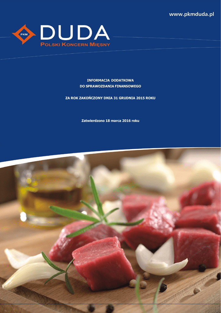 INFORMACJA DODATKOWA DO SPRAWOZDANIA FINANSOWEGO ZA ROK ZAKOŃCZONY DNIA 31 GRUDNIA 2015 ROKU Zatwierdzono 18 marca 2016 roku 1 Polski Koncern Mięsny DUDA S.A. Sprawozdanie finansowe za rok zakończony dnia 31 grudnia 2015 roku Dodatkowe Informacje i objasnienia INFORMACJE I OBJAŚNIENIA 1. INFORMACJE O ZNACZĄCYCH ZDARZENIACH DOTYCZĄCYCH LAT UBIEGŁYCH UJĘTYCH W SPRAWOZDANIU FINANSOWYM ROKU OBROTOWEGO Do dnia sporządzenia sprawozdania finansowego za rok obrotowy, to jest do dnia 18 marca 2016 r. nie wystąpiły zdarzenia dotyczące lat ubiegłych, które powinny być ujęte w sprawozdaniu finansowym za rok obrotowy zakńczony dnia 31 grudnia 2015 r. 2. INFORMACJE O ZNACZĄCYCH ZDARZENIACH, JAKIE NASTĄPIŁY PO DNIU BILANSOWYM, A NIEUWZGLĘDNIONYCH W SPRAWOZDANIU FINANSOWYM Po dniu bilansowym do dnia sporządzenia sprawozdania finansowego za rok obrotowy to jest do dnia 18 marca 2016 r. nie wystąpiły zdarzenia, które powinny być ujęte w sprawozdaniu finansowym za rok obrotowy zakńczony dnia 31 grudnia 2015 r. 3. ZMIANY ZASAD (POLITYKI) RACHUNKOWOŚCI W ROKU OBROTOWYM Sprawozdania finansowe za bieżący i poprzedni rok obrotowy sporządzono stosując identyczne zarówno zasady (politykę) rachunkowości, jak i metody prezentacji danych w sprawozdaniu finansowym. 4. KOREKTA BŁĘDU W bieżącym roku obrotowym nie dokonano korekt błędów, które mogłyby mieć wpływ na porównywalność danych finansowych za rok poprzedzający z danymi sprawozdania finansowego za bieżący rok obrotowy. 5. PORÓWNYWALNOŚĆ DANYCH FINANSOWYCH ZA ROK POPRZEDZAJĄCY SPRAWOZDANIA FINANSOWEGO ZA BIEŻĄCY ROK OBROTOWY Z DANYMI W bieżącym roku Spółka nie dokonywała zmian zasad rachunkowości ani korekt błędów, w związku z czym nie miała obowiązku zaprezentowania informacji liczbowych zapewniających porównywalność danych sprawozdania finansowego za rok poprzedzający ze sprawozdaniem za bieżący rok obrotowy. 2 Polski Koncern Mięsny DUDA S.A. Sprawozdanie finansowe za rok zakończony dnia 31 grudnia 2015 roku Dodatkowe Informacje i objasnienia 6. WARTOŚCI NIEMATERIALNE I PRAWNE Rok zakończony dnia 31 grudnia 2015 roku ZMIANY WARTOŚCI NIEMATERIALNYCH I PRAWNYCH (WG GRUP RODZAJOWYCH) wartość brutto wartości niematerialnych i prawnych na 01-01-2015 I.1 zwiększenia ( z tytułu) * zakup * zwiększenia związane z nabyciem jednostek zależnych * inne zwiększenia I.2 zmniejszenia ( z tytułu) * sprzedaż * inne zmniejszenia wartość brutto wartości niematerialnych I.II i prawnych na 31-12-2015 skumulowana amortyzacja (umorzenie) II.I na 01-01-2015 II.1 amortyzacja za okres amortyzacja związana z nabyciem II.2 jednostek zależnych amortyzacja związana ze sprzedażą II.3 jednostek zależnych amortyzacja związana ze sprzedażą i II.4 likwidacją WNiP skumulowana amortyzacja (umorzenie) II.II na 31-12-2015 odpisy z tytułu trwałej utraty wartości na III.I 01-01-2015 III.1 zwiększenie III.2 zmniejszenie odpisy z tytułu trwałej utraty wartości na III.II 31-12-2015 I.I wartość netto wartości niematerialnych i prawnych na koniec okresu Wartość firmy koncesje, patenty razem wartości niema terianlne i prawne w tym oprogramowanie 134 21 552 11 557 21 686 - 3 947 3 947 3 752 3 752 3 947 3 947 - - - - - 27 27 - 27 27 - 27 27 - 134 25 472 15 282 25 606 134 15 302 5 770 15 436 - 1 308 1 153 1 308 - - - - - - - - - 27 27 27 134 16 583 6 896 16 717 - - - - - - - - - - - - - 8 889 8 386 8 889 3 Polski Koncern Mięsny DUDA S.A. Sprawozdanie finansowe za rok zakończony dnia 31 grudnia 2015 roku Dodatkowe Informacje i objasnienia Rok zakończony dnia 31 grudnia 2014 roku ZMIANY WARTOŚCI NIEMATERIALNYCH I PRAWNYCH (WG GRUP RODZAJOWYCH) wartość brutto wartości niematerialnych i prawnych na 0101-2014 I.1 zwiększenia ( z tytułu) * zakup * zwiększenia związane z nabyciem jednostek zależnych * inne zwiększenia I.2 zmniejszenia ( z tytułu) * sprzedaż * inne zmniejszenia wartość brutto wartości I.II niematerialnych i prawnych na 3112-2014 skumulowana amortyzacja II.I (umorzenie) na 01-01-2014 II.1 amortyzacja za okres amortyzacja związana z nabyciem II.2 jednostek zależnych amortyzacja związana ze sprzedażą II.3 jednostek zależnych amortyzacja związana ze sprzedażą i II.4 likwidacją WNiP skumulowana amortyzacja II.II (umorzenie) na 31-12-2014 odpisy z tytułu trwałej utraty III.I wartości na 01-01-2014 III.1 zwiększenie III.2 zmniejszenie odpisy z tytułu trwałej utraty III.II wartości na 31-12-2014 I.I wartość netto wartości niematerialnych i prawnych na koniec okresu Wartość firmy koncesje, patenty razem wartości niematerianlne i prawne w tym oprogramowanie 134 19 700 9 510 19 834 - 2 183 2 183 2 183 2 183 2 183 2 183 - - - - - 0 331 331 - 0 136 136 - 0 331 331 - 134 21 552 11 557 21 686 134 14 661 5 089 14 795 - 972 817 972 - - - - - - - - - 331 136 331 134 15 302 5 770 15 436 - - - - - - - - - - - - - 6 250 5 786 6 250 4 Polski Koncern Mięsny DUDA S.A. Sprawozdanie finansowe za rok zakończony dnia 31 grudnia 2015 roku Dodatkowe Informacje i objasnienia 7. RZECZOWE AKTYWA TRWAŁE Rok zakończony dnia 31 grudnia 2015 roku ZMIANY ŚRODKÓW TRWAŁYCH (WG GRUP RODZAJOWYCH) I.I I.1 I.2 I.II II.I II.1 II.2 II.3 II.4 Wartosc brutto srodków trwalych na 01.01.2015 zwiekszenia (z tytulu) * zakup * leasing * inne zmniejszenia * sprzedaż * wykup z leasingu * przeniesienie do inwestycji długoterminowych * likwidacja * przeklasyfikowanie między grupami Wartosc brutto srodków trwalych na 31.12.2015 Skumulowana amortyzacja (umorzenie) na 01.01.2015 Amortyzacja za okres (z tytulu) Zmniejszenie umorzenia w związku ze zbyciem Zmniejszenie umorzenia w związku z likwidacją Zmniejszenie umorzenia w związku z wykupem (leasing) - grunty (w tym prawo użytkowania wieczystego gruntu) - budynki, lokale i obiekty inzynierii lądowej i wodnej - urządzenia techniczne i maszyny - środki transportu - inne środki trwałe - środki trwałe w budowie środki trwale razem 12