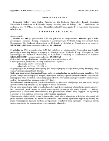 Sygn.akt IX KMP 18/16 W odpowiedzi podać: sygn. akt KM Kraków, dnia 29-08-2016 OBWIESZCZENIE Komornik Sądowy przy Sądzie Rejonowym dla Krakowa Krowodrzy Leszek Dumnicki Kancelaria Komornicza w Krakowie mający siedzibę przy al. Pokoju 29b/37 zawiadamia na 30 podstawie art. 10136 kpc, że w dniu 11 października 2016 r. o godz. 8 w Kancelarii Komornika odbędzie się: PI E R W S ZA LI CYTAC JA nieruchomości: 1) działka nr 395 (o powierzchni 0,52 ha) położona w miejscowości: Mników gm. Liszki, posiadająca założoną księgę wieczystą w Zamiejscowym Wydziale Ksiąg Wieczystych Sądu Rejonowego dla Krakowa -Krowodrzy w Krakowie z siedzibą w Czernichowie o numerze KR1K/00023531/8 - oszacowana na kwotę: 31.249,00 zł; 2) działka nr 393 (o powierzchni 0,28 ha) położona w miejscowości: Morawica gm. Liszki, posiadająca założoną księgę wieczystą w Zamiejscowym Wydziale Ksiąg Wieczystych Sądu Rejonowego dla Krakowa -Krowodrzy w Krakowie z siedzibą w Czernichowie o numerze KR1K/00020328/1 - oszacowana na kwotę: 17.220,00 zł. Obie działki nie są zabudowane i znajdują się w terenach rolnych - R1. Cena wywołania jest równa 3/4 sumy oszacowania i wynosi: - dla działki nr 395 - 23.436,75 zł - dla działki nr 393 - 12.915,00 zł. Przystępujący do przetargu obowiązany jest złożyć rękojmię w wysokości jednej dziesiątej sumy oszacowania poszczególnych działek. Nabywca obowiązany jest zapłacić cenę nabycia natychmiast po udzieleniu mu przybicia. Gdy jednak cena przewyższa pięćset złotych, obowiązek nabywcy ogranicza się do złożenia natychmiast jednej piątej ceny, nie mniej jednak niż pięćset złotych, przy czym reszta powinna być uiszczona do godziny dwunastej dnia następnego (art. 871 kpc). Nieruchomość można oglądać codziennie od dnia wywieszenia niniejszego obwieszczenia, zaś jej operat szacunkowy znajduje się do wglądu w biurze komornika. Prawa osób trzecich nie będą przeszkodą do licytacji i przysądzenia własności na rzecz nabywcy bez zastrzeżeń, jeżeli osoby te przed rozpoczęciem przetargu nie złożą dowodu, iż wniosły powództwo o zwolnienie nieruchomości lub przedmiotów razem z nią zajętych od egzekucji i uzyskały w tym zakresie orzeczenie wstrzymujące egzekucję. Użytkowanie, służebności i prawa dożywotnika, jeżeli nie są ujawnione w księdze wieczystej lub przez złożenie dokumentu do zbioru dokumentów i nie zostaną zgłoszone najpóźniej na trzy dni przed rozpoczęciem licytacji, nie będą uwzględnione w dalszym toku egzekucji i wygasną z chwilą uprawomocnienia się postanowienia o przysądzeniu własności.
