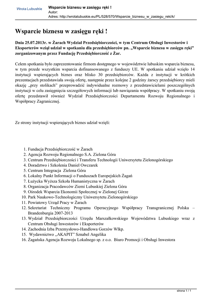 Wsparcie biznesu w zasięgu ręki ! Autor: Adres: http://wrotalubuskie.eu/PL/528/570/Wsparcie_biznesu_w_zasiegu_reki/k/ Wsparcie biznesu w zasięgu ręki ! Dnia 25.07.2013r. w Żarach Wydział Przedsiębiorczości, w tym Centrum Obsługi Inwestorów i Eksporterów wziął udział w spotkaniu dla przedsiębiorców pn. „Wsparcie biznesu w zasięgu ręki” zorganizowanym przez Fundację Przedsiębiorczość z Żar. Celem spotkania było zaprezentowanie firmom dostępnego w województwie lubuskim wsparcia biznesu, w tym przede wszystkim wsparcia dofinansowanego z funduszy UE. W spotkaniu udział wzięło 14 instytucji wspierających biznes oraz blisko 30 przedsiębiorców. Każda z instytucji w krótkich prezentacjach przedstawiała swoją ofertę, następnie przez kolejne 2 godziny żarscy przedsiębiorcy mieli okazję „przy stolikach” przeprowadzić indywidualne rozmowy z przedstawicielami poszczególnych instytucji w celu zasięgnięcia szczegółowych informacji lub nawiązania współpracy. W spotkaniu swoją ofertę przedstawił również Wydział Przedsiębiorczości Departamentu Rozwoju Regionalnego i Współpracy Zagranicznej. Ze strony instytucji wspierających biznes udział wzięli: 1. Fundacja Przedsiębiorczość w Żarach 2. Agencja Rozwoju Regionalnego S.A. Zielona Góra 3. Centrum Przedsiębiorczości i Transferu Technologii Uniwersytetu Zielonogórskiego 4. Doradztwo i Szkolenia Daniel Owczarek 5. Centrum Integracja Zielona Góra 6. Lokalny Punkt Informacji o Funduszach Europejskich Żagań 7. Łużycka Wyższa Szkoła Humanistyczna w Żarach 8. Organizacja Pracodawców Ziemi Lubuskiej Zielona Góra 9. Ośrodek Wsparcia Ekonomii Społecznej w Zielonej Górze 10. Park Naukowo-Technologiczny Uniwersytetu Zielonogórskiego 11. Powiatowy Urząd Pracy w Żarach 12. Sekretariat Techniczny Programu Operacyjnego Współpracy Transgranicznej Polska – Brandenburgia 2007-2013 13. Wydział Przedsiębiorczości Urzędu Marszałkowskiego Województwa Lubuskiego wraz z Centrum Obsługi Inwestorów i Eksporterów 14. Zachodnia Izba Przemysłowo-Handlowa Gorzów Wlkp. 15. Wydawnictwo ,,AKAPIT” Sznabel Angelika 16. Żagańska Agencja Rozwoju Lokalnego sp. z o.o. Biuro Promocji i Obsługi Inwestora strona 1 / 1 Powered by TCPDF (www.tcpdf.org)