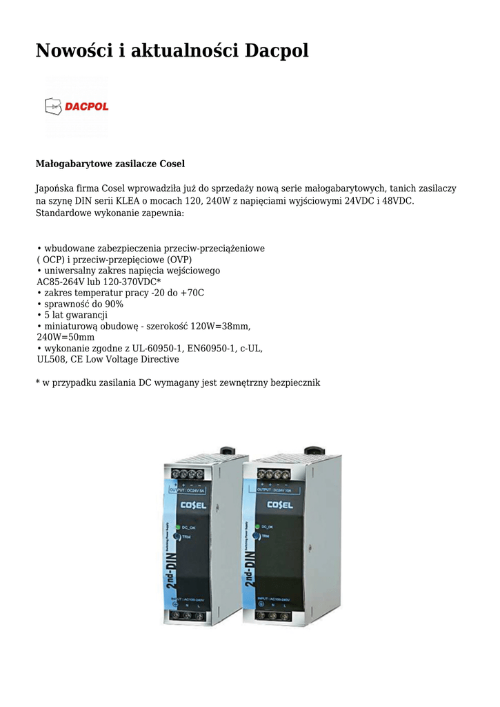 Nowości i aktualności Dacpol Małogabarytowe zasilacze Cosel Japońska firma Cosel wprowadziła już do sprzedaży nową serie małogabarytowych, tanich zasilaczy na szynę DIN serii KLEA o mocach 120, 240W z napięciami wyjściowymi 24VDC i 48VDC. Standardowe wykonanie zapewnia: • wbudowane zabezpieczenia przeciw-przeciążeniowe ( OCP) i przeciw-przepięciowe (OVP) • uniwersalny zakres napięcia wejściowego AC85-264V lub 120-370VDC* • zakres temperatur pracy -20 do +70C • sprawność do 90% • 5 lat gwarancji • miniaturową obudowę - szerokość 120W=38mm, 240W=50mm • wykonanie zgodne z UL-60950-1, EN60950-1, c-UL, UL508, CE Low Voltage Directive * w przypadku zasilania DC wymagany jest zewnętrzny bezpiecznik Obudowa pulpitowa Unidesk Obudowa pulpitowa/sterownicza Unidesk jest ergonomiczną obudową do aplikacji na biurko jak również do montażu na ścianie. Zapewnia stopień ochrony IP54. Obudowa wykonana jest z aluminium ze zdejmowanym przednim panelem. Specjalny zestaw do montażu płytki PCB umożliwia jej przykręcenie od wewnętrznej strony panelu przedniego. Obudowy ze stali nierdzewnej FQ/FQL Obudowy z serii FQ/FQL ze stali nierdzewnej wykonane są w standardzie ze stali AISI 304, natomiast w opcji ze stali AISI 316L. Szafka tak wykonana jest bardzo esetycznie z zachowaniem stopnia ochrony IP66. Model FQ występuję z pełnymi drzwiami, natomiast FQL z drzwiami przeszklonymi. W opcji wsytępuję również specjalny daszek jak i cokół. Standardowo szafki te zawierają płytę montażową. Produkt ten występuje w ciągłej sprzedaży internetowej. Walizki GUARDIAN Firma ZeroCASES wprowadziła na rynek nową serię walizek z tworzywa. Są one wykonane ze specjalnego materiału, który umożliwia pracę w ekstremalnych warunkach. Walizka ta posiada certyfikat IP67. Występują z wypełnieniem jak również bez. Pianka ta jest sztywna i stabilna. Możliwe jest wycięcie kształtu wg rysunku. Posiada ona wiele innych dodatków jak, rączkę z kółkami, elementy do montażu przedniego panelu jak i może występować w różnych kolorach. Produkt ten występuję w ciągłej sprzedaży internetowej. KONTAKT Dacpol E-mail: [email protected] WWW: www.dacpol.eu Tel: +48 22 70 35 100 Fax: +48 22 70 35 101 Adres: Puławska 34 05-500 Piaseczno