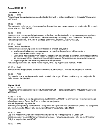 Arena CEDE 2012 Czwartek 20.09 10:30 – 11:00 Przygotowanie gabinetu do procedur higienicznych – pokaz praktyczny. Krzysztof Kłusewicz, MEDILAB 11:00 – 12:00 Stomatologia estetyczna – bezpośrednie licówki kompozytowe, pokaz na pacjencie. Dr n.med. Marta Maciak, POLDENT 12:00 – 13:30 Uproszczona procedura indywidualnej odbudowy na implantach, przy zastosowaniu systemu Bella Tek Encode (BIOMET3i) oraz skanera wewnątrzustnego Lava Chairside Oral (3M). Pokaz na pacjencie, dr n. med. Bartosz Suliborski, DENTAL DEPO WASIO 13:30 – 15:00 Swiss Dental Academy: Profilaktyka i niechirurgiczne metody leczenia chorób przyzębia • scaling naddziąsłowy, oczyszczanie i wygładzanie powierzchni korzenia, z wykorzystaniem ultradźwięków, • usuwanie naddziąsłowych osadów nazębnych za pomocą piaskarek, eliminacja biofilmu za pomocą metody piaskowanie poddziąsłowego, farmakoterapia ogólna i miejscowa • zapobieganie i leczenie zapaleń wokół implantów. Pokaz na pacjencie: lek. dent. Anna Kogut, dypl. hig Agnieszka Koman. W&H 15:00 – 16:00 Nowoczesna diagnostyka stawów skroniowo-Ŝuchwowych. Pokaz na pacjencie. Alldent 16:00 – 17:00 Ergonomia pracy na 4 ręce w leczeniu endodontycznym. Pokaz praktyczny na pacjencie. Dr Piotr Wujec, POLDENT Piątek 21.09 10:15 – 10:45 Przygotowanie gabinetu do procedur higienicznych – pokaz praktyczny. Krzysztof Kłusewicz, MEDILAB 10:45 – 11:30 Wybielanie zębów metodą gabinetową systemem LUMIBRITE przy uŜyciu wielofunkcyjnego łuku plazmowego Sapphire Plus – pokaz na pacjencie. W trakcie pokazu wybielania Kosmetyczne protezy nakładkowe Snap-on Smil : prezentacja procedury - pokaz na pacjencie. lek. stom. Monika Minor, lek. stom. Ewa Minor-Ptaszyńska, DENMED 11:30 – 13:00 Czy jest moŜliwe wykonanie korony na implancie na jednej wizycie ? Cerec 3D zaprojektowany do działania w implantoprotetyce. Pokaz na pacjencie, lek. stom. Krzysztof Sołtyk z asystentką. AMADAR 13:00 – 14:00 Perfekcyjna komunikacja z pacjentem z uŜyciem nowoczesnych narzędzi diagnostycznych (kamera wewnątrzustna, rvg, tomografia) – prezentacja na pacjencie, dr. n. med. Bartosz Cerkaski, OPTIDENT. 14:00 – 15:00 Abrazja powietrzna. Pokaz na pacjencie. ALLDENT 15:00 – 15:30 Pokaz zakładania koferdamu na modelu. Dr Tomasz Kiełkowicz. POLDENT 15:30 – 17:00 Wypełnianie kanałów korzeniowych róŜnymi metodami: na ciepło i na zimno. Pokaz na modelu Dr Tomasz Kiełkowicz.. POLDENT Sobota 22.09 10:15 – 10:45 Przygotowanie gabinetu do procedur higienicznych – pokaz praktyczny. Krzysztof Kłusewicz, MEDILAB 10:45 – 11:45 Standardowe licówki porcelanowe Cerinate One-Hour – nie wymagające szlifowania zębów. Procedura doboru i cementowanie. Pokaz doboru i zakładania licówek na modelu. lek. stom. Monika Minor, DENMED 11:45 – 13:15 Jak wykonać licówkę pełnoceramiczną na jednej wizycie? Cerec 3D - system wykonania w gabinecie pełnoceramicznych uzupełnień protetycznych. Pokaz na pacjencie, AMADAR 13:15 – 14:15 Ozonoterapia w gabinecie stomatologicznym, ALLDENT 14:15 – 15:15 Profilaktyka onkologiczna w gabinecie stomatologicznym Pokaz standardowego, prawidłowego badania jamy ustnej – na pacjencie. Badanie jamy ustnej przy pomocy systemu Microlux, dr Magdalena Madalińska Badanie Detektorem Zmian Nowotworowych Sapphire Plus, lek. stom. Ewa Minor-Ptaszyńska, Badanie lampą Velscope, dr n. med. Tomasz Kercz. FUNDACJA Z USMIECHEM PRZEZ ZYCIE.