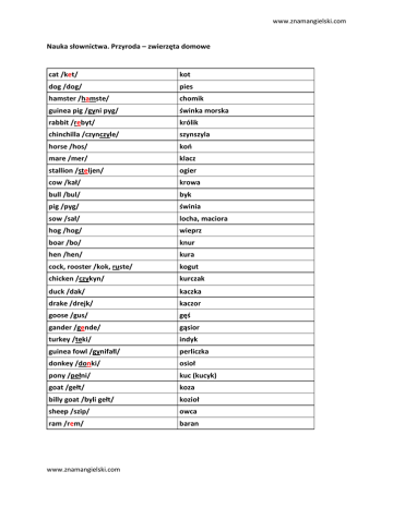 www.znamangielski.com Nauka słownictwa. Przyroda – zwierzęta domowe cat /ket/ kot dog /dog/ pies hamster /hamste/ chomik guinea pig /gyni pyg/ świnka morska rabbit /rebyt/ królik chinchilla /czynczyle/ szynszyla horse /hos/ koń mare /mer/ klacz stallion /steljen/ ogier cow /kał/ krowa bull /bul/ byk pig /pyg/ świnia sow /sał/ locha, maciora hog /hog/ wieprz boar /bo/ knur hen /hen/ kura cock, rooster /kok, ruste/ kogut chicken /czykyn/ kurczak duck /dak/ kaczka drake /drejk/ kaczor goose /gus/ gęś gander /gende/ gąsior turkey /teki/ indyk guinea fowl /gynifałl/ perliczka donkey /donki/ osioł pony /pełni/ kuc (kucyk) goat /gełt/ koza billy goat /byli gełt/ kozioł sheep /szip/ owca ram /rem/ baran www.znamangielski.com