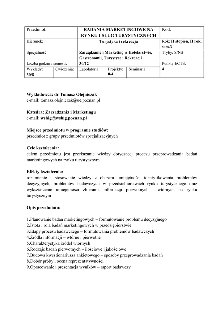Przedmiot: BADANIA MARKETINGOWE NA RYNKU USŁUG TURYSTYCZNYCH Kierunek: Specjalność: Liczba godzin / semestr: Wykłady: Ćwiczenia: 30/8 Turystyka i rekreacja Zarządzanie i Marketing w Hotelarstwie, Gastronomii, Turystyce i Rekreacji 30/12 Labolatoria: Projekty: Seminaria: 0/4 Kod: Rok: II stopień, II rok, sem.3 Tryby: S/NS Punkty ECTS: 4 Wykładowca: dr Tomasz Olejniczak e-mail: [email protected] Katedra: Zarządzania i Marketingu e-mail: [email protected] Miejsce przedmiotu w programie studiów: przedmiot z grupy przedmiotów specjalizacyjnych Cele kształcenia: celem przedmiotu jest przekazanie wiedzy dotyczącej procesu przeprowadzania badań marketingowych na rynku turystycznym Efekty kształcenia: rozumienie i stosowanie wiedzy z obszaru umiejętności identyfikowania problemów decyzyjnych, problemów badawczych w przedsiebiorstwach rynku turystycznego oraz wykształcenie umiejętności zbierania informacji pierwotnych i wtórnych na rynku turystycznym Opis przedmiotu: 1.Planowanie badań marketingowych – formułowanie problemu decyzyjnego 2.Istota i rola badań marketingowych w przedsiębiorstwie 3.Etapy procesu badawczego – formułowania problemów badawczych 4.Źródła informacji – wtórne i pierwotne 5.Charakterystyka źródeł wtórnych 6.Rodzaje badań pierwotnych – ilościowe i jakościowe 7.Budowa kwestionariusza ankietowego – sposoby przeprowadzania badań 8.Dobór próby i ocena reprezentatywności 9.Opracowanie i prezentacja wyników – raport badawczy Forma prowadzenia zajęć: Wykłady, ćwiczenia, praca w grupach, kolokwium pisemne Metody oceny: Prace grupowe, kolokwium pisemne Bibliografia: 1. Badania marketingowe. Teoria i praktyka, red. K. Mazurek-Łopacińska, PWE Warszawa 2008 2. S. Kaczmarczyk, Badania marketingowe. Metody i techniki, PWE Warszawa 1997/1999/2001/2006 3. T. Hermaniuk, Podstawy badań marketingowych, Uniwersytet Rzeszowski, Rzeszów 2005 4. Badania marketingowe, red. D. Maison, GWP Gdańsk 2007 5. G.A. Churchill, Badania marketingowe, PWN Warszawa 2001 6. B. Sojkin, Informacyjne podstawy decyzji marketingowych, PWE Warszawa 2009 7. Analiza rynku, red. H. Mruk, PWE Warszawa 2003