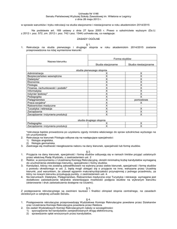 Uchwała Nr V/46 Senatu Państwowej Wyższej Szkoły Zawodowej im. Witelona w Legnicy z dnia 28 maja 2013 r. w sprawie warunków i trybu rekrutacji na studia stacjonarne i niestacjonarne w roku akademickim 2014/2015 Na podstawie art. 169 ustawy z dnia 27 lipca 2005 r. Prawo o szkolnictwie wyższym (Dz.U. z 2012 r. poz. 572, zm. 2012 r. poz. 742 i poz. 1544) uchwala się, co następuje: ZASADY OGÓLNE 1. § 1. Rekrutacja na studia pierwszego i drugiego stopnia w roku akademickim 2014/2015 zostanie przeprowadzona na niżej wymienione kierunki: Forma studiów Nazwa kierunku Studia stacjonarne Administracja Bezpieczeństwo wewnętrzne Dietetyka* Ekonomia Filologia Finanse, rachunkowość i podatki* Informatyka Inżynier testowy* Pedagogika Pielęgniarstwo Praca socjalna* Ratownictwo medyczne Turystyka i rekreacja Zarządzanie Zarządzanie i inżynieria produkcji studia pierwszego stopnia X X X X X X X X X X X X X X X Studia niestacjonarne X X X X X X X X X pomostowe X X X X studia drugiego stopnia Pedagogika Zarządzanie i inżynieria produkcji 2. 3. 1. 2. 3. 4. X X X X *rekrutacja będzie prowadzona po uzyskaniu zgody ministra właściwego do spraw szkolnictwa wyższego na ich uruchomienie Rekrutacja na kierunek Filologia odbywa się na następujące specjalności: 1) filologia angielska, 2) filologia germańska. Zastrzega się możliwość nieogłoszenia naboru na dany kierunek, specjalność lub formę studiów. § 2. Przyjęcia na dany kierunek, specjalność i formę studiów odbywają się w ramach limitów przyjęć ustalonych przez właściwą Radę Wydziału, z zastrzeżeniem ust. 2 Rektor, w porozumieniu z Uczelnianą Komisją Rekrutacyjną, określi minimalną liczbę kandydatów wymaganą do uruchomienia określonego kierunku, specjalności i formy studiów. Kandydaci, którzy nie zostaną zakwalifikowani na wybrany przez siebie kierunek, specjalność i formę studiów z powodu określonego w ust. 2, będą mogli ubiegać się o przyjęcie na inne, wskazane przez Uczelnię kierunki, pod warunkiem, że zdawali egzamin maturalny/dojrzałości przynajmniej z jednego przedmiotu, za który na nowym kierunku przysługują punkty, z zastrzeżeniem ust. 4. Na kierunkach: Dietetyka, Pielęgniarstwo, Ratownictwo medyczne oraz Turystyka i rekreacja wymagane jest dodatkowo zaświadczenie lekarskie stwierdzające możliwość podjęcia studiów na wybranym kierunku (skierowanie i druk zaświadczenia dostępne na Uczelni). § 3. Z postępowania rekrutacyjnego są zwolnieni laureaci i finaliści olimpiad stopnia centralnego, na zasadach określonych w odrębnej uchwale Senatu. 1. 2. § 4. Postępowanie rekrutacyjne przeprowadzają Wydziałowe Komisje Rekrutacyjne powołane przez Dziekanów oraz Uczelniana Komisja Rekrutacyjna powołana przez Rektora. Do zadań Wydziałowych Komisji Rekrutacyjnych należy w szczególności: 1) sporządzenie list kandydatów zarejestrowanych drogą elektroniczną, 2) sprawdzanie opłat wnoszonych przez kandydatów, 3) 4) 5) 6) 7) 8) 9) 10) 11) 3. przygotowanie i ogłoszenie list osób zakwalifikowanych oraz list rezerwowych, skompletowanie dokumentacji kandydatów, wyliczanie punktów uzyskanych przez kandydatów, weryfikacja danych kandydatów zgłoszonych drogą elektroniczną, podejmowanie decyzji w sprawie przyjęcia na studia, przygotowanie i ogłoszenie list osób przyjętych na I rok studiów, sporządzanie i wysyłanie do kandydatów decyzji o przyjęciu lub nieprzyjęciu na studia, wypełnianie protokołu w kwestionariuszu składanym przez kandydata, przyjmowanie odwołań od decyzji, ich rozpatrywanie lub przekazywanie do Uczelnianej Komisji Rekrutacyjnej, 12) przygotowanie protokołu z rekrutacji i przekazanie go Uczelnianej Komisji Rekrutacyjnej. Do zadań Uczelnianej Komisji Rekrutacyjnej należy w szczególności: 1) koordynowanie działań związanych z przeprowadzeniem postępowania rekrutacyjnego, 2) nadzorowanie działań Wydziałowych Komisji Rekrutacyjnych, 3) zatwierdzanie protokołów Wydziałowych Komisji Rekrutacyjnych z przeprowadzonej rekrutacji, 4) sporządzenie zbiorczego protokołu z postępowania rekrutacyjnego przeprowadzonego w Uczelni. § 5. Od decyzji Wydziałowej Komisji Rekrutacyjnej przysługuje odwołanie do Uczelnianej Komisji Rekrutacyjnej, w terminie 14 dni od daty doręczenia decyzji. Podstawą odwołania może być jedynie wskazanie naruszenia warunków i trybu rekrutacji na studia określonych w niniejszej uchwale. Decyzja Uczelnianej Komisji Rekrutacyjnej jest ostateczna. REKRUTACJA NA STUDIA PIERWSZEGO STOPNIA 1. 2. 3. § 6. Postępowanie rekrutacyjne ma charakter konkursowy. Podstawą przyjęcia na studia są punkty rekrutacyjne przyznawane kandydatowi zgodnie z ust. 5 za przedmioty określone w ust. 3, z których zdawał egzamin maturalny, egzamin dojrzałości lub egzamin przeprowadzony w ramach programu Matury Międzynarodowej. W postępowaniu rekrutacyjnym kandydat otrzymuje punkty za przedmioty, z których zdawał egzamin maturalny, egzamin dojrzałości lub egzamin przeprowadzony w ramach programu Matury Międzynarodowej, zgodnie z poniższą tabelą: Kierunek Przedmioty język polski, język obcy, jeden z wybranych przedmiotów: historia, geografia, biologia lub wiedza o społeczeństwie, Administracja 1) 2) 3) Bezpieczeństwo wewnętrzne 1) 2) 3) język polski, język obcy, jeden z wybranych przedmiotów: historia, wiedza o społeczeństwie, geografia, Dietetyka* 1) 2) 3) biologia, język obcy, jeden z wybranych przedmiotów: chemia, fizyka (fizyka i astronomia), matematyka lub język polski, Ekonomia 1) 2) 3) matematyka, język obcy, jeden z wybranych przedmiotów: język polski, geografia, historia lub wiedza o społeczeństwie, Filologia 1) 2) 3) język obcy (angielski lub niemiecki) będący przedmiotem studiów, język polski, jeden z wybranych przedmiotów: historia, matematyka, wiedza o społeczeństwie, geografia, biologia lub drugi język obcy, Finanse, rachunkowość i podatki* 1) 2) 3) matematyka,