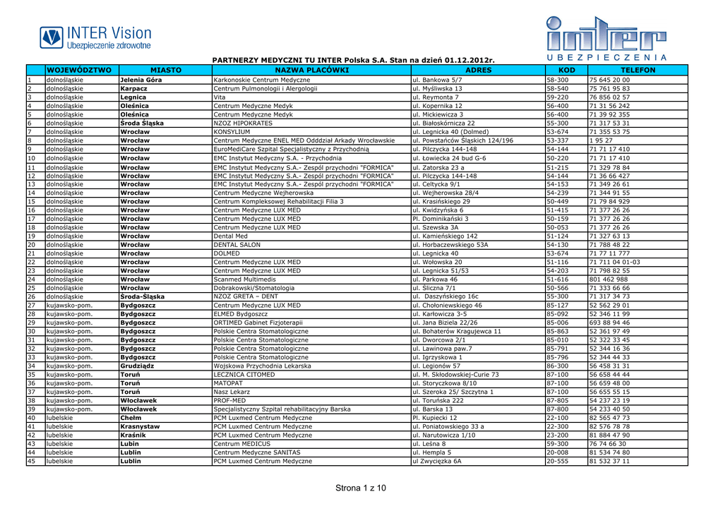WOJEWÓDZTWO MIASTO PARTNERZY MEDYCZNI TU INTER Polska S.A. Stan na dzień 01.12.2012r. NAZWA PLACÓWKI ADRES Bankowa 5/7 Myśliwska 13 Reymonta 7 Kopernika 12 Mickiewicza 3 Białoskórnicza 22 Legnicka 40 (Dolmed) Powstańców Śląskich 124/196 Pilczycka 144-148 Jelenia Góra Karpacz Legnica Oleśnica Oleśnica Środa Śląska Wrocław Wrocław Wrocław Karkonoskie Centrum Medyczne Centrum Pulmonologii i Alergologii Vita Centrum Medyczne Medyk Centrum Medyczne Medyk NZOZ HIPOKRATES KONSYLIUM Centrum Medyczne ENEL MED Odddział Arkady Wrocławskie EuroMediCare Szpital Specjalistyczny z Przychodnią 10 dolnośląskie Wrocław EMC Instytut Medyczny S.A. - Przychodnia ul. Łowiecka 24 bud G-6 50-220 71 71 17 410 11 12 13 14 15 16 17 18 19 20 21 22 23 24 25 26 27 28 29 30 31 32 33 34 35 36 37 38 39 40 41 42 43 44 45 dolnośląskie dolnośląskie dolnośląskie dolnośląskie dolnośląskie dolnośląskie dolnośląskie dolnośląskie dolnośląskie dolnośląskie dolnośląskie dolnośląskie dolnośląskie dolnośląskie dolnośląskie dolnośląskie kujawsko-pom. kujawsko-pom. kujawsko-pom. kujawsko-pom. kujawsko-pom. kujawsko-pom. kujawsko-pom. kujawsko-pom. kujawsko-pom. kujawsko-pom. kujawsko-pom. kujawsko-pom. kujawsko-pom. lubelskie lubelskie lubelskie lubelskie lubelskie lubelskie Wrocław Wrocław Wrocław Wrocław Wrocław Wrocław Wrocław Wrocław Wrocław Wrocław Wrocław Wrocław Wrocław Wrocław Wrocław Środa-Śląska Bydgoszcz Bydgoszcz Bydgoszcz Bydgoszcz Bydgoszcz Bydgoszcz Bydgoszcz Grudziądz Toruń Toruń Toruń Włocławek Włocławek Chełm Krasnystaw Kraśnik Lubin Lublin Lublin EMC Instytut Medyczny S.A.- Zespól przychodni "FORMICA" EMC Instytut Medyczny S.A.- Zespól przychodni "FORMICA" EMC Instytut Medyczny S.A.- Zespól przychodni "FORMICA" Centrum Medyczne Wejherowska Centrum Kompleksowej Rehabilitacji Filia 3 Centrum Medyczne LUX MED Centrum Medyczne LUX MED Centrum Medyczne LUX MED Dental Med DENTAL SALON DOLMED Centrum Medyczne LUX MED Centrum Medyczne LUX MED Scanmed Multimedis Dobrakowski/Stomatologia NZOZ GRETA – DENT ul. ul. ul. ul. ul. ul. Pl. ul. ul. ul. ul. ul. ul. ul. ul. ul. 51-215 54-144 54-153 54-239 50-449 51-415 50-159 50-053 51-124 54-130 53-674 51-116 54-203 51-616 50-566 55-300 71 329 78 84 71 36 66 427 71 349 26 61 71 344 91 55 71 79 84 929 71 377 26 26 71 377 26 26 71 377 26 26 71 327 63 13 71 788 48 22 71 77 11 777 71 711 04 01-03 71 798 82 55 801 462 988 71 333 66 66 71 317 34 73 Centrum Medyczne LUX MED ELMED Bydgoszcz ORTIMED Gabinet Fizjoterapii Polskie Centra Stomatologiczne Polskie Centra Stomatologiczne Polskie Centra Stomatologiczne Polskie Centra Stomatologiczne Wojskowa Przychodnia Lekarska LECZNICA CITOMED MATOPAT Nasz Lekarz PROF-MED Specjalistyczny Szpital rehabilitacyjny Barska PCM Luxmed Centrum Medyczne PCM Luxmed Centrum Medyczne PCM Luxmed Centrum Medyczne Centrum MEDICUS Centrum Medyczne SANITAS PCM Luxmed Centrum Medyczne ul. Chołoniewskiego 46 ul. Karłowicza 3-5 ul. Jana Biziela 22/26 ul. Bohaterów Kragujewca 11 ul. Dworcowa 2/1 ul. Lawinowa paw.7 ul. Igrzyskowa 1 ul. Legionów 57 ul. M. Skłodowskiej-Curie 73 ul. Storyczkowa 8/10 ul. Szeroka 25/ Szczytna 1 ul. Toruńska 222 ul. Barska 13 Pl. Kupiecki 12 ul. Poniatowskiego 33 a ul. Narutowicza 1/10 ul. Leśna 8 ul. Hempla 5 ul Zwycięzka 6A 85-127 85-092 85-006 85-863 85-010 85-791 85-796 86-300 87-100 87-100 87-100 87-805 87-800 22-100 22-300 23-200 59-300 20-008 20-555 52 562 29 01 52 346 11 99 693 88 94 46 52 361 97 49 52 322 33 45 52 344 16 36 52 344 44 33 56 458 31 31 56 658 44 44 56 659 48 00 56 655 55 15 54 237 23 19 54 233 40 50 82 565 47 73 82 576 78 78 81 884 47 90 76 74 66 30 81 534 74 80 81 532 37 11 Zatorska 23 a Pilczycka 144-148 Celtycka 9/1 Wejherowska 28/4 Krasińskiego 29 Kwidzyńska 6 Dominikański 3 Szewska 3A Kamieńskiego 142 Horbaczewskiego 53A Legnicka 40 Wołowska 20 Legnicka 51/53 Parkowa 46 Śliczna 7/1 Daszyńskiego 16c 58-300 58-540 59-220 56-400 56-400 55-300 53-674 53-337 54-144 TELEFON dolnośląskie dolnośląskie dolnośląskie dolnośląskie dolnośląskie dolnośląskie dolnośląskie dolnośląskie dolnośląskie Strona 1 z 10 ul. ul. ul. ul. ul. ul. ul. ul. ul. KOD 1 2 3 4 5 6 7 8 9 75 645 20 00 75 761 95 83 76 856 02 57 71 31 56 242 71 39 92 355 71 317 53 31 71 355 53 75 1 95 27 71 71 17 410 46 47 48 49 50 51 52 53 54 55 56 57 58 59 60 61 62 63 64 65 66 67 68 69 70 71 72 73 74 75 76 77 78 79 80 81 82 83 84 85 86 87 88 89 90 91 92 93 94 95 96 97 98 lubelskie lubelskie lubelskie lubelskie lubelskie lubelskie lubuskie lubuskie lubuskie łódzkie łódzkie łódzkie łódzkie łódzkie łódzkie łódzkie łódzkie łódzkie łódzkie łódzkie łódzkie łódzkie łódzkie małopolskie małopolskie małopolskie małopolskie małopolskie małopolskie małopolskie małopolskie małopolskie małopolskie małopolskie małopolskie małopolskie małopolskie małopolskie małopolskie małopolskie małopolskie małopolskie małopolskie małopolskie małopolskie małopolskie małopolskie małopolskie małopolskie małopolskie małopolskie małopolskie małopolskie Lublin Lublin Lublin Lublin Nałęczów Zamość Gorzów Wlkp. Zielona Góra Zielona Góra Kutno Łódź Łódź Łódź Łódź Łódź Łódź Łódź Łódź Piotrków Trybunalski Łódź Pabianice Radomsko Sieradz Bochnia Kraków Kraków Kraków Kraków Kraków Kraków Kraków Kraków Kraków Kraków Kraków Kraków Kraków Kraków Kraków Kraków Kraków Kraków Kraków Kraków Kraków Kraków Nowy Sącz Nowy Sącz Tarnów Wolbrom Kraków Kraków Kraków PCM Luxmed Centrum Medyczne PCM Luxmed Centrum Medyczne Specjalistyczna Praktyka Stomatologiczna TOP – MEDICAL PCM Luxmed Przychodnia „PROF.-LEK” Gorzowska Lecznica Specjalistyczna ALDEMED Centrum Medyczne ALDEMED Centrum Medyczne Filia Zastal MEDYK Centrum Medyczne ENEL MED Oddział Manufaktura Centrum Medyczne Szpital Św. Rodziny Centrum Medyczne LUX MED Centrum Medyczne LUX MED Centrum Medyczne R-med Przycho