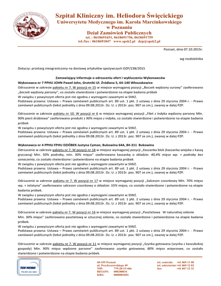 Szpital Kliniczny im. Heliodora Święcickiego Uniwersytetu Medycznego im. Karola Marcinkowskiego w Poznaniu Dział Zamówień Publicznych tel. : 0618691651, 0618691756, 0618691759 tel./fax : 0618691847 www.spsk2.pl [email protected] Poznań, dnia 07.10.2015r. wg rozdzielnika Dotyczy: przetarg nieograniczony na dostawę artykułów spożywczych DZP/238/2015 Zamawiający informuje o odrzuceniu ofert i wykluczeniu Wykonawców Wykonawca nr 7 PPHU JOHN Paweł John, Grotniki Ul. Źródlana 5, 64-140 Włoszakowice Odrzucenie w zakresie pakietu nr 7. W pozycji nr 15 w miejsce wymaganej pozycji „Boczek wędzony surowy” zaoferowano „boczek wędzony parzony”, co zostało stwierdzone i potwierdzone na etapie badania próbek W związku z powyższym oferta jest nie zgodna z wymogami zawartymi w SIWZ. Podstawa prawna: Ustawa – Prawo zamówień publicznych art. 89 ust. 1 pkt. 2 ustawy z dnia 29 stycznia 2004 r. - Prawo zamówień publicznych (tekst jednolity z dnia 09.08.2013r. Dz. U. z 2013r. poz. 907 ze zm.), zwanej w dalej PZP. Odrzucenie w zakresie pakietu nr 10. W pozycji nr 6 w miejsce wymaganej pozycji „Filet z indyka wędzony parzony Min. 90% pierś drobiowa” zaoferowano produkt z 90% mięso z indyka, co zostało stwierdzone i potwierdzone na etapie badania próbek W związku z powyższym oferta jest nie zgodna z wymogami zawartymi w SIWZ. Podstawa prawna: Ustawa – Prawo zamówień publicznych art. 89 ust. 1 pkt. 2 ustawy z dnia 29 stycznia 2004 r. - Prawo zamówień publicznych (tekst jednolity z dnia 09.08.2013r. Dz. U. z 2013r. poz. 907 ze zm.), zwanej w dalej PZP. Wykonawca nr 4 PPHU FPHU DZIÓBEK Justyna Cyman, Bukowina 64A, 84-311 Bukowina Odrzucenie w zakresie pakietu nr 7. W pozycji nr 18 w miejsce wymaganej pozycji „Kaszanka blok (kaszanka wiejska z kaszą gryczaną) Min. 50% podroby, min. 30% mięso” zaoferowano kaszankę o składzie: 40,4% mięso wp. + podroby bez oznaczenia, co zostało stwierdzone i potwierdzone na etapie badania próbek W związku z powyższym oferta jest nie zgodna z wymogami zawartymi w SIWZ. Podstawa prawna: Ustawa – Prawo zamówień publicznych art. 89 ust. 1 pkt. 2 ustawy z dnia 29 stycznia 2004 r. - Prawo zamówień publicznych (tekst jednolity z dnia 09.08.2013r. Dz. U. z 2013r. poz. 907 ze zm.), zwanej w dalej PZP. Odrzucenie w zakresie pakietu nr 7. W pozycji nr 17 w miejsce wymaganej pozycji „Salceson czosnkowy Min. 70% mięso wp. + żelatyna” zaoferowano salceson czasnkowy o składzie: 55% mięsa, co zostało stwierdzone i potwierdzone na etapie badania próbek. W związku z powyższym oferta jest nie zgodna z wymogami zawartymi w SIWZ. Podstawa prawna: Ustawa – Prawo zamówień publicznych art. 89 ust. 1 pkt. 2 ustawy z dnia 29 stycznia 2004 r. - Prawo zamówień publicznych (tekst jednolity z dnia 09.08.2013r. Dz. U. z 2013r. poz. 907 ze zm.), zwanej w dalej PZP. Odrzucenie w zakresie pakietu nr 7. W pozycji nr 16 w miejsce wymaganej pozycji „Pasztetowa W naturalnej osłonie Min. 30% mięso” zaoferowano pasztetową w sztucznej osłonie, co zostało stwierdzone i potwierdzone na etapie badania próbek. W związku z powyższym oferta jest nie zgodna z wymogami zawartymi w SIWZ. Podstawa prawna: Ustawa – Prawo zamówień publicznych art. 89 ust. 1 pkt. 2 ustawy z dnia 29 stycznia 2004 r. - Prawo zamówień publicznych (tekst jednolity z dnia 09.08.2013r. Dz. U. z 2013r. poz. 907 ze zm.), zwanej w dalej PZP. Odrzucenie w zakresie pakietu nr 7. W pozycji nr 11 w miejsce wymaganej pozycji „Szynka gotowana (szynka z kaszubskiej gospody) Min. 90% mięso wędzone parzone” zaoferowano szynka gotowana; 80% mięso wieprzowe, co zostało stwierdzone i potwierdzone na etapie badania próbek. 60-355 Poznań ul. Przybyszewskiego 49 NIP: 779-20-33-466 REGON: 000288834 KRS: 0000001852 tel. centrala: +61 869 11 00 tel. sekretariat:+61 869 12 03 fax: +61 867 12 32 W związku z powyższym oferta jest nie zgodna z wymogami zawartymi w SIWZ. Podstawa prawna: Ustawa – Prawo zamówień publicznych art. 89 ust. 1 pkt. 2 ustawy z dnia 29 stycznia 2004 r. - Prawo zamówień publicznych (tekst jednolity z dnia 09.08.2013r. Dz. U. z 2013r. poz. 907 ze zm.), zwanej w dalej PZP. Odrzucenie w zakresie pakietu nr 7. W pozycji nr 8 w miejsce wymaganej pozycji „Łopatka pieczona (łopatka w majeranku) Min. 78% mięso z łopatki” zaoferowano łopatkę 77% mięso wp., co zostało stwierdzone i potwierdzone na etapie badania próbek. W związku z powyższym oferta jest nie zgodna z wymogami zawartymi w SIWZ. Podstawa prawna: Ustawa – Prawo zamówień publicznych art. 89 ust. 1 pkt. 2 ustawy z dnia 29 stycznia 2004 r. - Prawo zamówień publicznych (tekst jednolity z dnia 09.08.2013r. Dz. U. z 2013r. poz. 907 ze zm.), zwanej w dalej PZP. Odrzucenie w zakresie pakietu nr 7. W pozycji nr 6 mimo wezwania nie zaoferowano próbek do oceny jakościowej. W związku z powyższym oferta jest nie zgodna z wymogami zawartymi w SIWZ. Podstawa prawna: Ustawa – Prawo zamówień publicznych art. 89 ust. 1 pkt. 2 ustawy z dnia 29 stycznia 2004 r. - Prawo zamówień publicznych (tekst jednolity z dnia 09.08.2013r. Dz. U. z 2013r. poz. 907 ze zm.), zwanej w dalej PZP. Odrzucenie w zakresie pakietu nr 10. W pozycji nr 5 mimo wezwania nie zaoferowano próbek do oceny jakościowej. W związku z powyższym oferta jest nie zgodna z wymogami zawartymi w SIWZ. Podstawa prawna: Ustawa – Prawo zamówień publicznych art. 89 ust. 1 pkt. 2 ustawy z dnia 29 stycznia 2004 r. - Prawo zamówień publicznych (tekst jednolity z dnia 09.08.2013r. Dz. U. z 2013r. poz. 907 ze zm.), zwanej w dalej PZP. Odrzucenie w zakresie pakietu nr 10. W pozycji nr 4 w miejsce wymaganej pozycji „Mielonka drobiowa (mielonka firmowa drobiowa) Średnio rozdr. Min. 65% mięso drob.” zaoferowano produkt z 58,4% mięsa dro., co zostało stwierdzone i potwierdzone na etapie badania próbek. W związku z powyższym oferta jest nie zgodna z wymogami zawartymi w SIWZ. Podstawa prawna: Ustawa – Pra