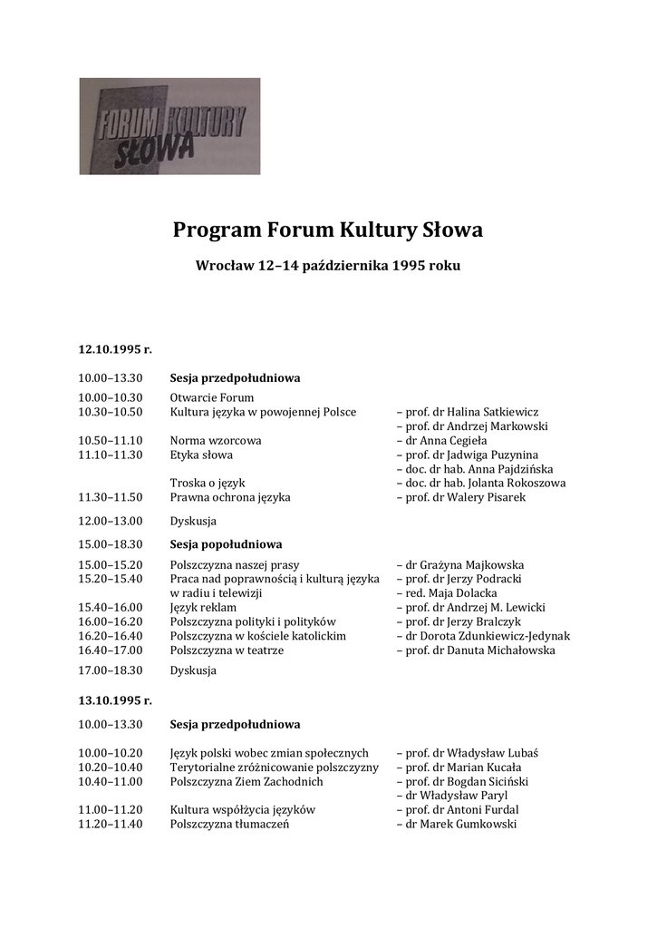 Program Forum Kultury Słowa Wrocław 12–14 października 1995 roku 12.10.1995 r. 10.00–13.30 Sesja przedpołudniowa 10.00–10.30 10.30–10.50 Otwarcie Forum Kultura języka w powojennej Polsce 10.50–11.10 11.10–11.30 Norma wzorcowa Etyka słowa 11.30–11.50 Troska o język Prawna ochrona języka 12.00–13.00 Dyskusja 15.00–18.30 Sesja popołudniowa 15.00–15.20 15.20–15.40 15.40–16.00 16.00–16.20 16.20–16.40 16.40–17.00 Polszczyzna naszej prasy Praca nad poprawnością i kulturą języka w radiu i telewizji Język reklam Polszczyzna polityki i polityków Polszczyzna w kościele katolickim Polszczyzna w teatrze 17.00–18.30 Dyskusja – prof. dr Halina Satkiewicz – prof. dr Andrzej Markowski – dr Anna Cegieła – prof. dr Jadwiga Puzynina – doc. dr hab. Anna Pajdzińska – doc. dr hab. Jolanta Rokoszowa – prof. dr Walery Pisarek – dr Grażyna Majkowska – prof. dr Jerzy Podracki – red. Maja Dolacka – prof. dr Andrzej M. Lewicki – prof. dr Jerzy Bralczyk – dr Dorota Zdunkiewicz-Jedynak – prof. dr Danuta Michałowska 13.10.1995 r. 10.00–13.30 Sesja przedpołudniowa 10.00–10.20 10.20–10.40 10.40–11.00 Język polski wobec zmian społecznych Terytorialne zróżnicowanie polszczyzny Polszczyzna Ziem Zachodnich 11.00–11.20 11.20–11.40 Kultura współżycia języków Polszczyzna tłumaczeń – prof. dr Władysław Lubaś – prof. dr Marian Kucała – prof. dr Bogdan Siciński – dr Władysław Paryl – prof. dr Antoni Furdal – dr Marek Gumkowski 12.00–13.30 Dyskusja 15.00–18.30 Sesja popołudniowa Dyskusja panelowa o stanie współczesnej polszczyzny. Prowadzi – Jan Miodek. Uczestniczą: Jan Doroszewski, Michał Głowiński, Andrzej Piotrowski, Andrzej Wróblewski-Ibis. 14.10.1995 r. 10.00–14.00 10.00–10.20 10.20–10.40 10.40–11.00 11.00–11.20 11.20–11.40 11.40–14.00 Sesja Kultura nazewnictwa Kultura języka w zakresie słowotwórstwa Język nauki i techniki Polszczyzna w szkole Język subkultur młodzieżowych Dyskusja i podsumowanie obrad – prof. dr Kazimierz Rymut – prof. dr Bogusław Kreja – prof. dr Stanisław Gajda – prof. dr Franciszek Nieckula – prof. dr Halina Zgółkowa
