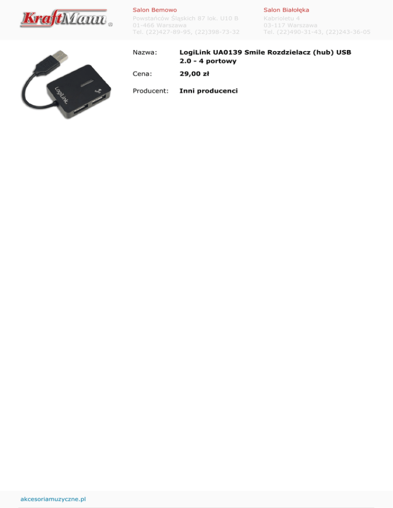 akcesoriamuzyczne.pl Salon Bemowo Salon Białołęka Powstańców Śląskich 87 lok. U10 B 01-466 Warszawa Tel. (22)427-89-95, (22)398-73-32 Kabrioletu 4 03-117 Warszawa Tel. (22)490-31-43, (22)243-36-05 Nazwa: LogiLink UA0139 Smile Rozdzielacz (hub) USB 2.0 - 4 portowy Cena: 29,00 zł Producent: Inni producenci